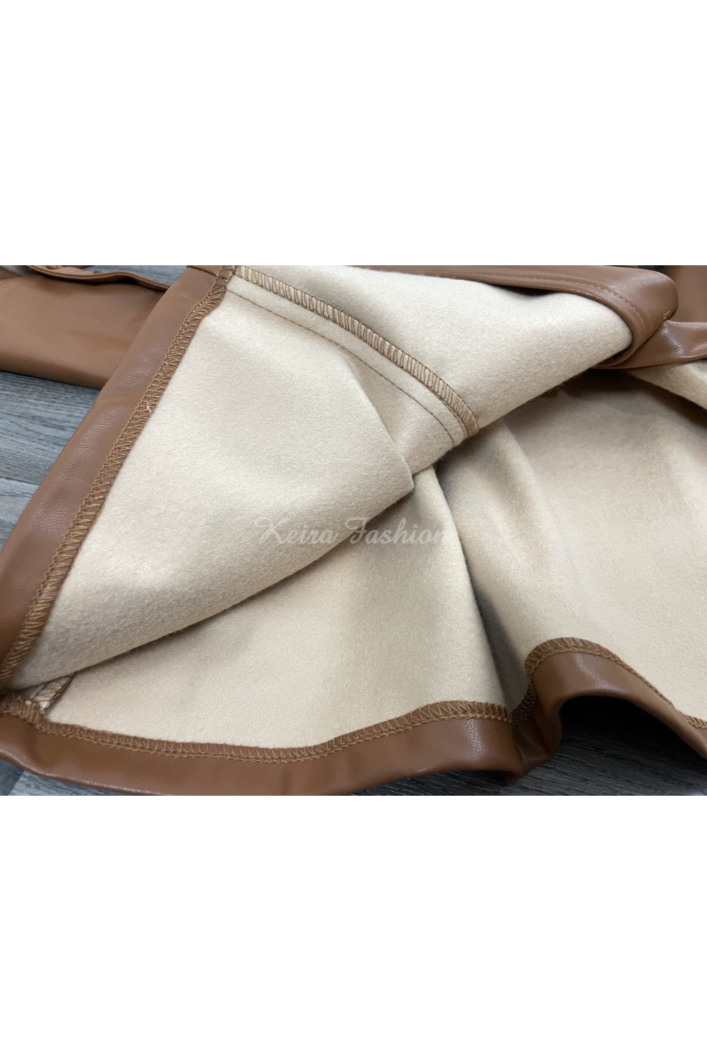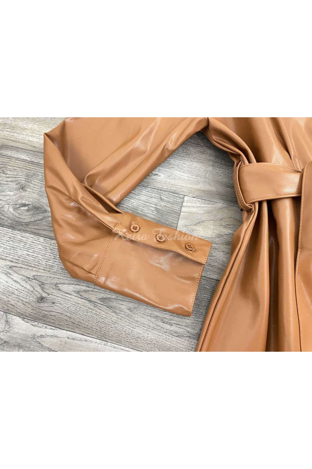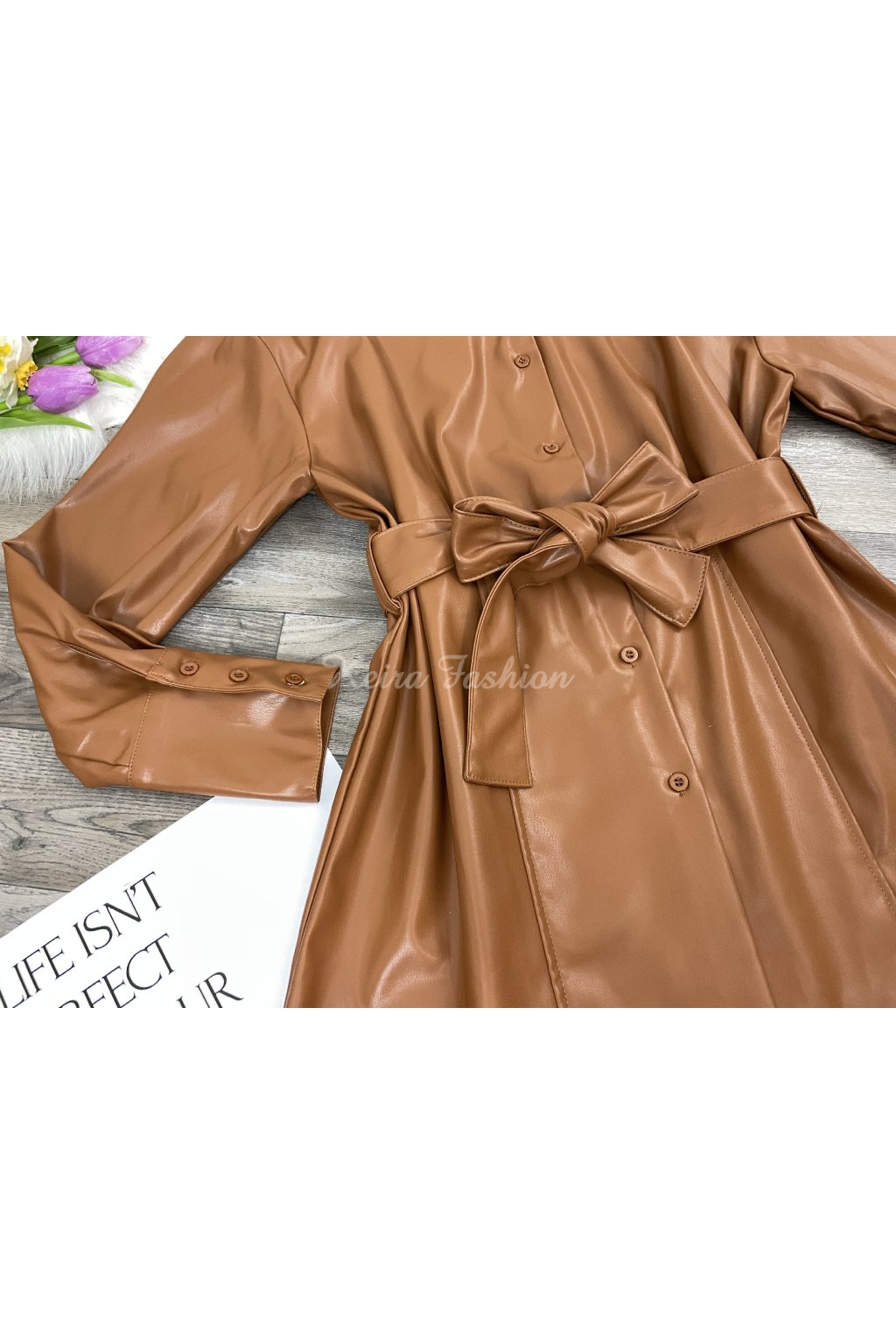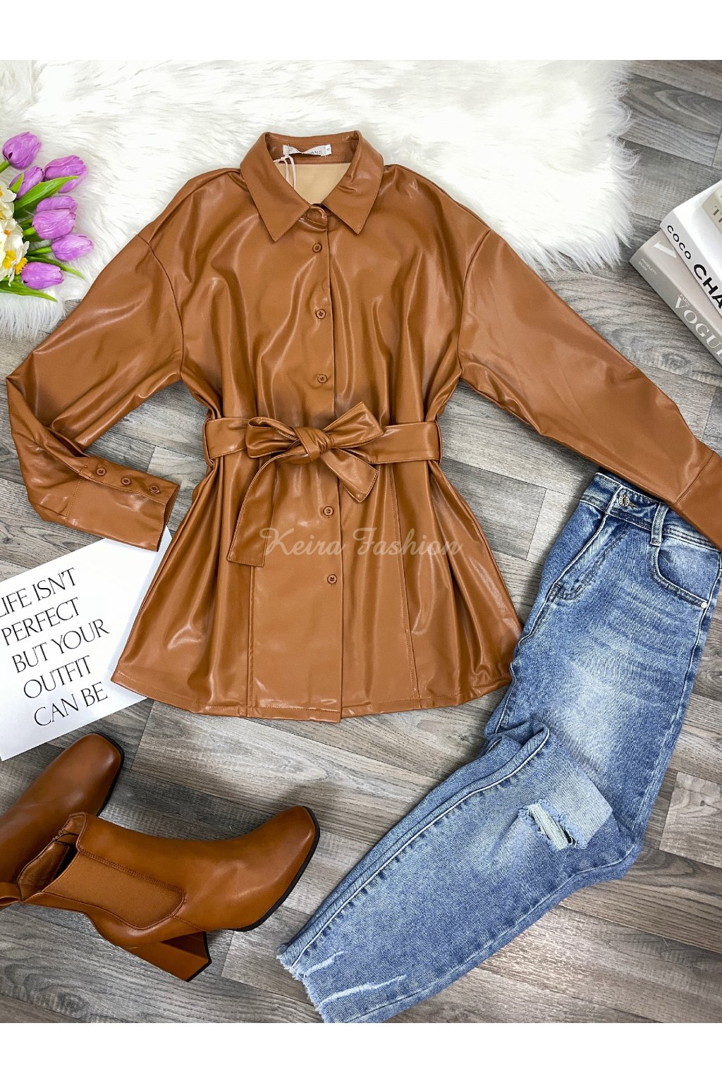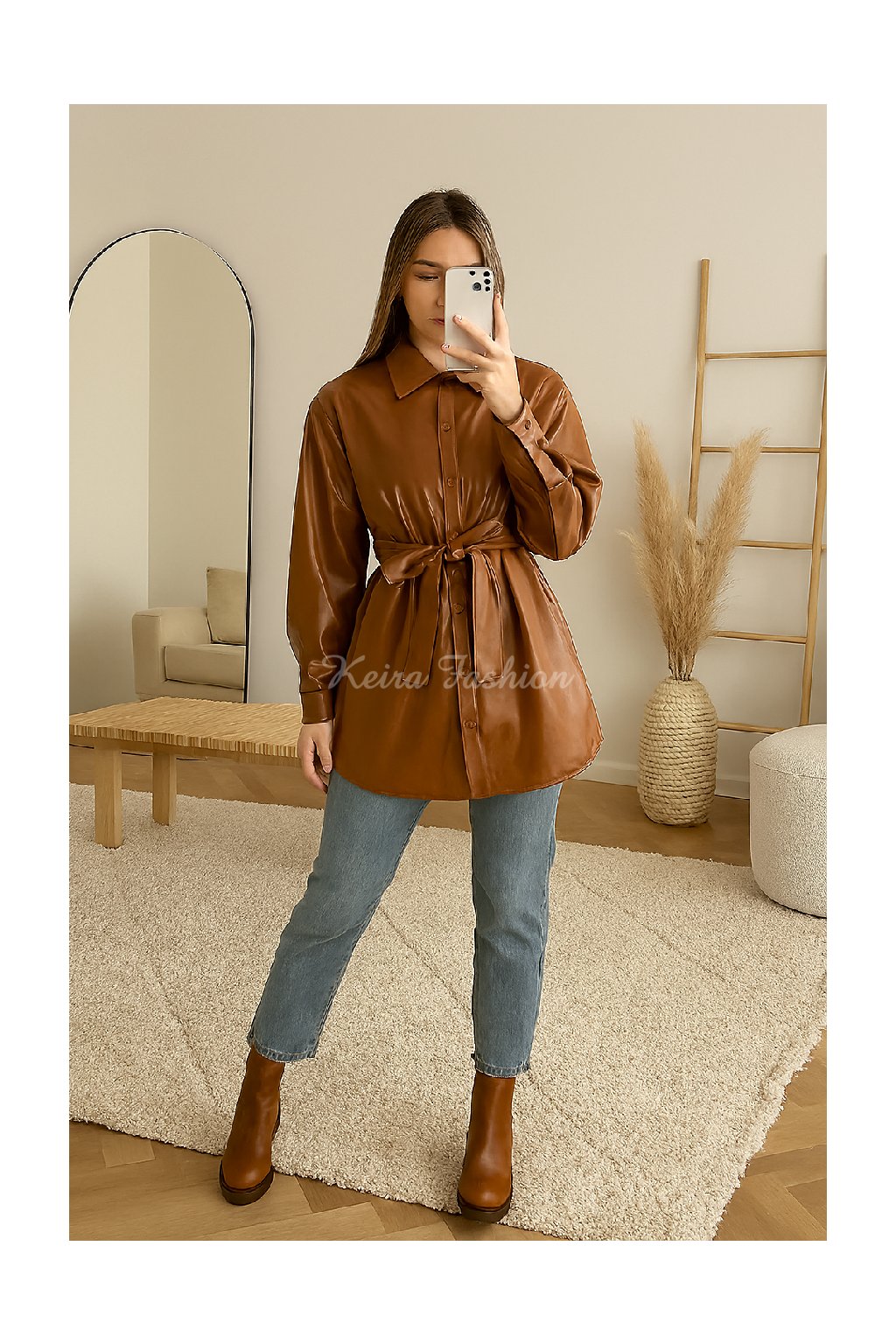 Štýlová dámska hnedá koženková košeľa s opaskom, vyrobená z kvalitnej eko kože, ktorá je jemná na dotyk a príjemná na nosenie. Mierne zateplenie poskytuje pohodlie aj počas chladnejších dní. Košeľa má klasický golier, zapínanie na gombíky a praktický opasok, ktorý si môžete zaviazať podľa vlastného štýlu – na mašľu, uzol alebo voľne. Perfektná voľba k rifliam aj sukniam, ideálna na jesenné a zimné prechádzky, do práce či na večerné stretnutia.