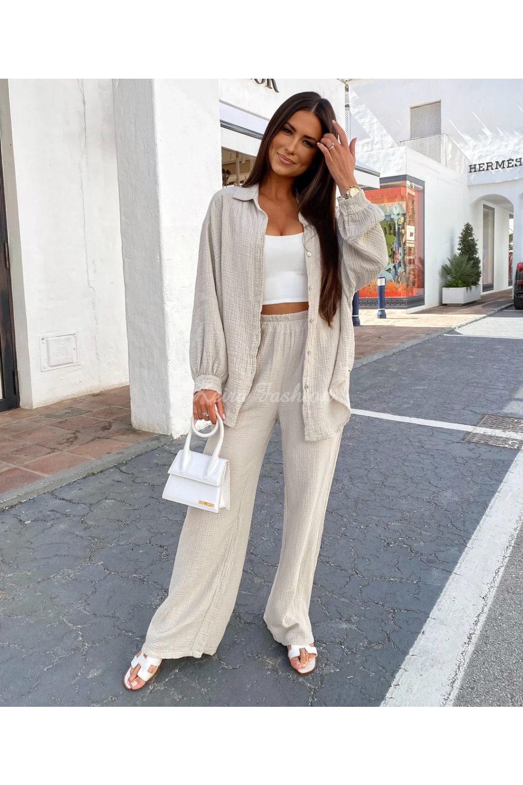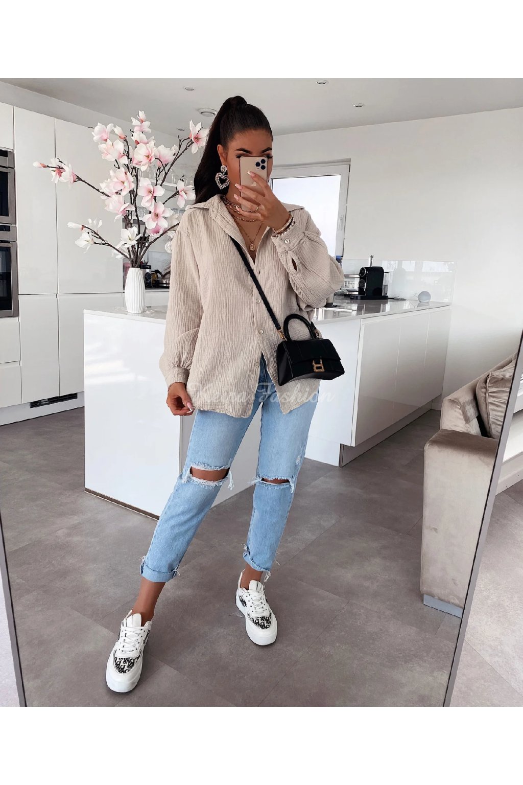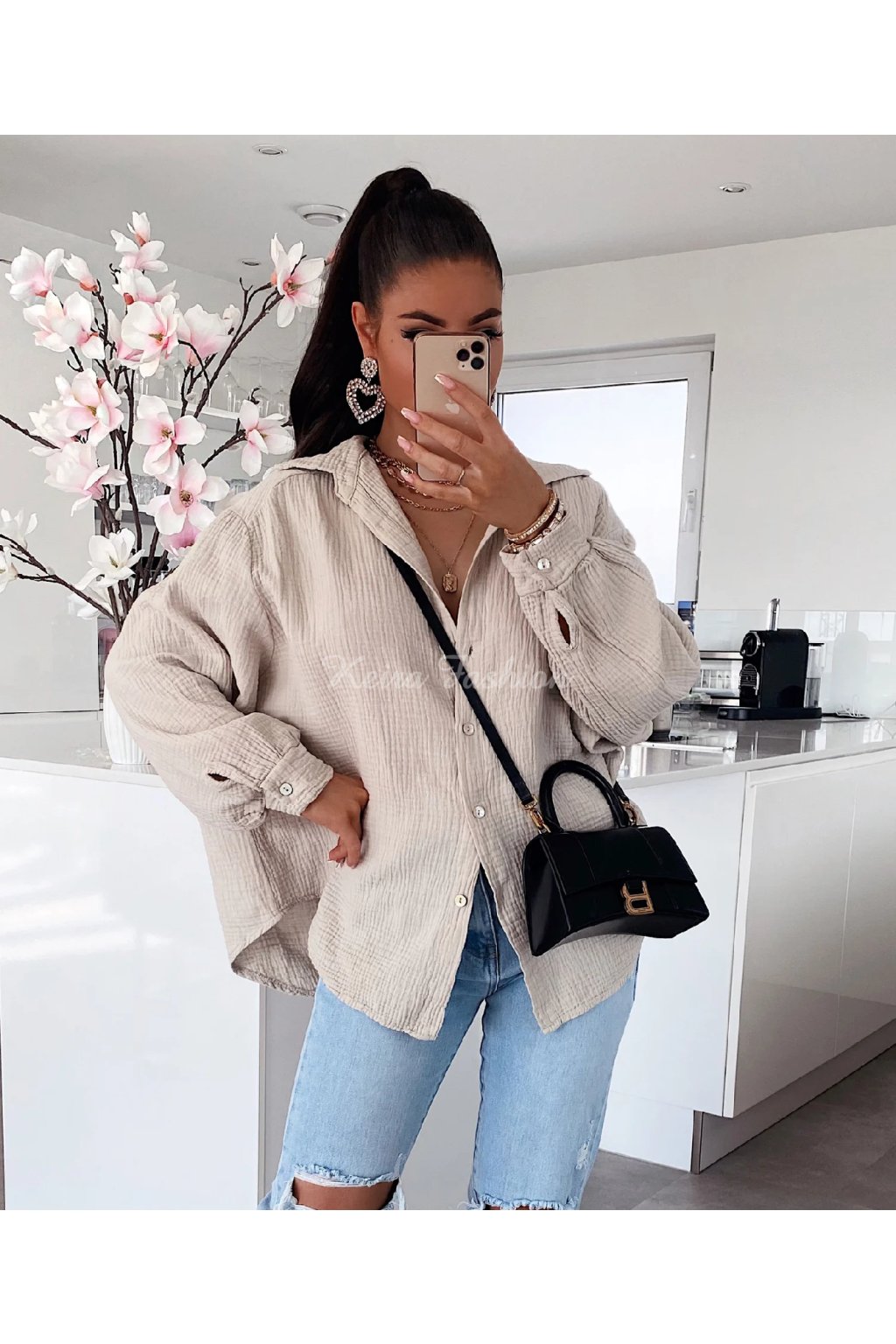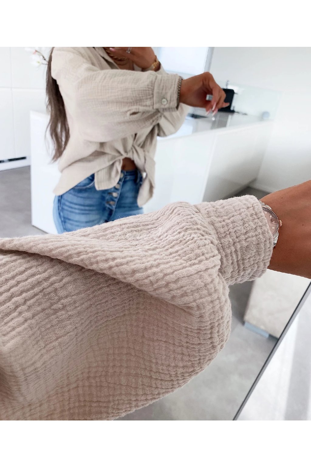 Táto béžová mušelinová košeľa voľnejšieho strihu je stelesnením pohodlia, štýlu a všestrannosti. Vyrobená zo 100% bavlny, je mimoriadne vzdušná, príjemná a ideálná na teplé dni. Oversized strih s gombíkovým zapínaním pôsobí uvoľnene a ponúka maximálne pohodlie. Vďaka neutrálnemu odtieňu a nadčasovému strihu je tento ideálna na dovolenku, pláž, výlety, mestský štýl aj domáce pohodlie. Vyrobená v Európe.