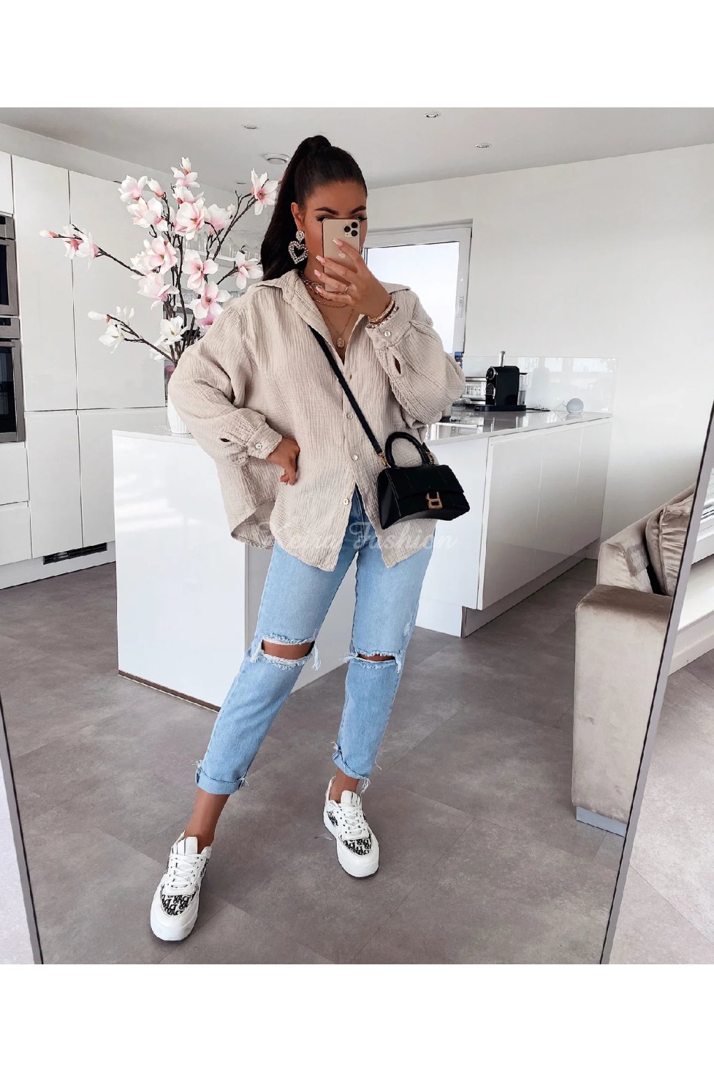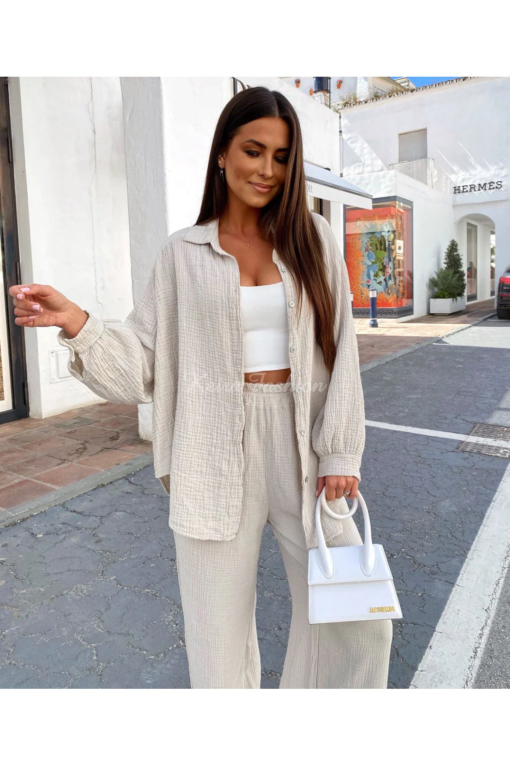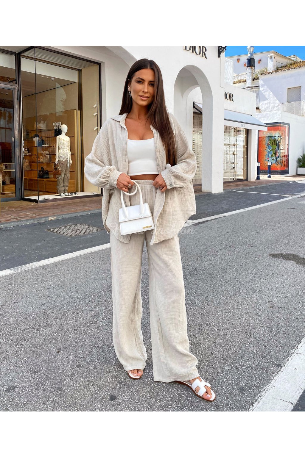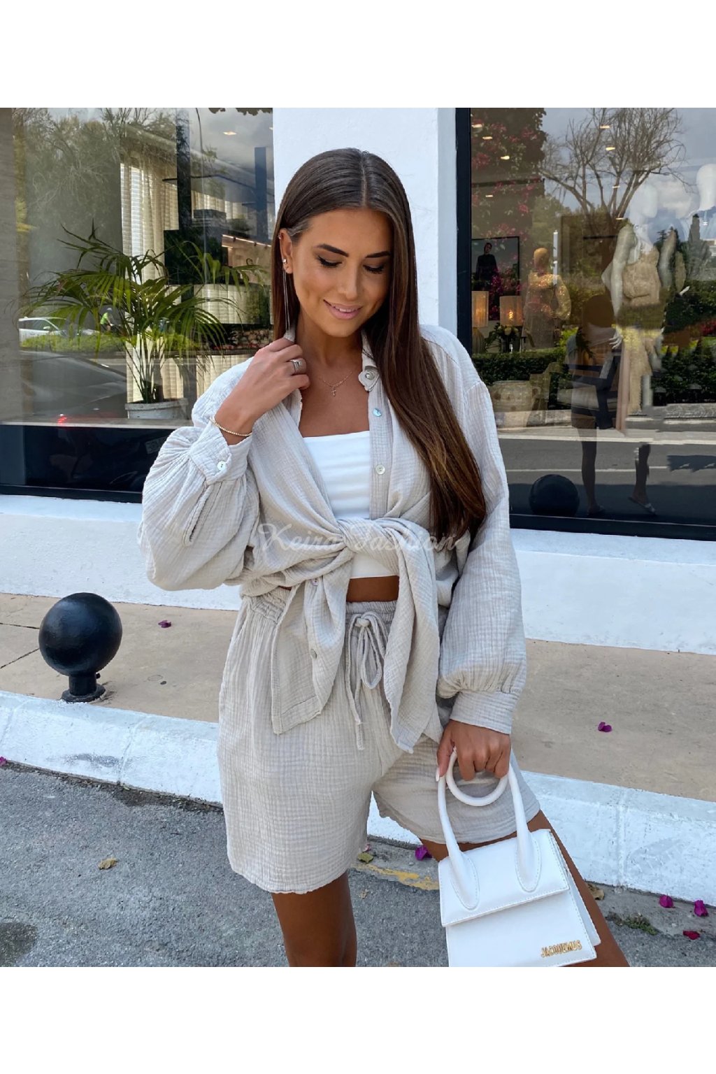Táto béžová mušelinová košeľa voľnejšieho strihu je stelesnením pohodlia, štýlu a všestrannosti. Vyrobená zo 100% bavlny, je mimoriadne vzdušná, príjemná a ideálná na teplé dni. Oversized strih s gombíkovým zapínaním pôsobí uvoľnene a ponúka maximálne pohodlie. Vďaka neutrálnemu odtieňu a nadčasovému strihu je tento ideálna na dovolenku, pláž, výlety, mestský štýl aj domáce pohodlie. Vyrobená v Európe.
