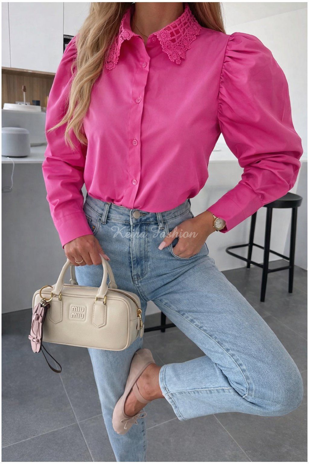 Táto ružová blúzka s čipkovaným golierom je dokonalým spojením elegancie a hravosti. Jemne nariasené rukávy vytvárajú ženský siluetový efekt, zatiaľ čo výrazná farba dodáva energiu každému outfitu. Blúzka je vyrobená z príjemného, vzdušného materiálu, ktorý sa pohodlne nosí počas celého dňa. Vďaka klasickému zapínaniu na gombíky ju ľahko skombinujete s džínsami, elegantnými nohavicami alebo sukňou. Ideálna voľba pre ženy, ktoré milujú štýl, detail a farbu.