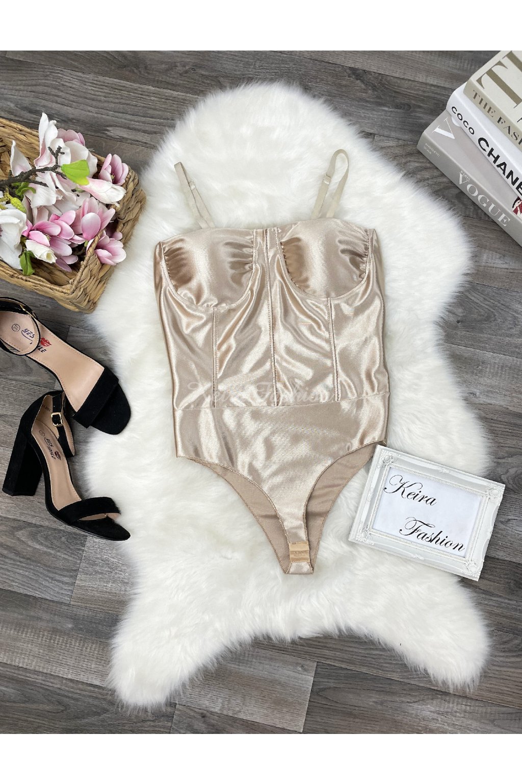 Elegantné saténové body v svetlo-béžovej farbe je dokonalým kúskom pre ženy, ktoré milujú zvodný a luxusný štýl. Vďaka vystuženým košíkom krásne formuje dekolt a nastaviteľné ramienka sa postarajú o pohodlné nosenie. Zapínanie v rozkroku je riešené praktickými háčikmi. Materiál nie je veľmi elastický, preto odporúčame dbať na správny výber veľkosti. Body je ideálne pre konfekčné veľkosti XS a S, neodporúčame na vyššie postavy.