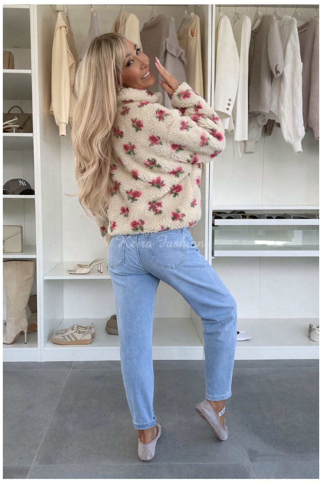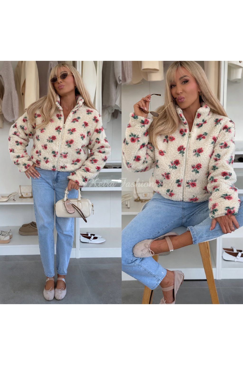 Táto krémová plyšová teddy bunda s kvetinovým vzorom je jedným z najväčších trendov sezóny. Je vyrobená z mäkkého fleecu, ktorý je príjemný na dotyk a navyše celá podšitá, takže je dostatočne teplá aj na chladnejšie dni. Ružovo‑zelené kvietky dodávajú bunde jemný, ženský a svieži vzhľad. Bunda má praktický zips, vysoký golier a pohodlný oversize strih, ktorý sa hodí na každodenné nosenie. Na bokoch má aj praktické vrecká. Krémová farba pôsobí elegantne, čisto a ľahko sa kombinuje s džínsami, legínami aj športovým outfitom.