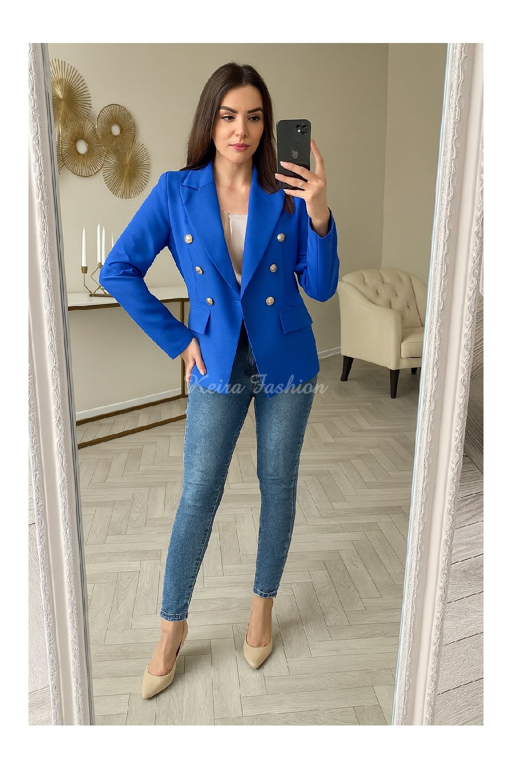 Modré dámske sako so zlatými gombíkmi. Je podšité a na ramenách má vypchávky. Materiál nie je elastický.