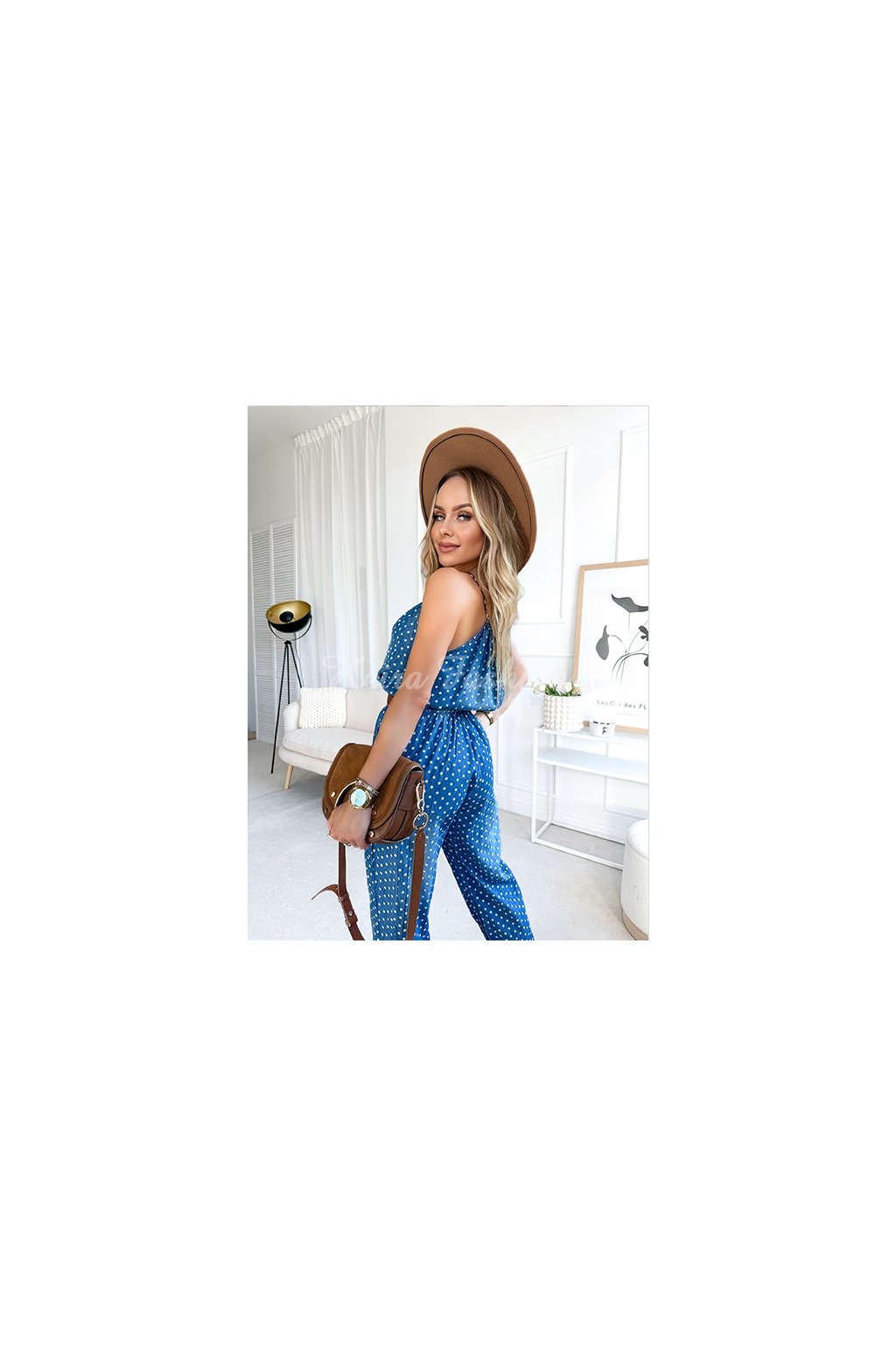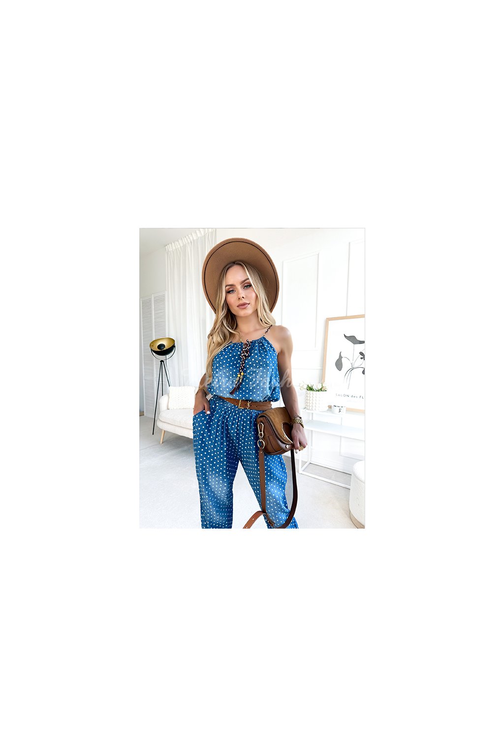 Dámsky modrý bodkovaný overal na ramienka v riflovom štýle. Ramienka sa dajú regulovať pomocou šnúrky. V páse je guma, na bokoch sú funkčné vrecká. Opasok nie je súčasťou overalu.