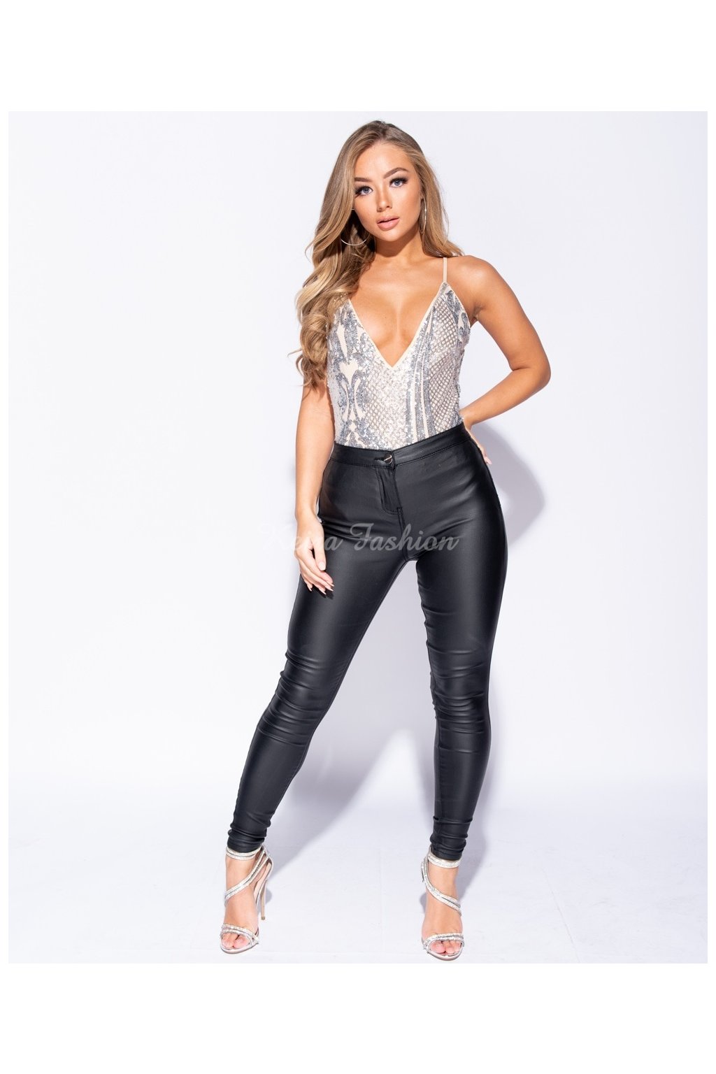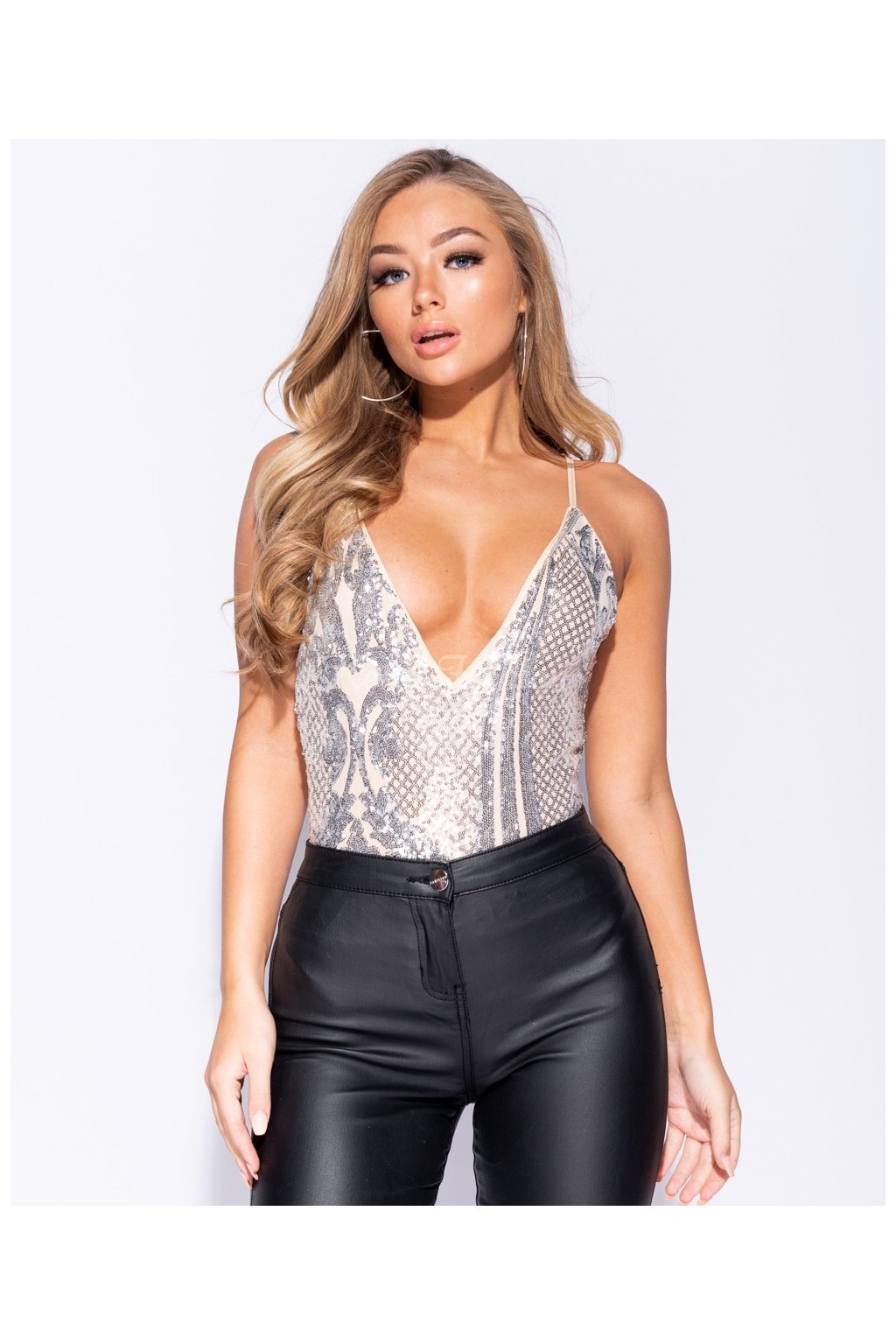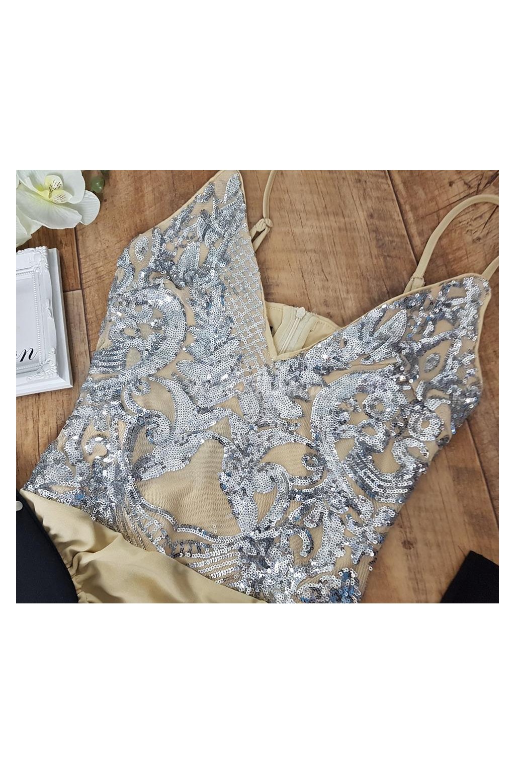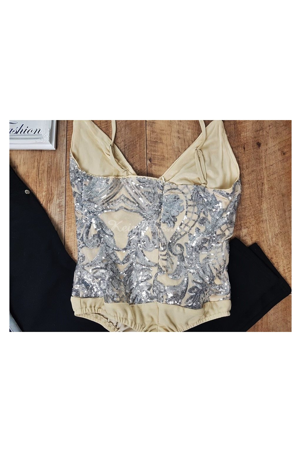Toto luxusné dámske body je ako stvorené na špeciálne príležitosti. Predná časť je bohato vyšívaná striebornými flitrami, ktoré sa nádherne lesknú a dodávajú outfitu glamour efekt. Hlboký výstrih do „V“ pôsobí zvodne, zatiaľ čo nastaviteľné ramienka zabezpečia pohodlné nosenie a perfektné prispôsobenie postave. Body má zapínanie vzadu na skrytý zips, čo zaručuje elegantný a čistý vzhľad. Spodná nohavičková časť je doplnená o pružnú gumu na okraji a praktické zapínanie na patenty, vďaka čomu je nosenie veľmi komfortné. Perfektný kúsok na párty či večerné príležitosti. ✨