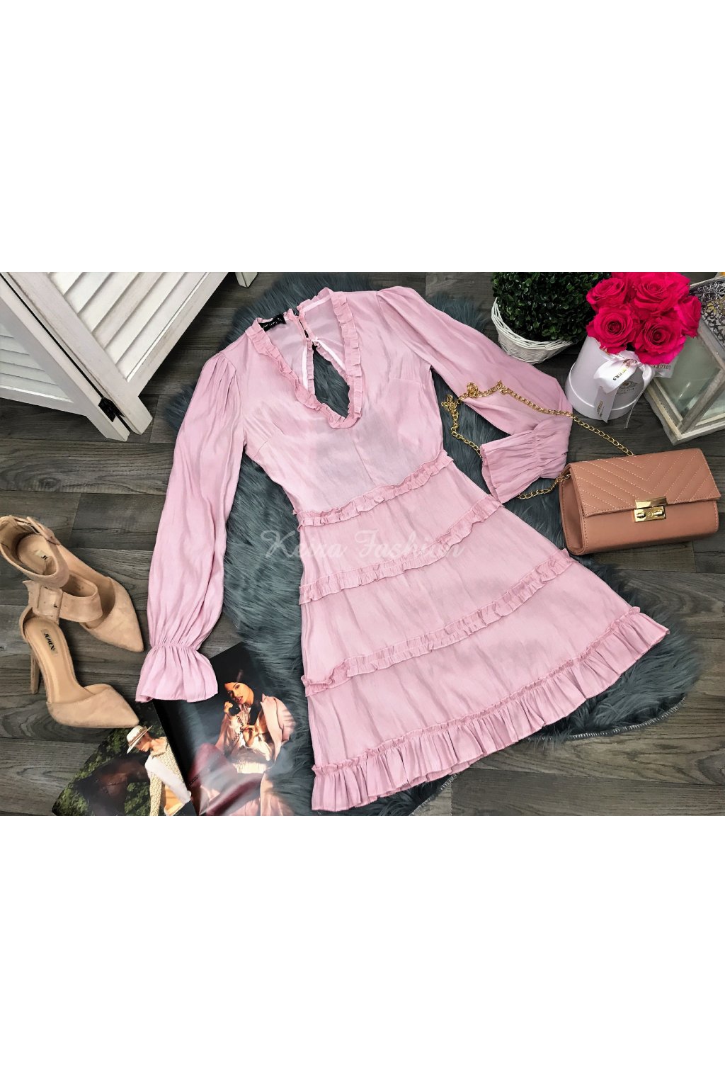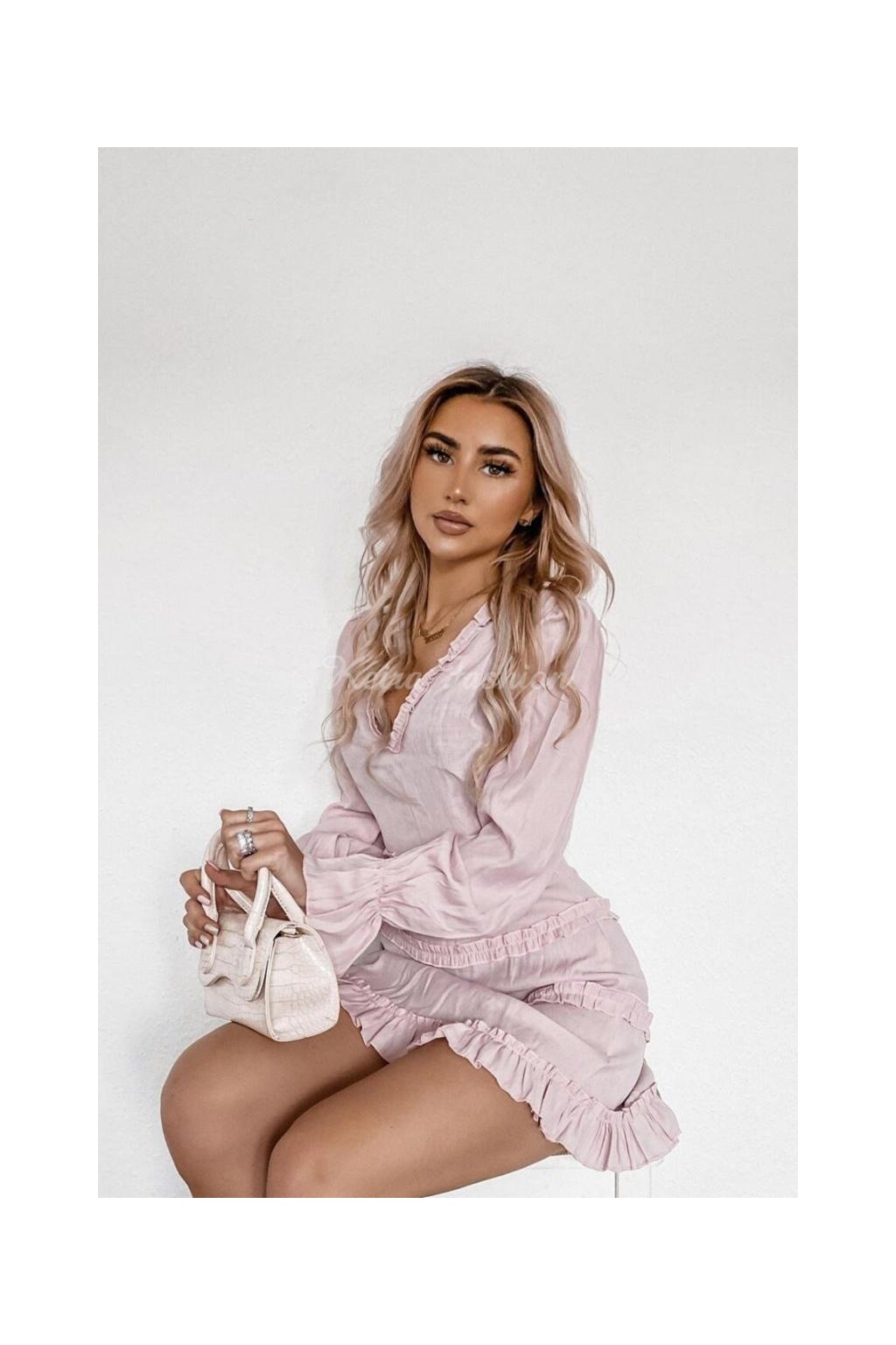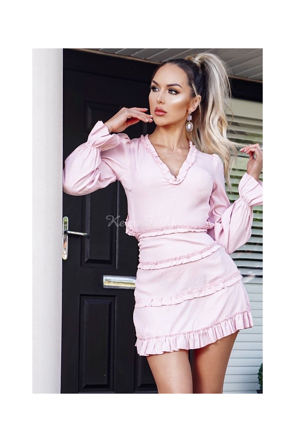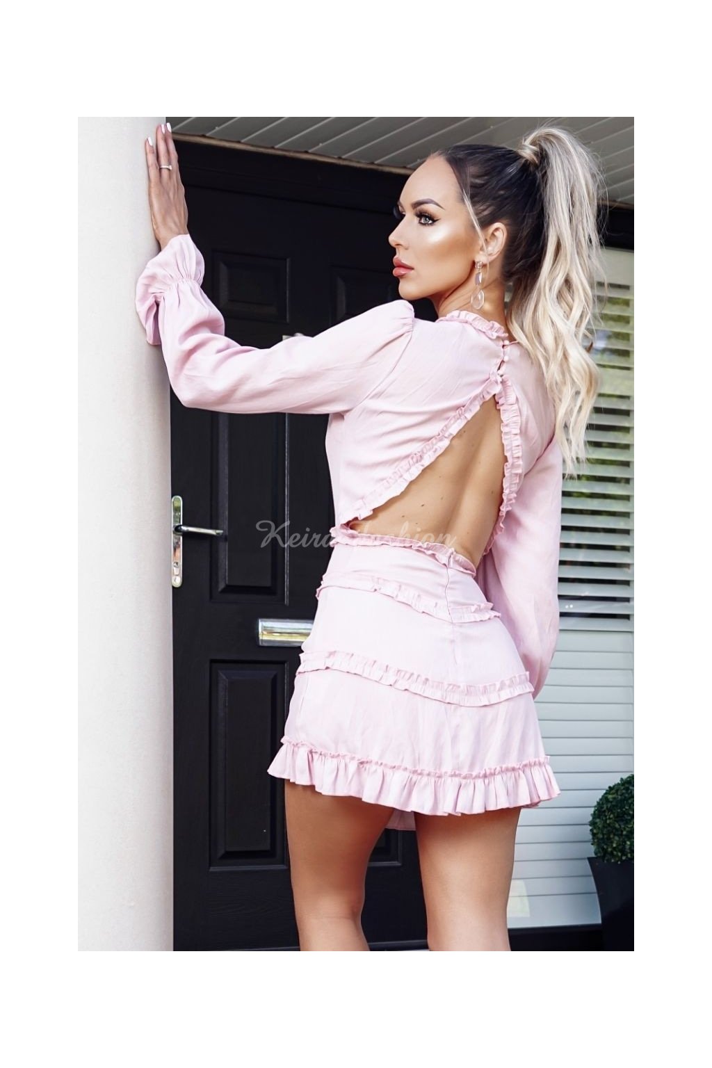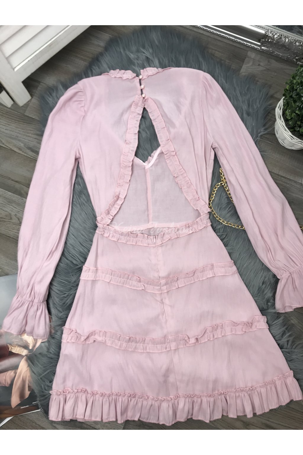 Tieto ružové mini šaty sú vyrobené z ľahkého a príjemného materiálu. Šaty majú dlhé rukávy s jemným riasením na zápästí a sú zdobené elegantnými volánikmi na dekolte, páse, sukni a rukávoch, čo im dodáva romantický a žensky nežný vzhľad. Otvorený chrbát so zapínaním na gombíky pridáva šatám dávku zmyselnosti a originality. Zapínanie vzadu na skrytý zips.