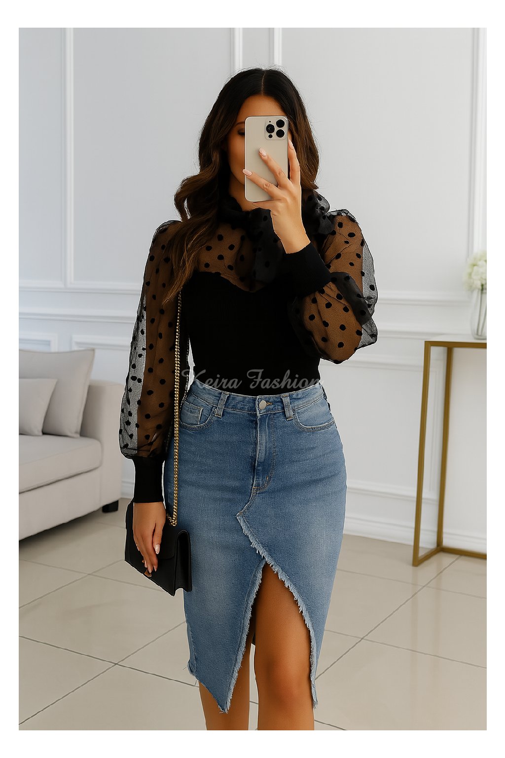 Čierny sveter s transparentnými, bodkovanými rukávmi a mašľou pri krku.