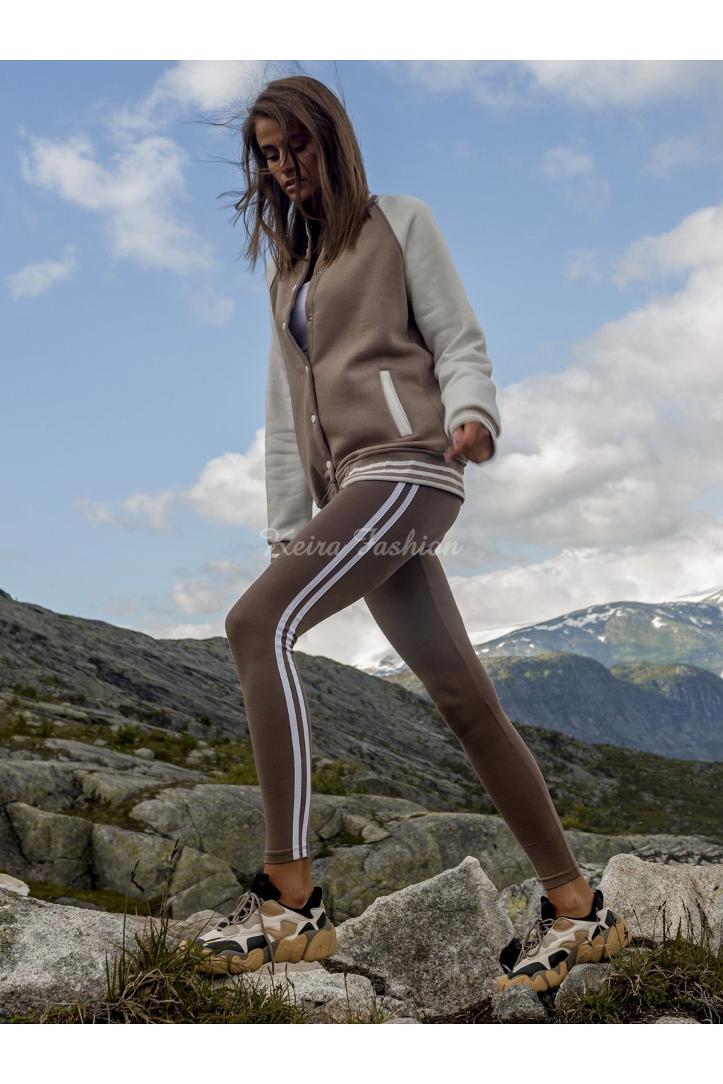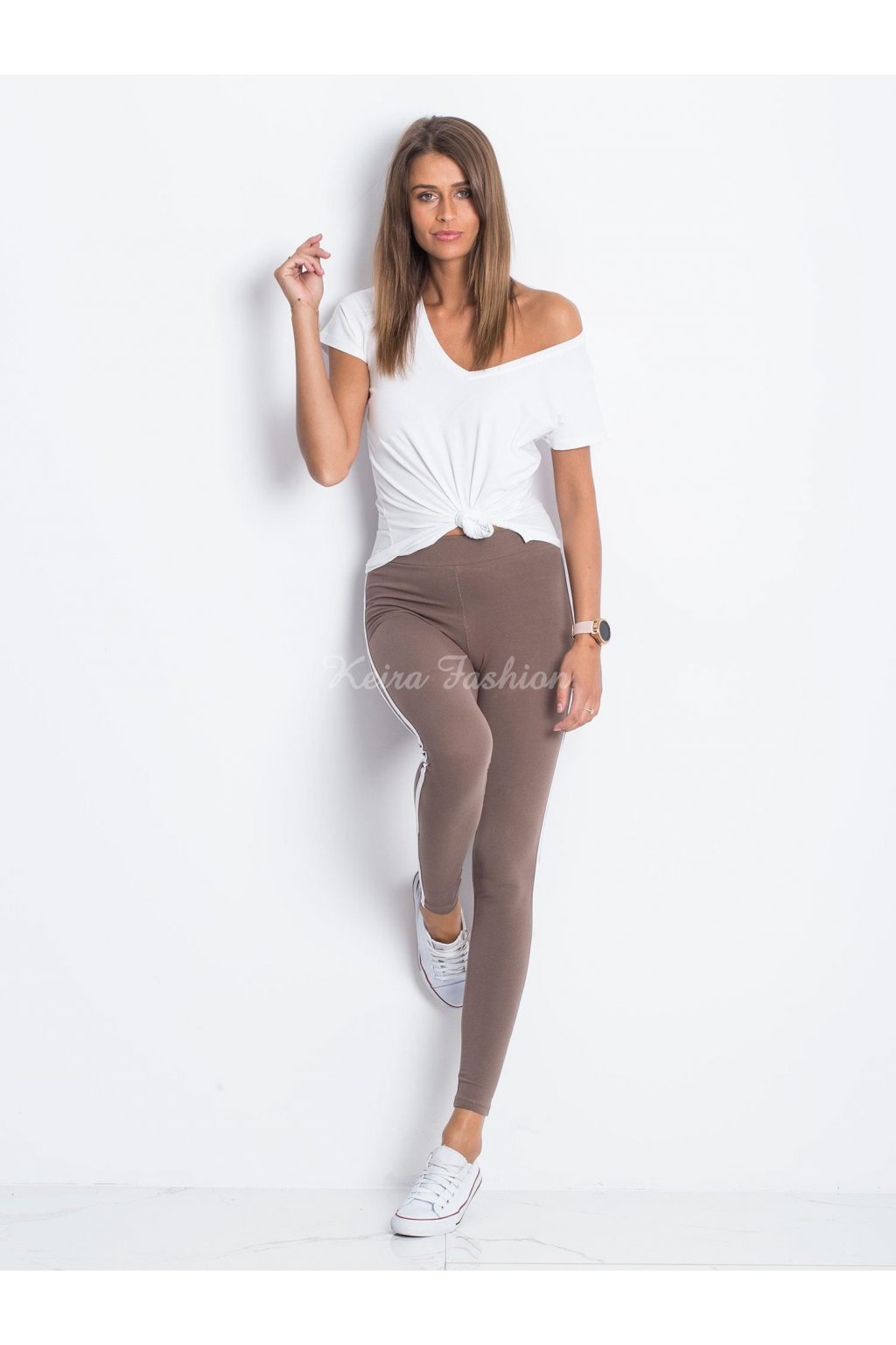 Legíny, ktoré spájajú maximálne pohodlie s moderným športovým dizajnom a sú nevyhnutným kúskom v každom dámskom šatníku. Vyrobené z kvalitného materiálu s vysokým podielom bavlny, zároveň dostatočne elastické, takže sú veľmi príjemné na nosenie. Pás legín je širší, čo poskytuje lepšiu oporu a zároveň vytvára peknú siluetu. Bočné dvojité biele prúžky dodávajú legínam dynamiku a opticky predlžujú nohy. Hnedá farba je neutrálna a ľahko kombinovateľná s rôznymi kúskami v šatníku, takže takže sú vhodné na voľný čas, športové aktivity alebo aj na doma.