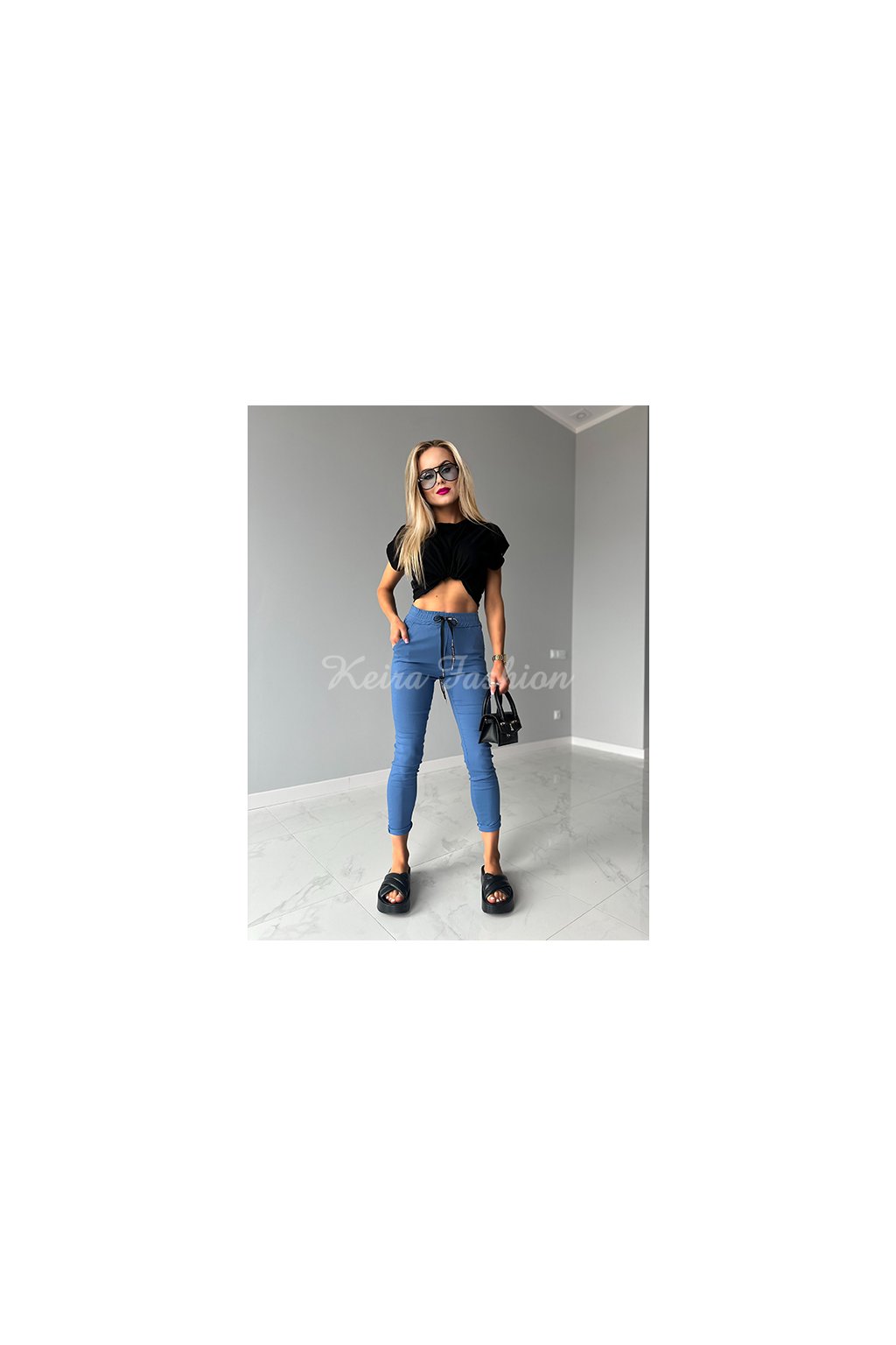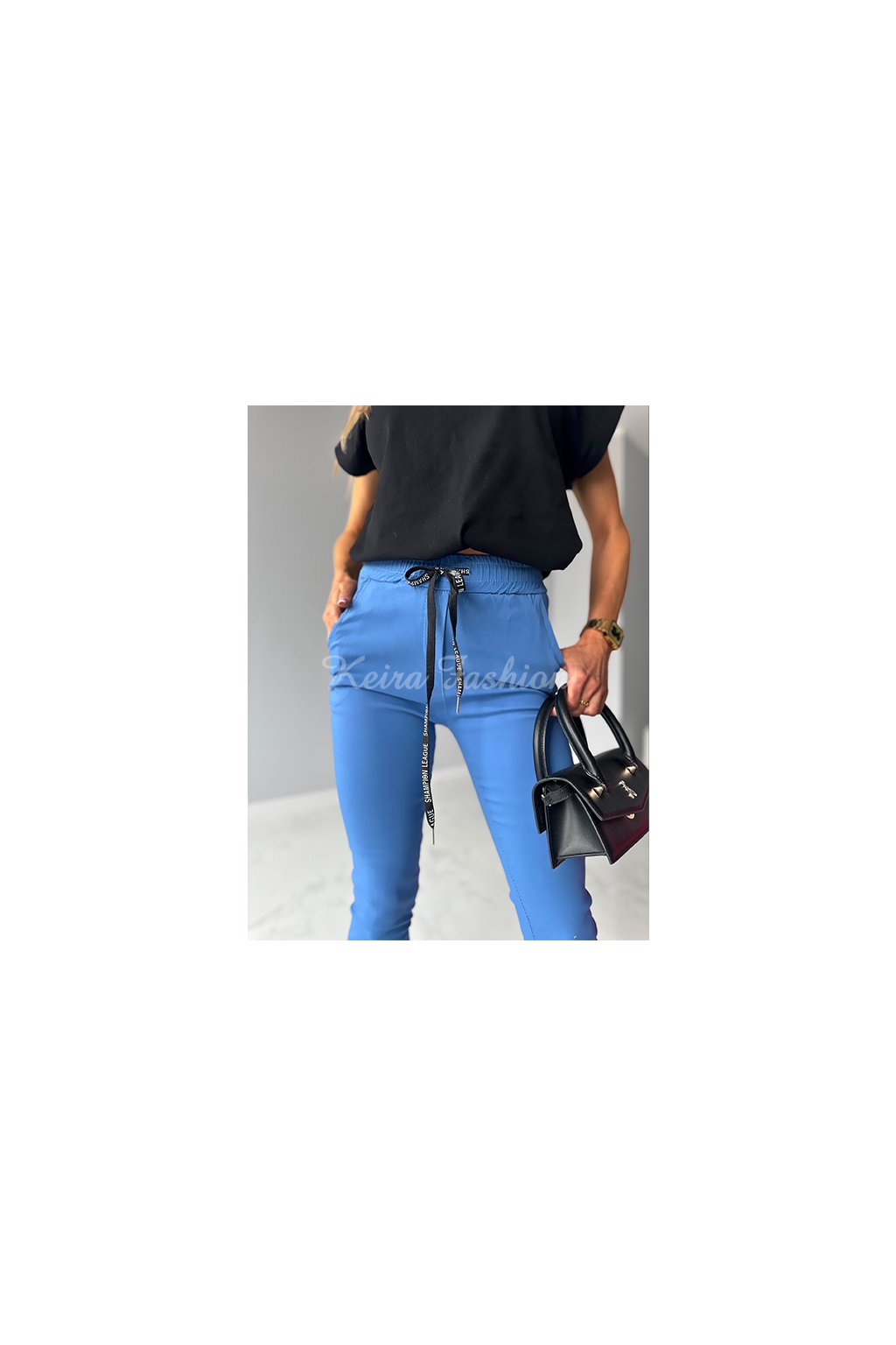 Tieto modré nohavice sú navrhnuté pre maximálne pohodlie a štýl. Vyrobené z elastického materiálu, ktorý sa prispôsobí postave bez obmedzenia pohybu, krásne ju tvaruje a zároveň pôsobí uvoľnene. V páse sa nachádza guma so šnúrkou, vďaka ktorej si nohavice nastavíš presne podľa seba – bez tlačenia či posúvania. Bočné vrecká sú praktické a nenápadne zapracované do dizajnu.
