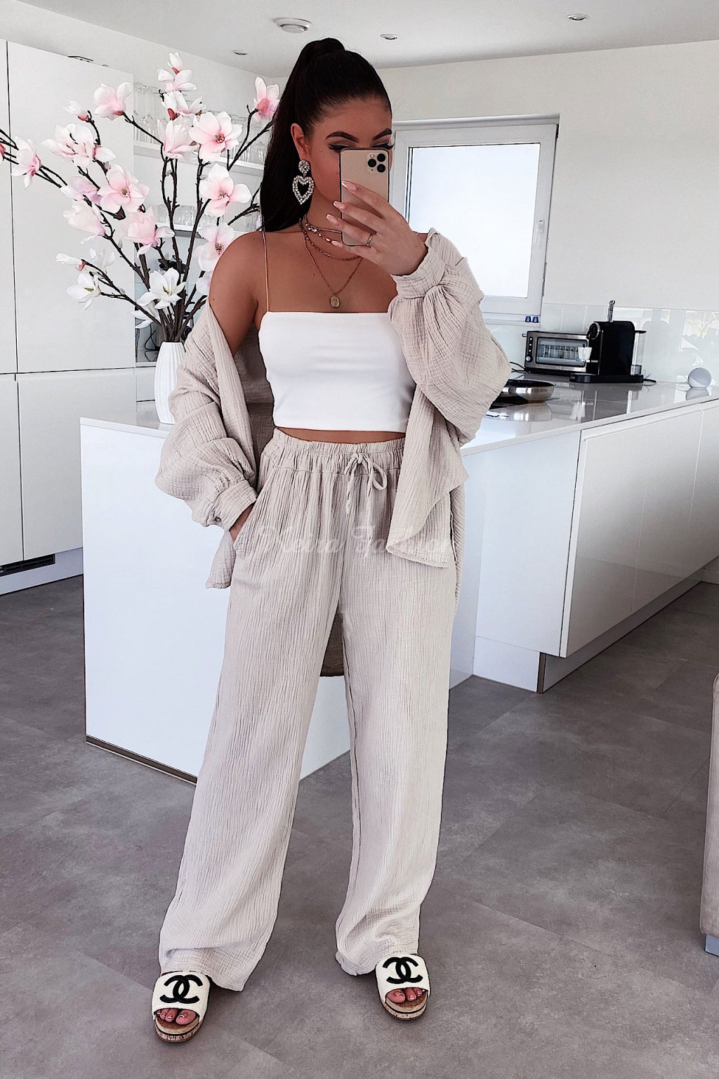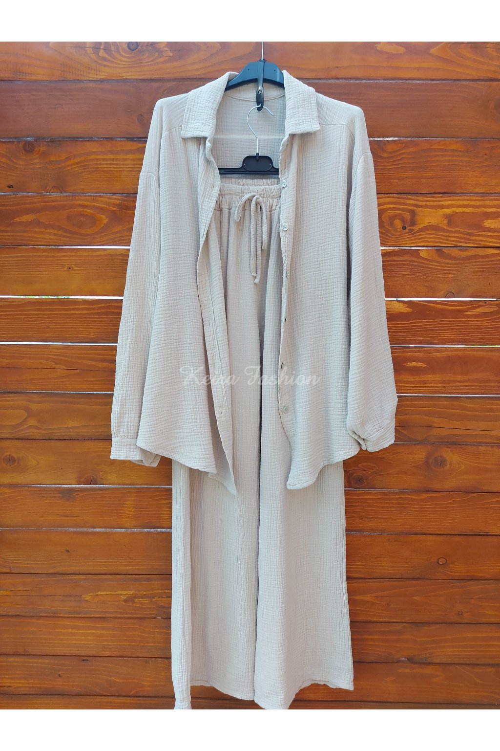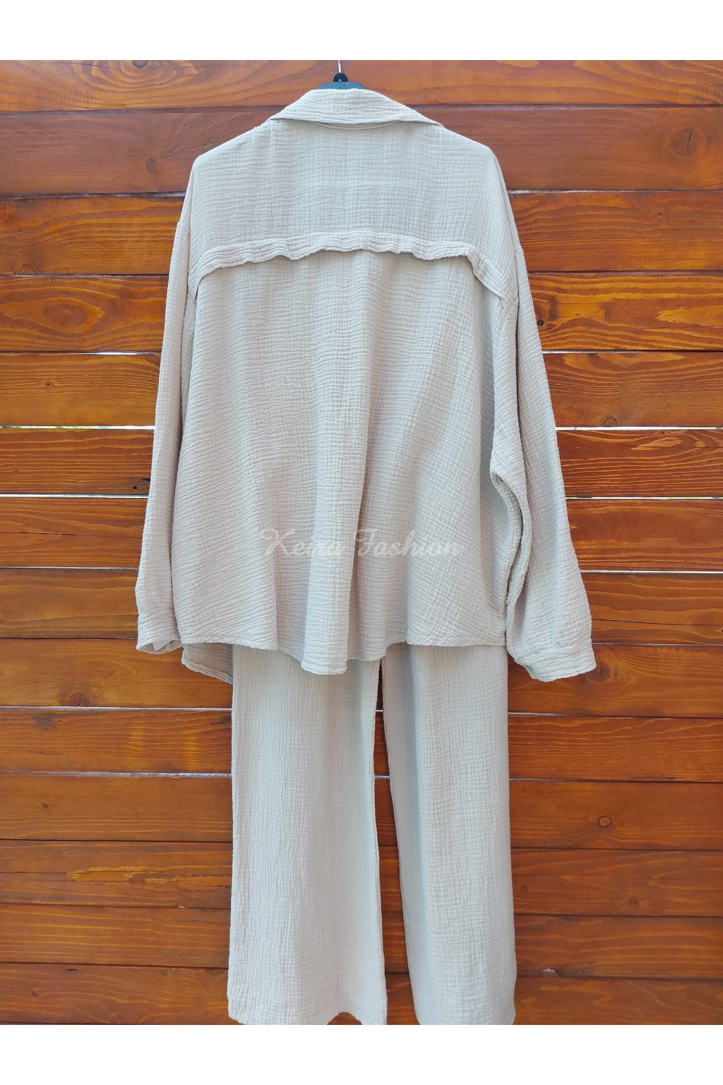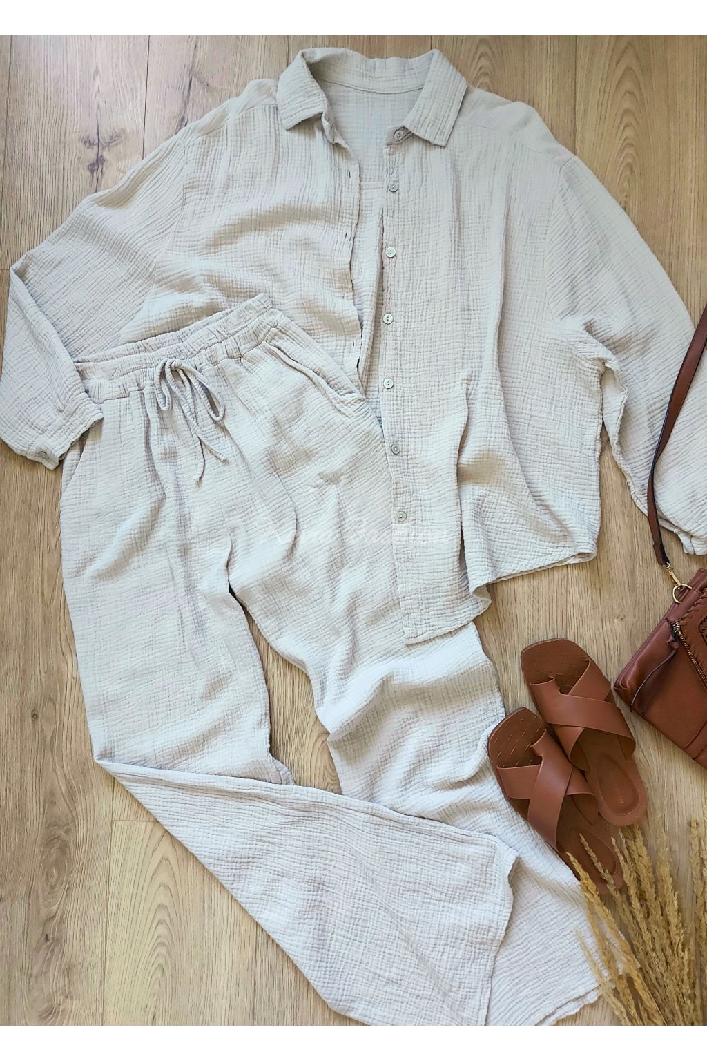 Tento béžový mušelinový komplet je stelesnením pohodlia, štýlu a všestrannosti. Vyrobený zo 100% bavlny, je mimoriadne vzdušný, príjemný a ideálny na teplé dni. Oversized košeľa s gombíkovým zapínaním pôsobí uvoľnene a elegantne, zatiaľ čo široké nohavice s gumou v páse a praktickými vreckami ponúkajú maximálne pohodlie. Komplet môžeš nosiť spolu ako zladený outfit, alebo si ho rozdeliť – košeľu skombinovať s rifľami, nohavice s tielkom či crop topom. Vďaka neutrálnemu odtieňu a nadčasovému strihu je tento set ideálny na dovolenku, pláž, výlety, mestský štýl aj domáce pohodlie. Vyrobený v Európe.