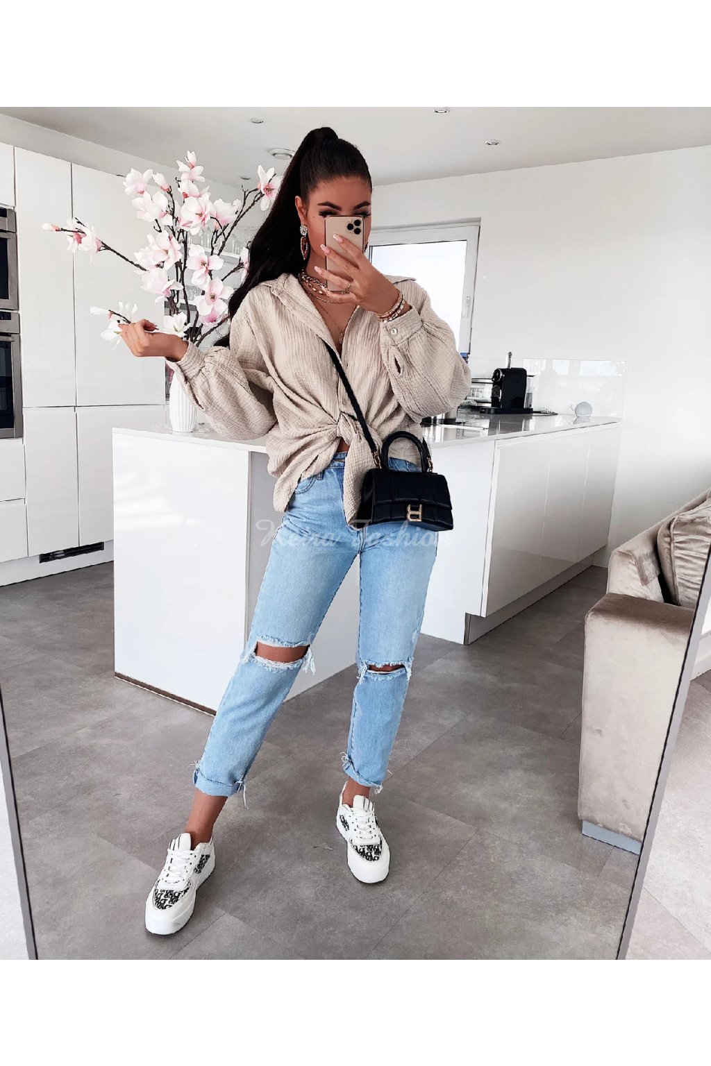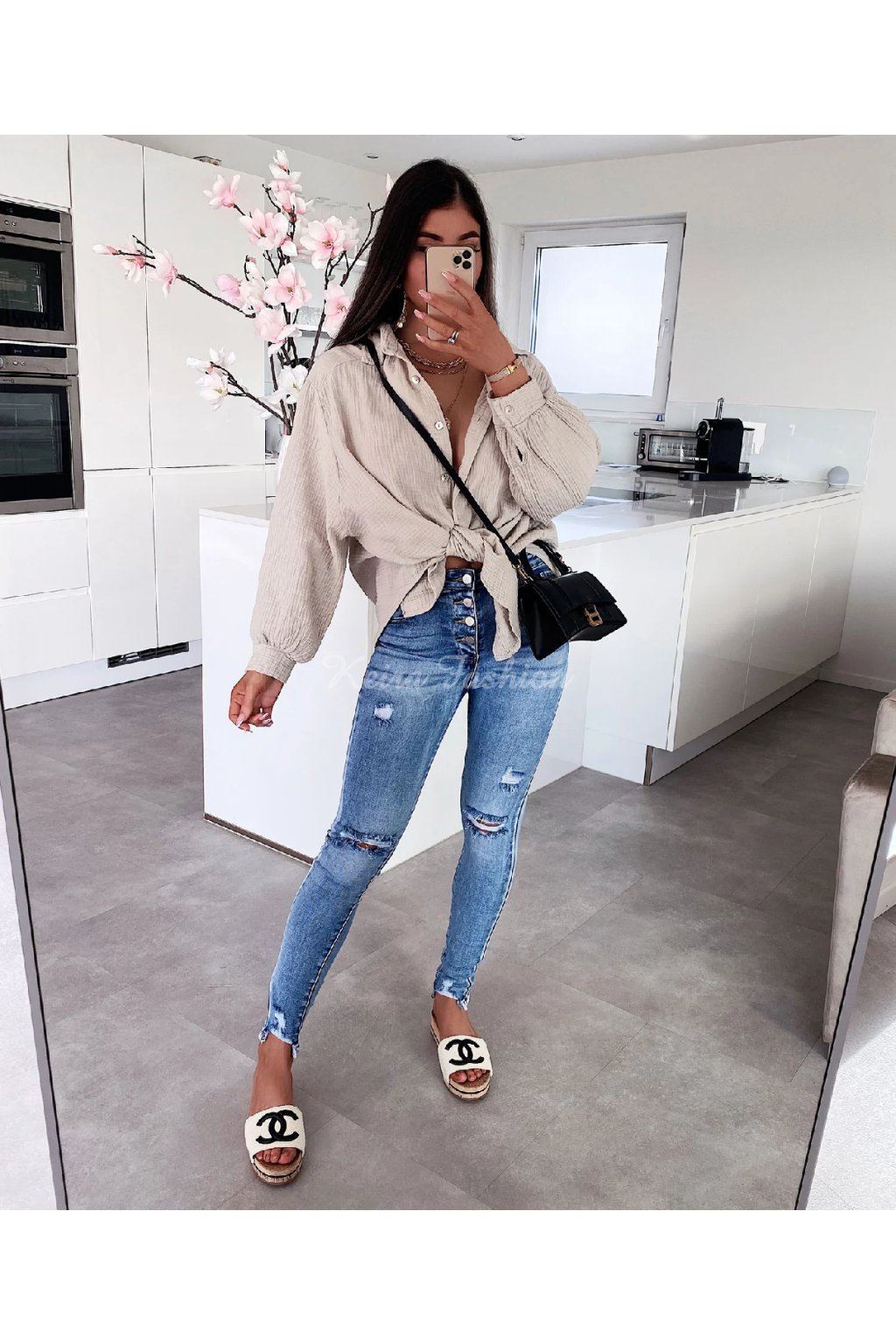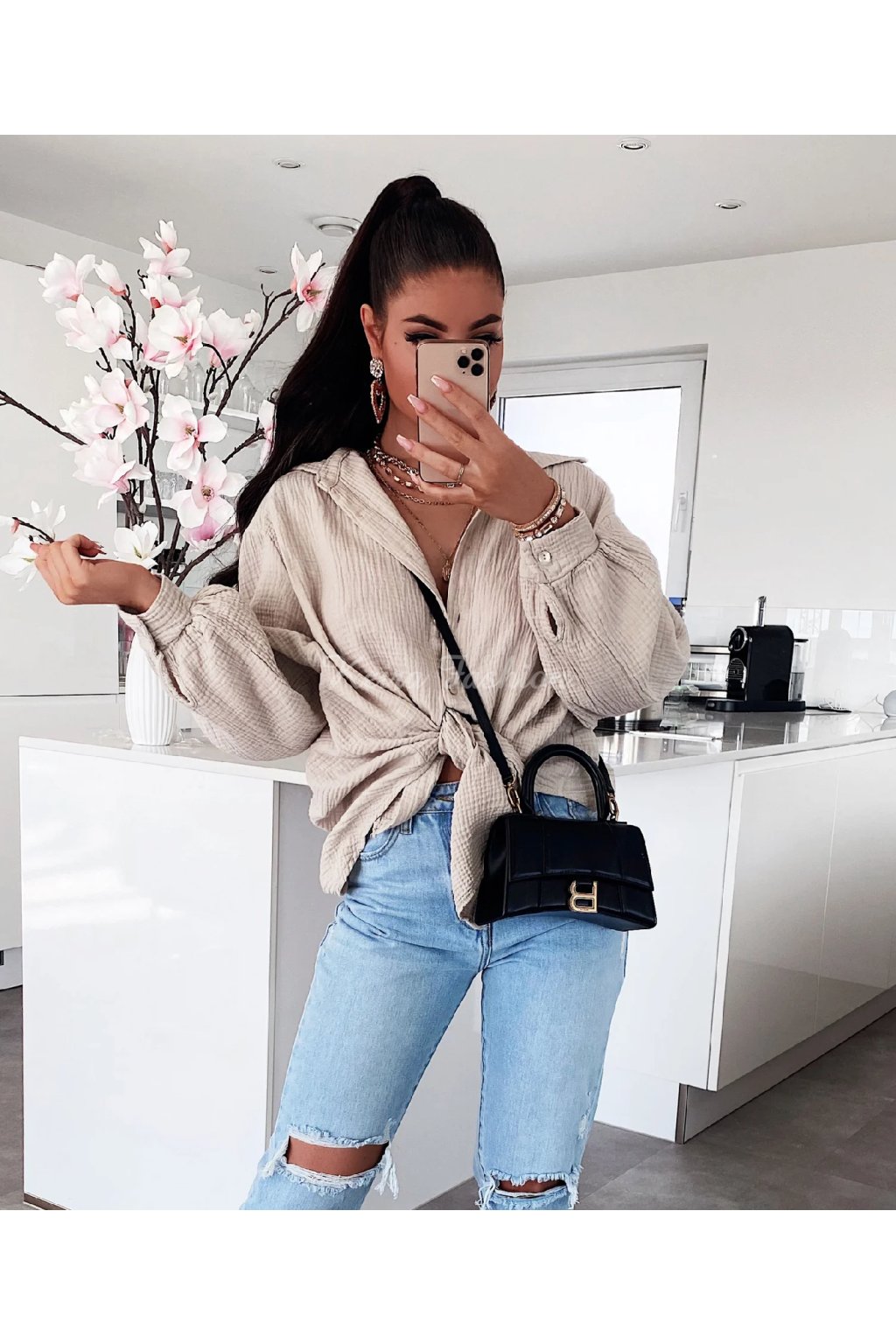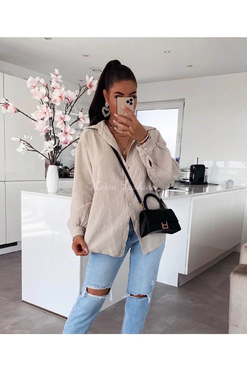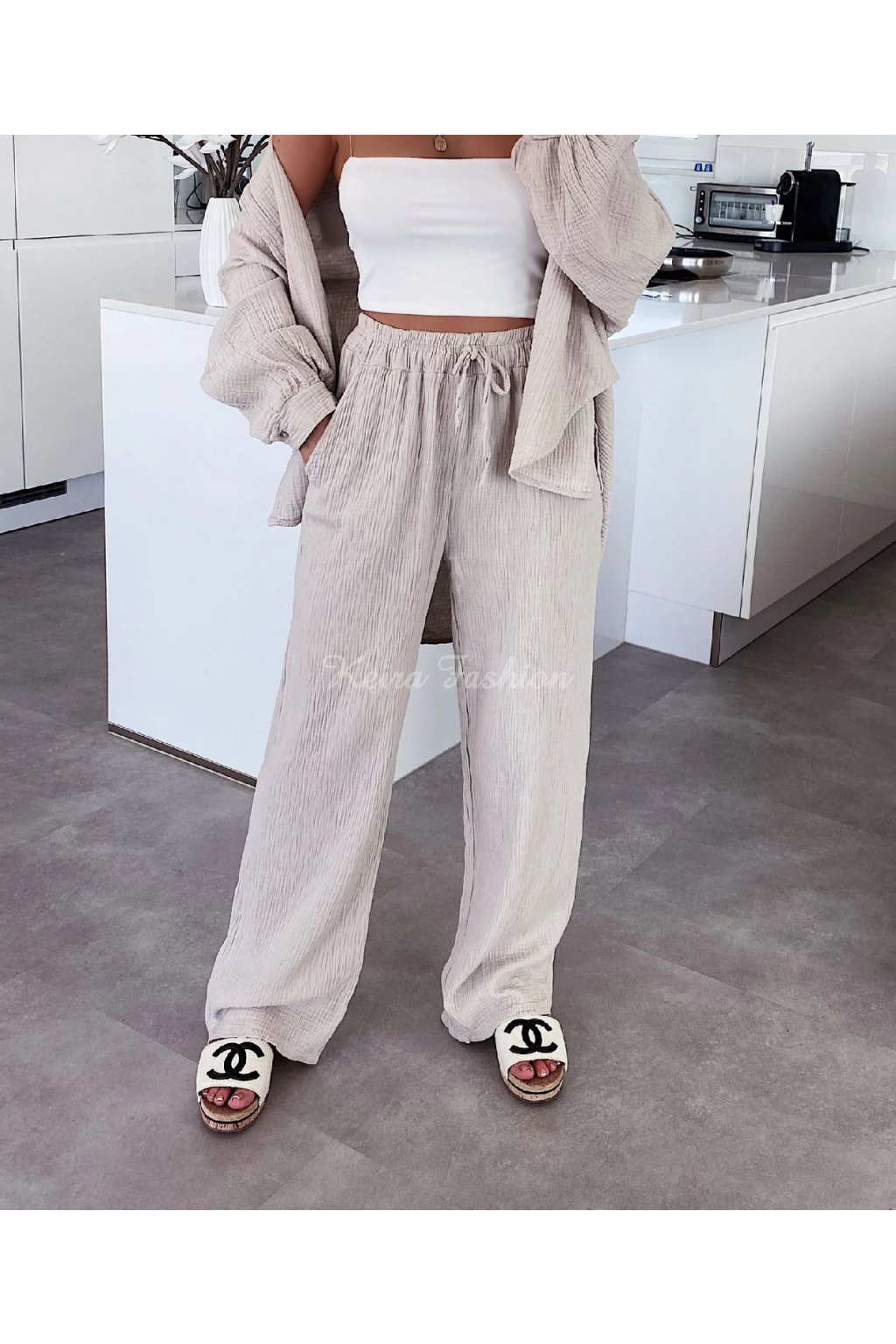 Tento béžový mušelinový komplet je stelesnením pohodlia, štýlu a všestrannosti. Vyrobený zo 100% bavlny, je mimoriadne vzdušný, príjemný a ideálny na teplé dni. Oversized košeľa s gombíkovým zapínaním pôsobí uvoľnene a elegantne, zatiaľ čo široké nohavice s gumou v páse a praktickými vreckami ponúkajú maximálne pohodlie. Komplet môžeš nosiť spolu ako zladený outfit, alebo si ho rozdeliť – košeľu skombinovať s rifľami, nohavice s tielkom či crop topom. Vďaka neutrálnemu odtieňu a nadčasovému strihu je tento set ideálny na dovolenku, pláž, výlety, mestský štýl aj domáce pohodlie. Vyrobený v Európe.