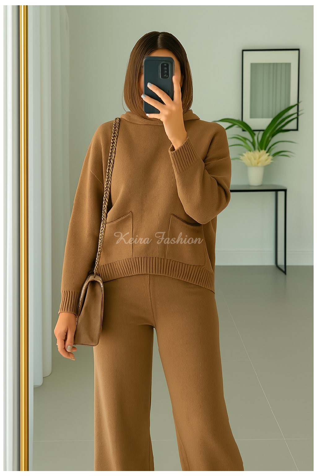 Objavte dokonalé spojenie pohodlia a štýlu s touto dámskou úpletovou súpravou v hnedej farbe! Vyrobená z kvalitného, mäkkého a elastického materiálu s vysokým podielom viskózy a prímesou polyamidu, ktorý zaručuje príjemný pocit pri nosení. Vrchný diel má voľný, moderný strih s praktickými vreckami a pohodlnou kapucňou vzadu – ideálny na každodenné nosenie aj domáce leňošenie. Nohavice majú pohodlný, mierne uvoľnený strih, ktorý spolu s gumou v páse zaručuje komfort pri nosení. Táto súprava je ideálnym riešením pre ženy, ktoré hľadajú štýlové, no zároveň maximálne pohodlné oblečenie.