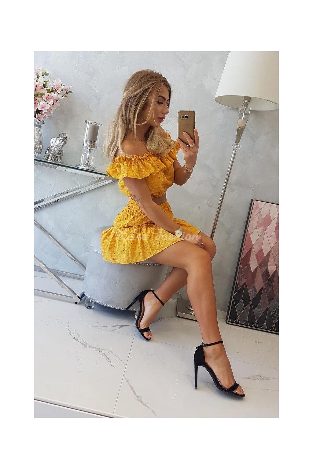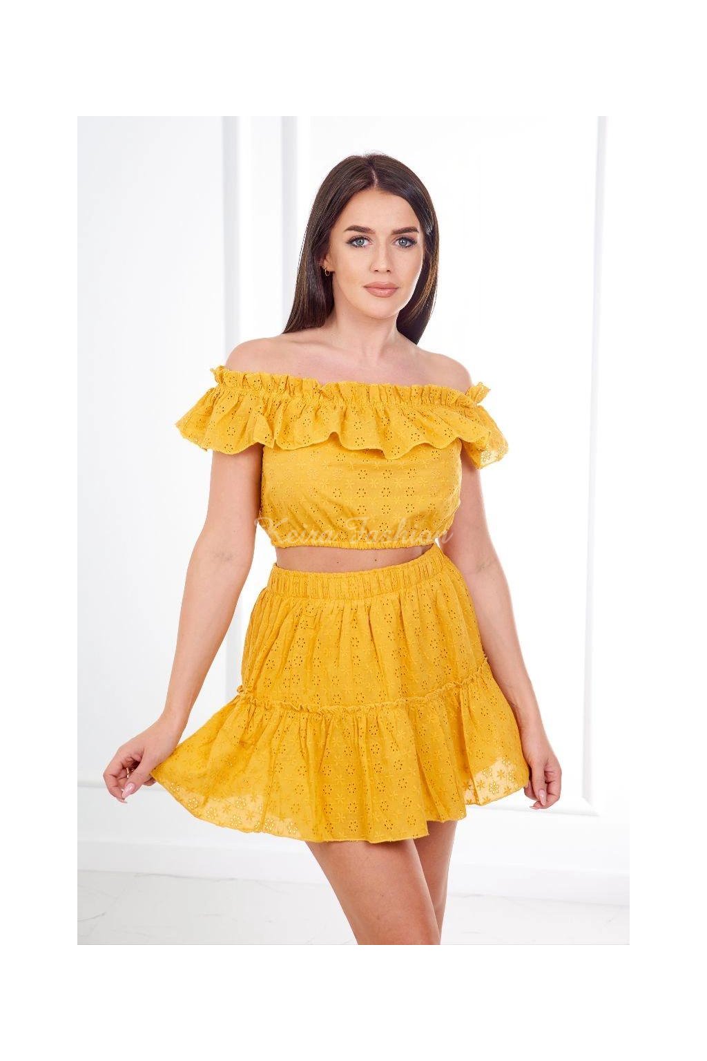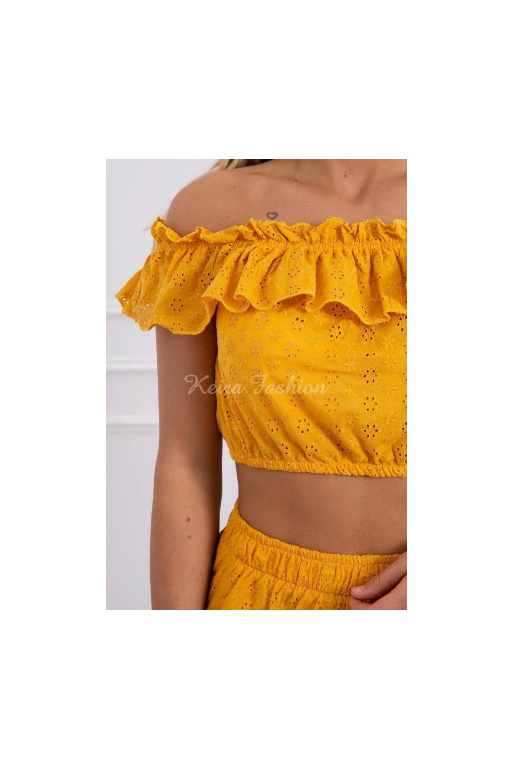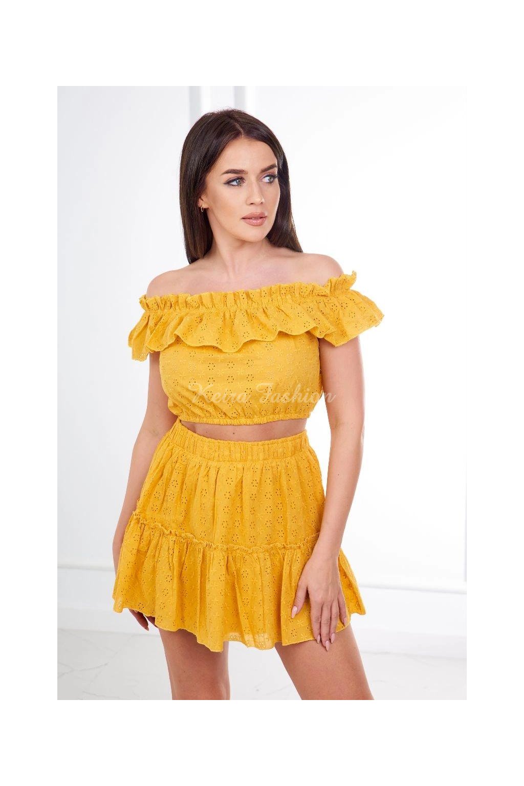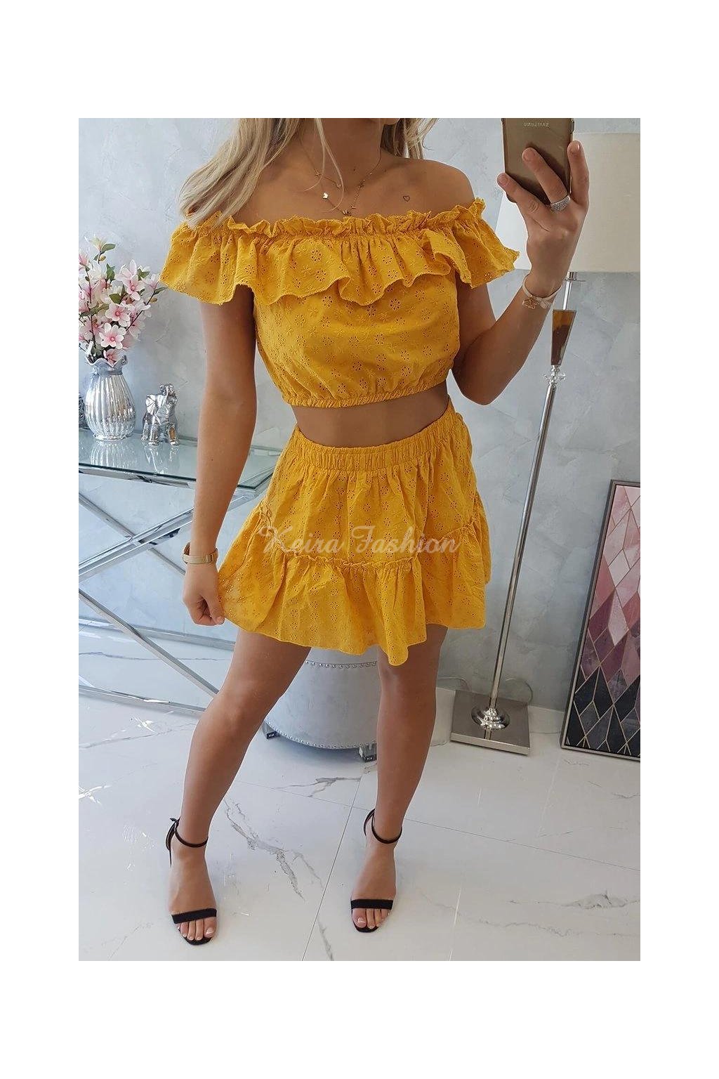 Rozžiar leto s týmto romantickým kompletom v žiarivej žltej farbe, ktorý okamžite pritiahne pohľady. Blúzka s volánovým lemom jemne odhaľuje ramená a pôsobí nežne aj zvodne. Sukňa s rovnakým volánovým detailom vytvára dokonale zladený look. Tento jedinečný kúsok sa vyznačuje prepracovanou výšivkou v štýle madeira, ktorá mu dodáva jedinečný charakter. Guma v páse sukne, aj v blúzke (v oblasti pásu a ramien), zabezpečuje pohodlné nosenie. Komplet je vyrobený zo 100% bavlny, je priedušný, ľahký a príjemný na pokožku – ideálný na horúce dni. Univerzálna veľkosť je vhodná pre ženy vo veľkostiach S, M alebo L.