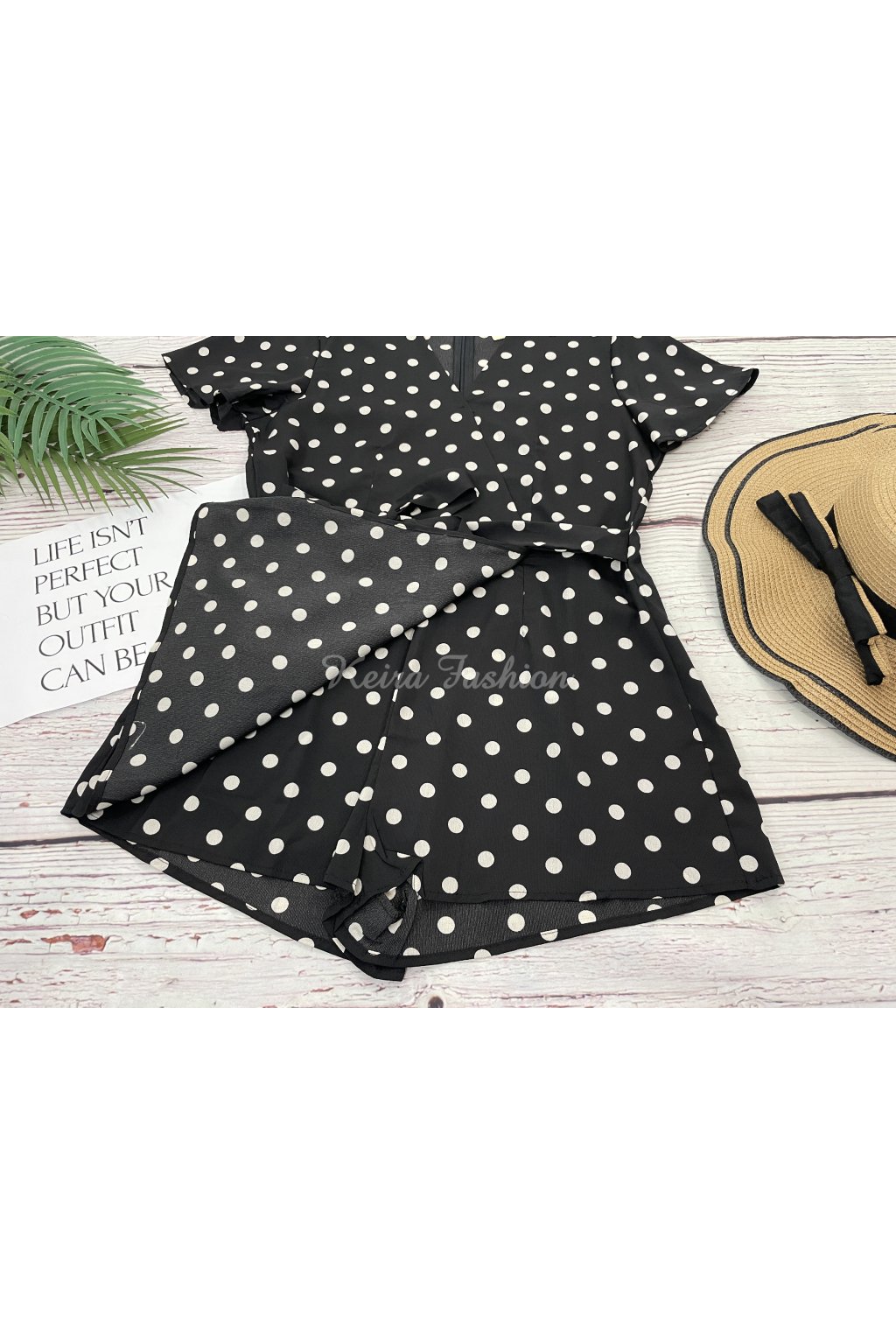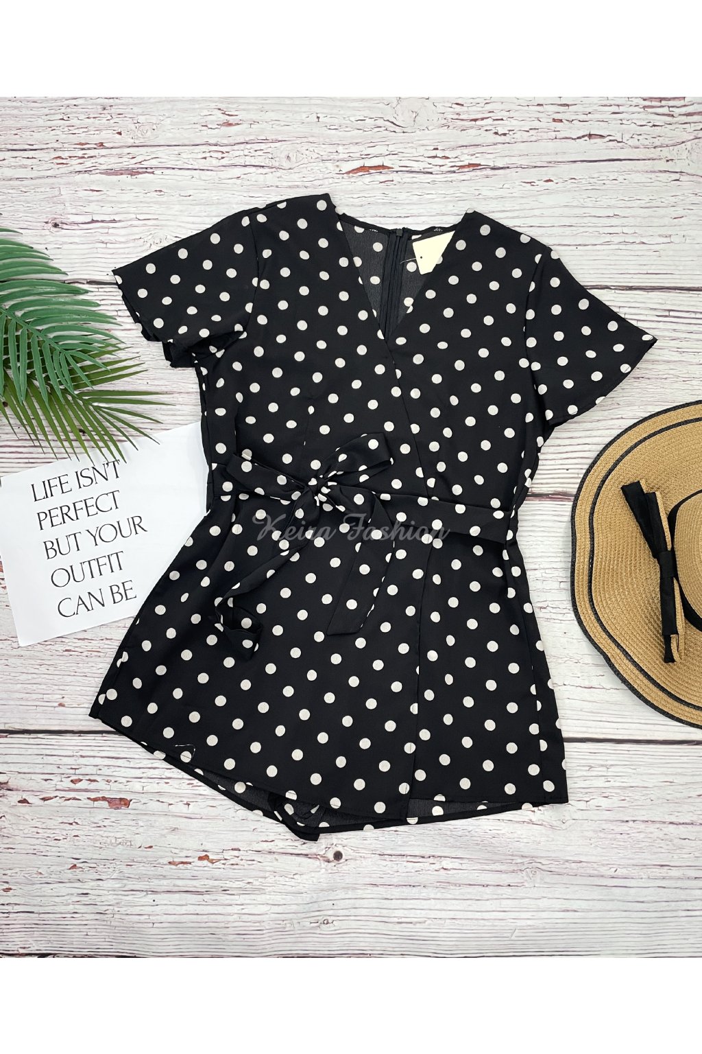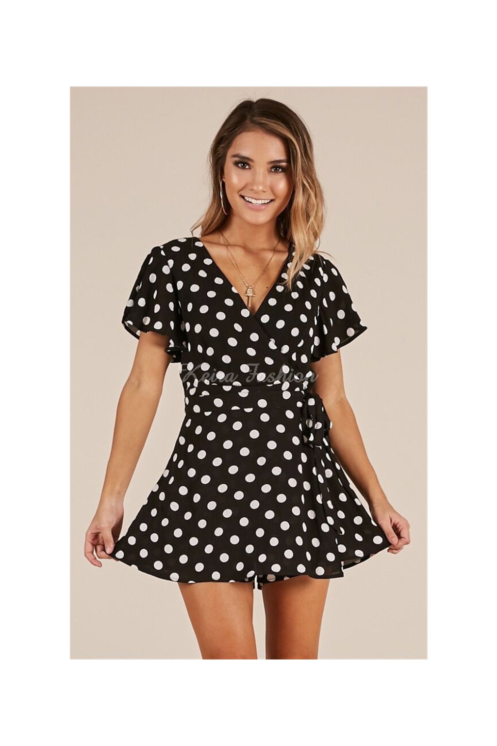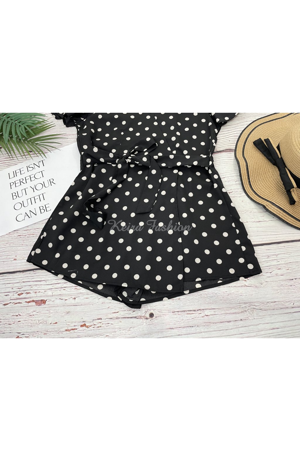 Štýlový krátky letný overal v čiernej farbe s bielymi bodkami je jedinečný svojím skort strihom – spredu vyzerá ako sukňa, zozadu ako šortky, čo z neho robí mimoriadne pohodlný a pritom elegantný kúsok. V páse je viazanie, ktoré si môžete uviazať na mašľu vpredu alebo vzadu podľa štýlu. Zapínanie vzadu na skrytý zips. Materiál je ľahký, príjemný, ale neelastický. Ideálny letný outfit na prechádzky, dovolenky či voľný čas.