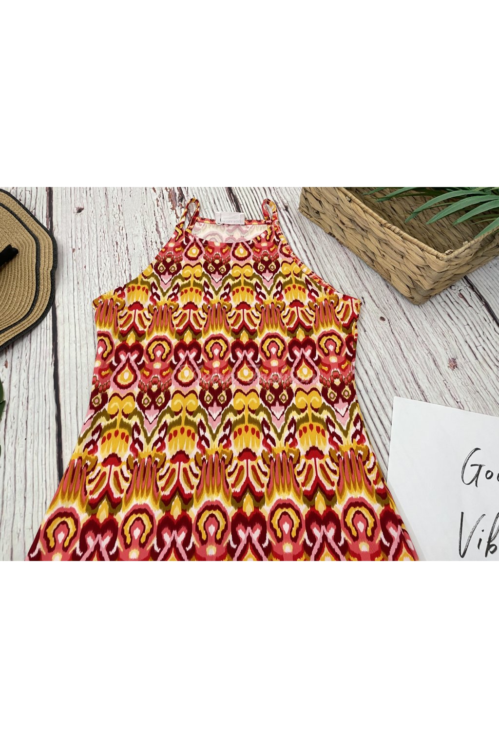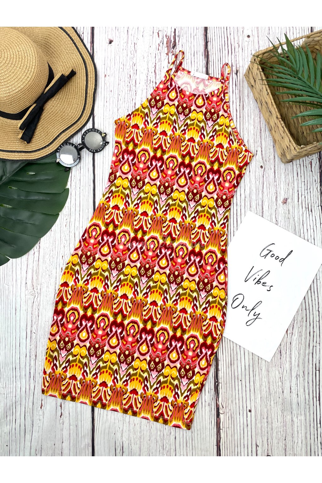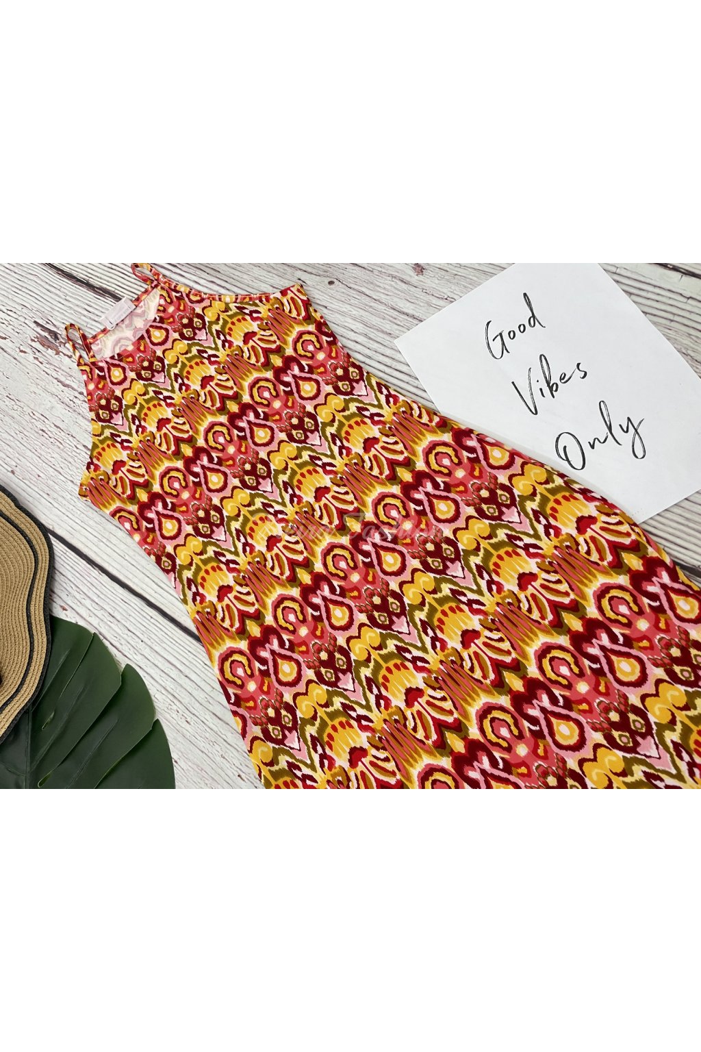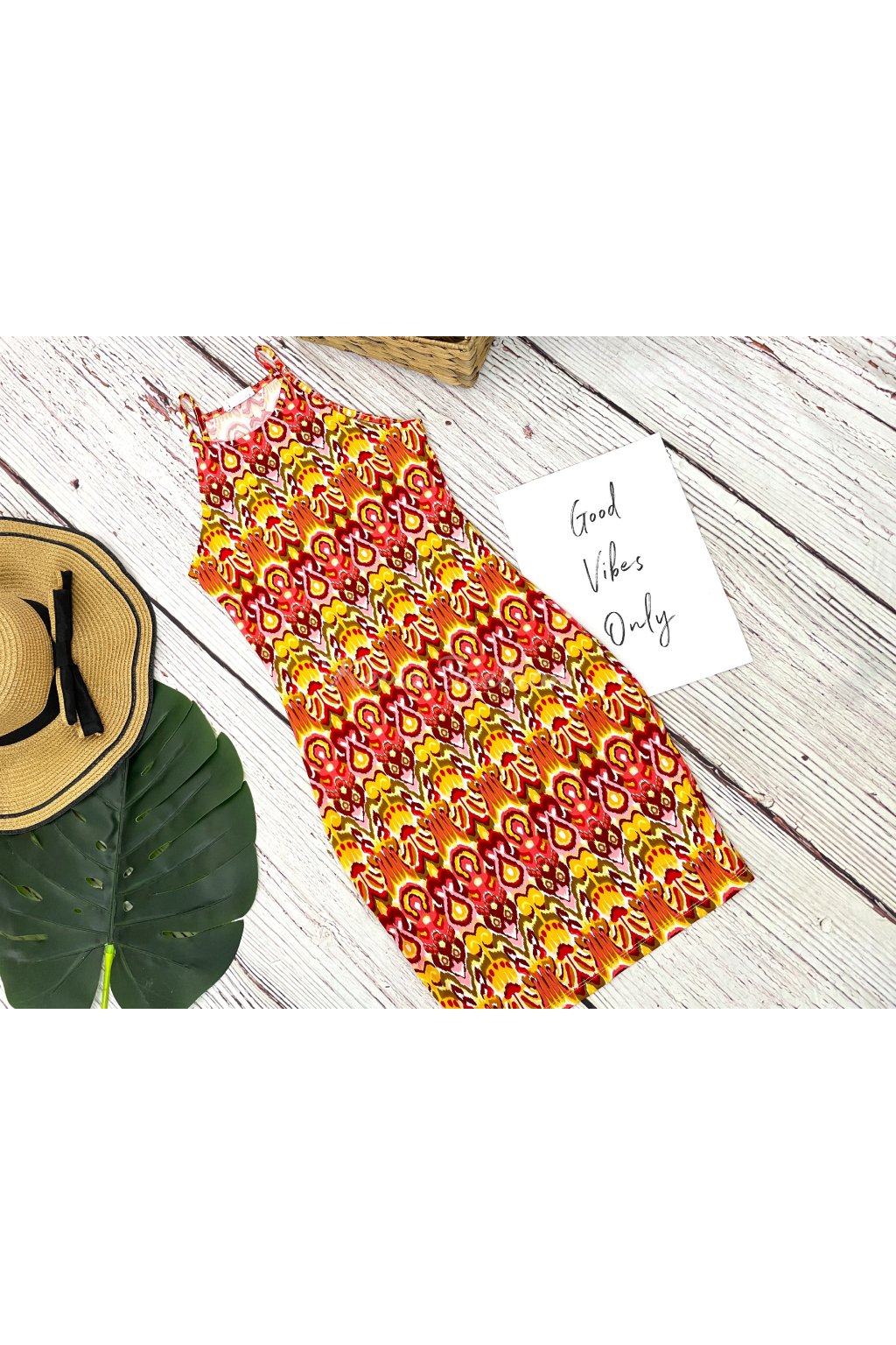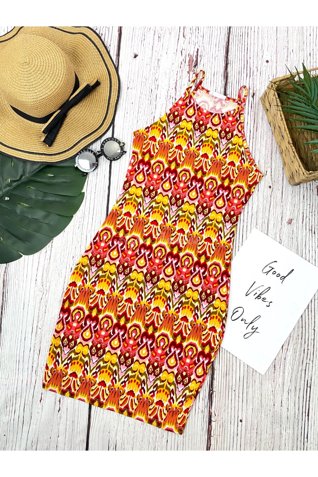 Zaujmite vo vzorovaných letných šatách na ramienka, kde dominuje svieža kombinácia oranžovej a žltej farby. Úzky strih dokonale kopíruje postavu a vyzdvihuje ženské krivky. Šaty sú vyrobené z veľmi elastického materiálu, ktorý poskytuje maximálne pohodlie počas celého dňa. Ideálne na dovolenku, letné prechádzky aj neformálne stretnutia.