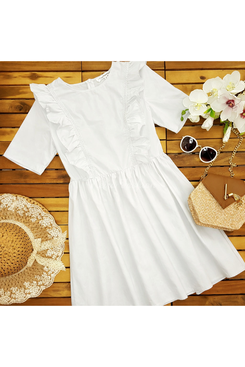 Krátke biele šaty s volánmi pozdĺž prednej časti sú ideálnou voľbou na leto. Vďaka ľahkej bavlnenej látke, zúženému pásu pôsobia žensky a sviežo. Sukňová časť je podšitá, čo zaručuje pohodlie a nepriehľadnosť. Zapínanie je vzadu na skrytý zips. Ideálne na letné dni, prechádzky mestom či dovolenkové outfity – kombinujte ich s farebnou kabelkou alebo sandálmi pre dokonalý look.