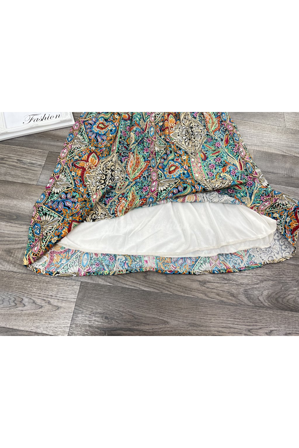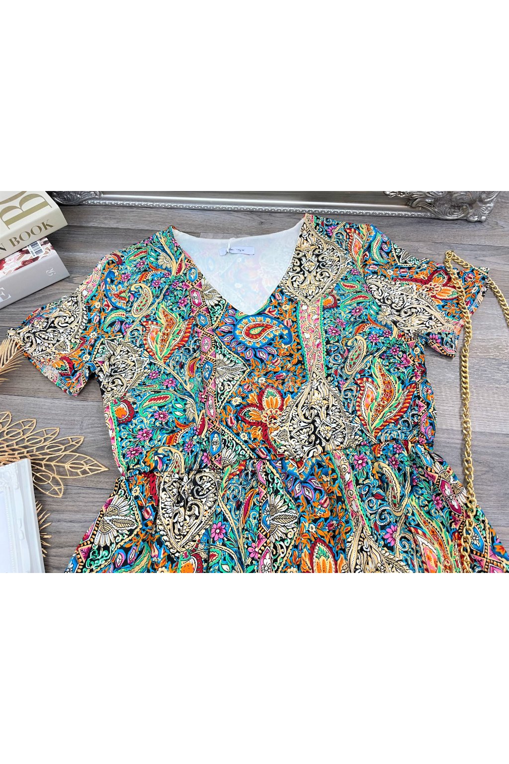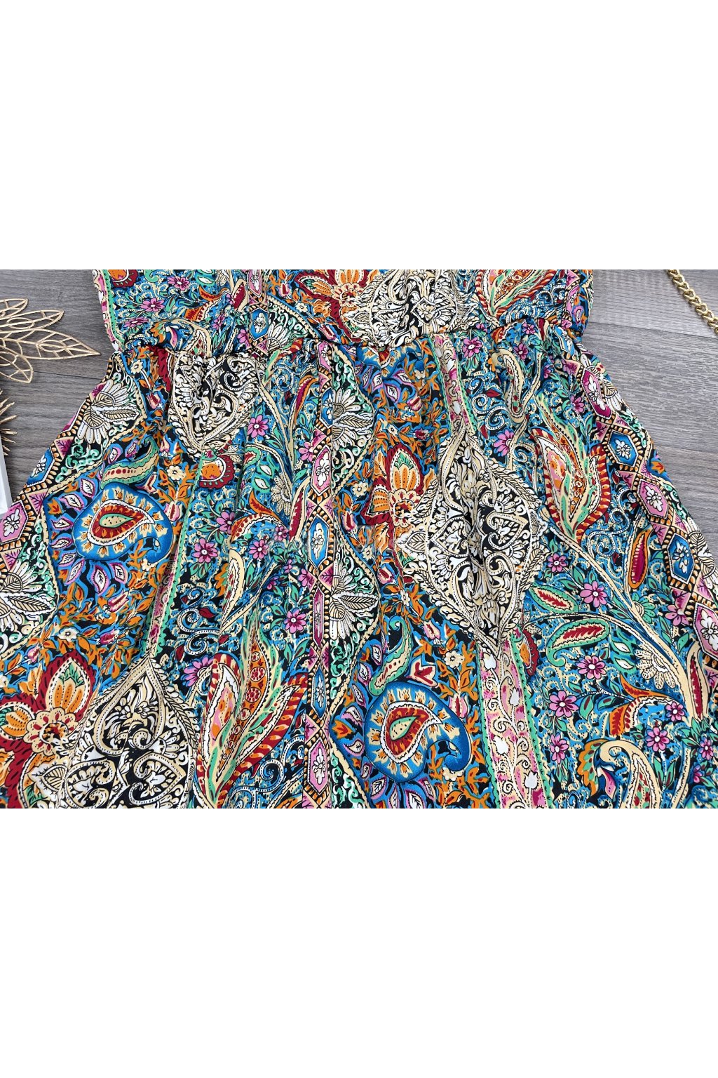 Objav čaro farieb a vzorov s týmito nádhernými letnými šatami, ktoré zaujmú na prvý pohľad. Šaty sú vyrobené z ľahkého materiálu, majú príjemnú podšívku, takže nepresvitajú. Strih šiat je voľnejší v oblasti sukne, zatiaľ čo v páse sú jemne zúžené, čo krásne zvýrazní ženskú siluetu. Rukávy sú krátke, výstrih do tvaru V. Šaty zdobí výrazný paisley vzor – ikonický, ornamentálny motív pripomínajúci slzu či kvapku s bohatým detailným zdobením. Tento vzor je typický pre boho/etno štýl, ktorý kombinuje umelecký a voľnomyšlienkársky vzhľad. Paisley vzor je známy aj ako kašmírový vzor alebo orientálny motív . Farebne sú šaty skutočným pútavým kúskom – nájdete na nich sýte odtiene tyrkysovej, kráľovskej modrej, žltej, oranžovej, fuchsiovej, ružovej, červenej a čiernej, všetko zladené do harmonického a živého celku. Vzor obsahuje aj kvetinové prvky a čierno-biele ornamenty, ktoré vytvárajú krásny kontrast. Tento štýl je mimoriadne obľúbený v lete, na festivaly, dovolenky či voľnočasové prechádzky a je skvelou voľbou pre ženy, ktoré milujú farby, pohodlie a nevšedné vzory.