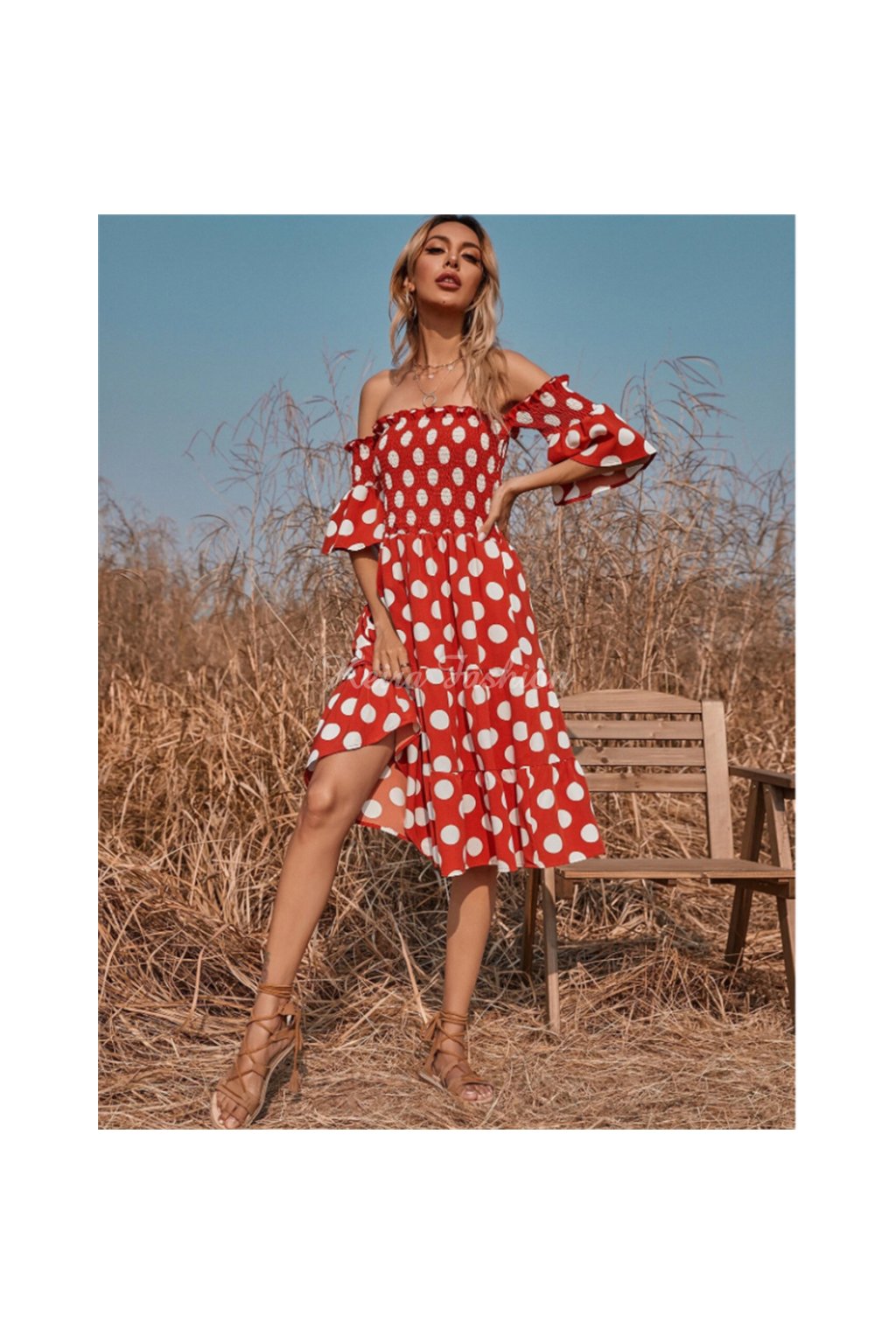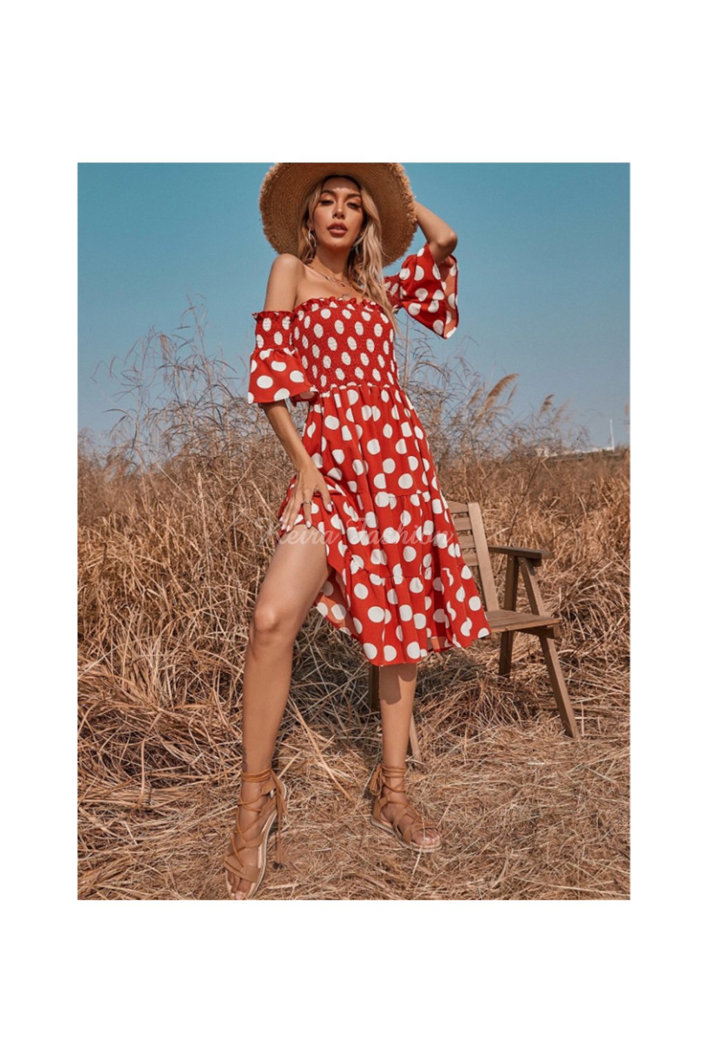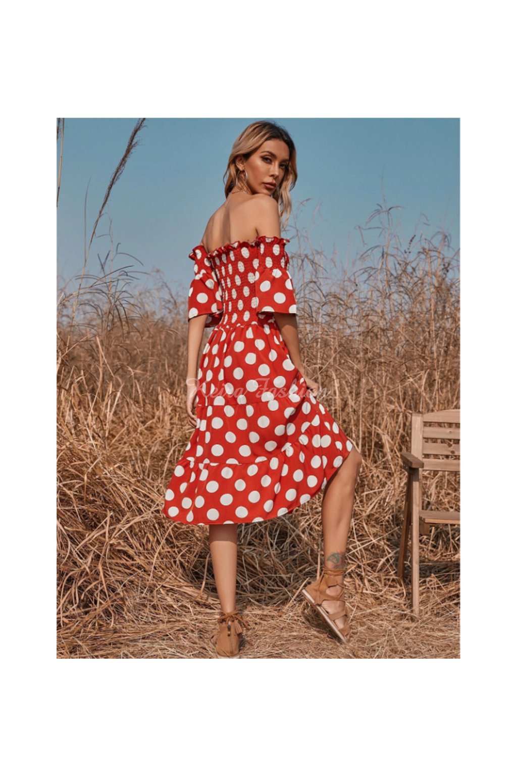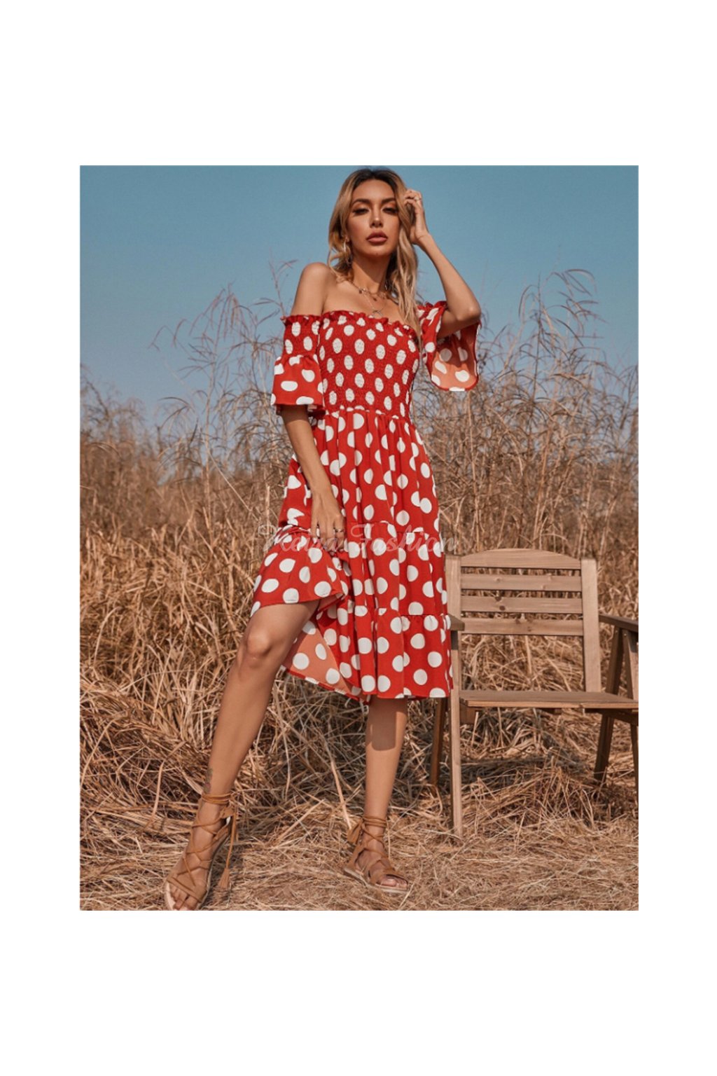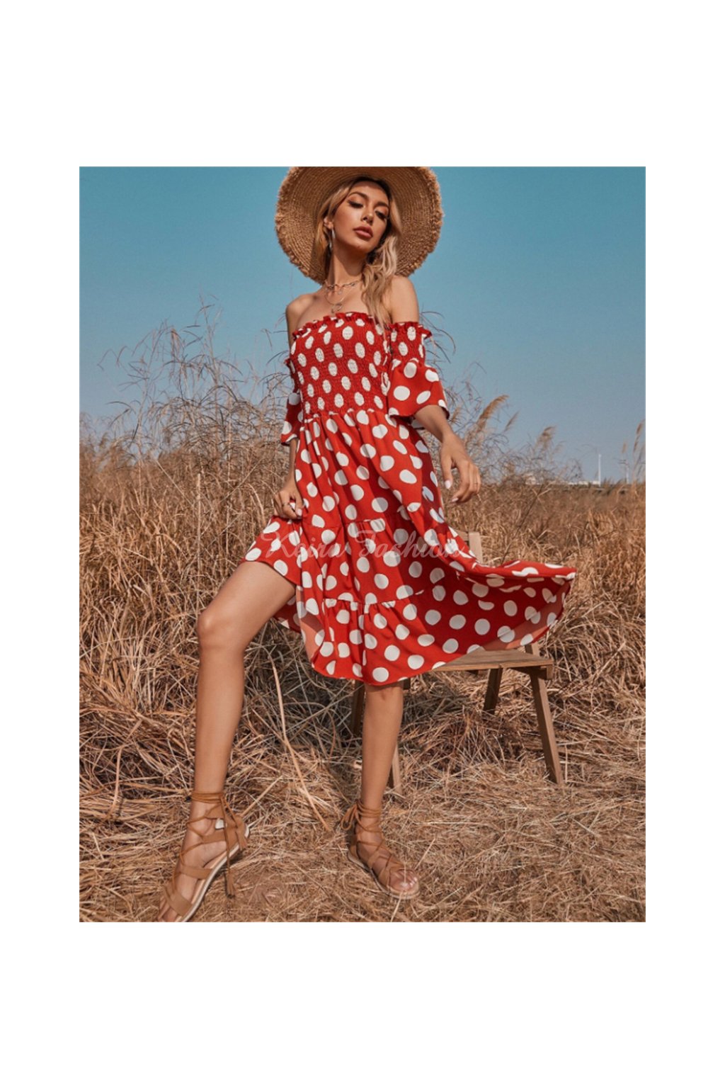 Dámske červené bodkované midi šaty, ideálne na letné dni. Šaty majú pohodlnú gumičku cez ramená a prsia, ktorá zabezpečuje perfektné držanie a pohodlné nosenie počas horúcich letných dní. S ich pútavým dizajnom a ženským strihom budú tieto šaty skvelou voľbou na prechádzky, dovolenky aj letné oslavy, kde určite pritiahnu pozornosť.