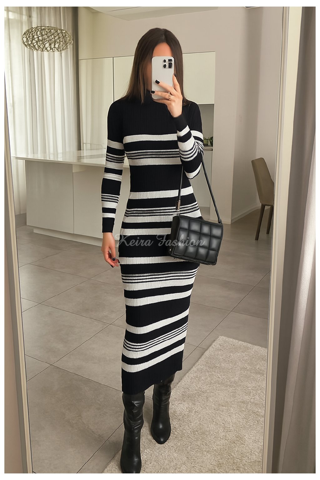 Štýlové úpletové šaty s rolákom v čierno-bielom pruhovanom dizajne. Priliehavý strih krásne zvýrazní ženskú postavu a pružný úpletový materiál sa dokonale prispôsobí. Dĺžka pod kolená pôsobí moderne a zároveň decentne.