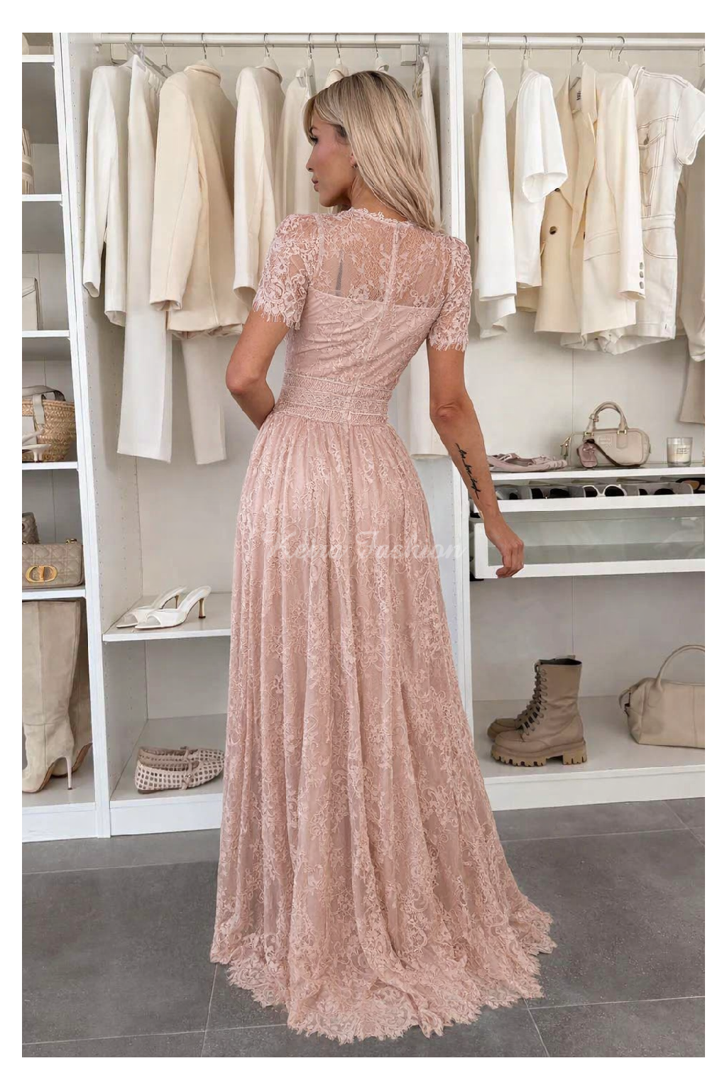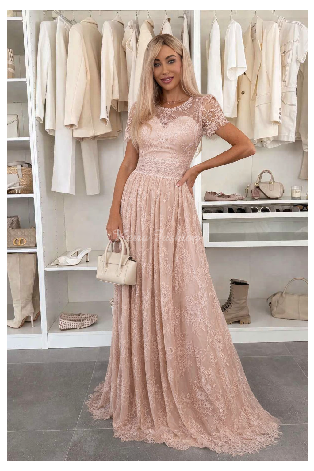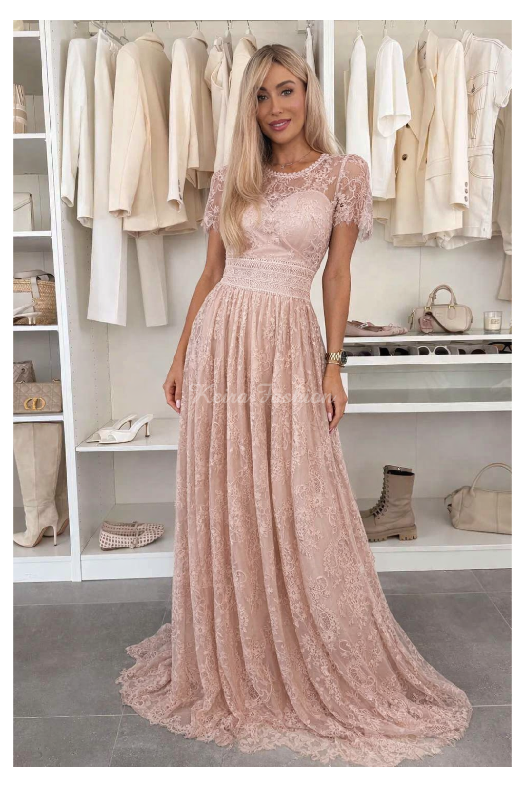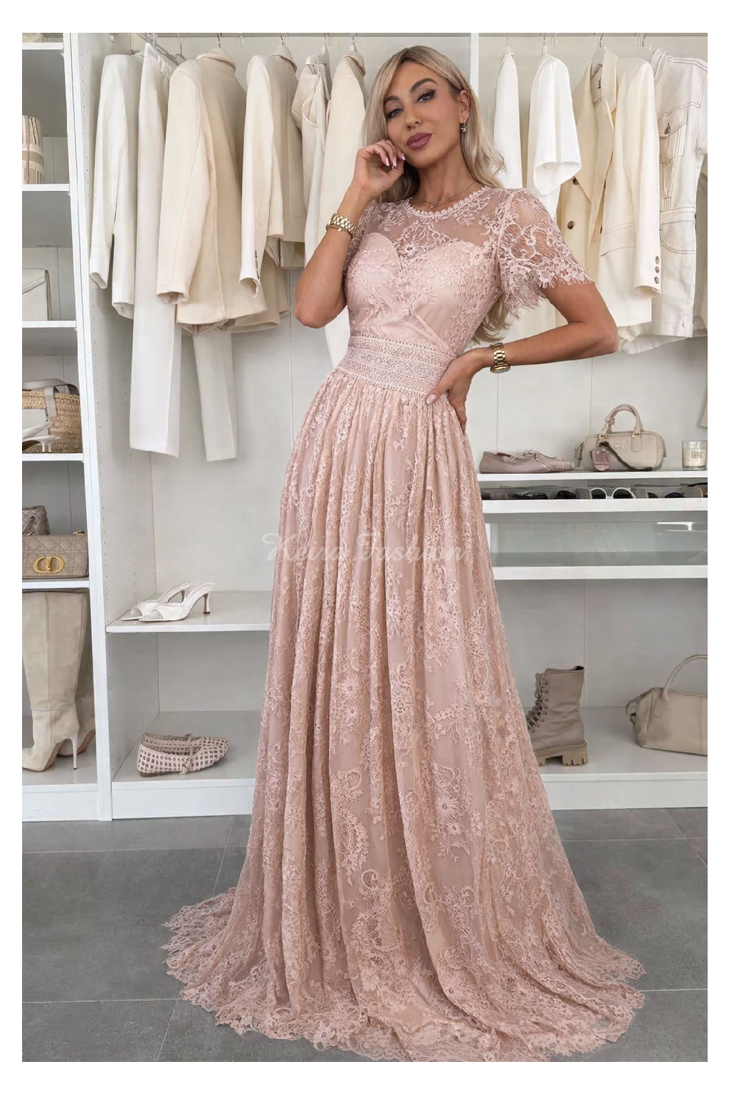 Exkluzívne spoločenské dlhé šaty s jemnou a detailnou čipkou, ktorý pôsobí veľmi elegantne a sofistikovane. Šaty sú vyrobené s dôrazom na kvalitné spracovanie každej detailnej časti. Šaty majú krátke čipkové rukávy a sú zakončené dlhou splývavou sukňou s čipkovaným lemom. Zapínanie je vzadu na skrytý zips, čo zaručuje pohodlné obliekanie. V oblasti pŕs sú všité vypchávky, ktoré zabezpečujú podporu a tvar bez potreby nosenia podprsenky. Pás je zvýraznený krásnou krajkovou aplikáciou. Šaty sú vhodné na špeciálne príležitosti, večerné udalosti, svadby alebo plesy.
