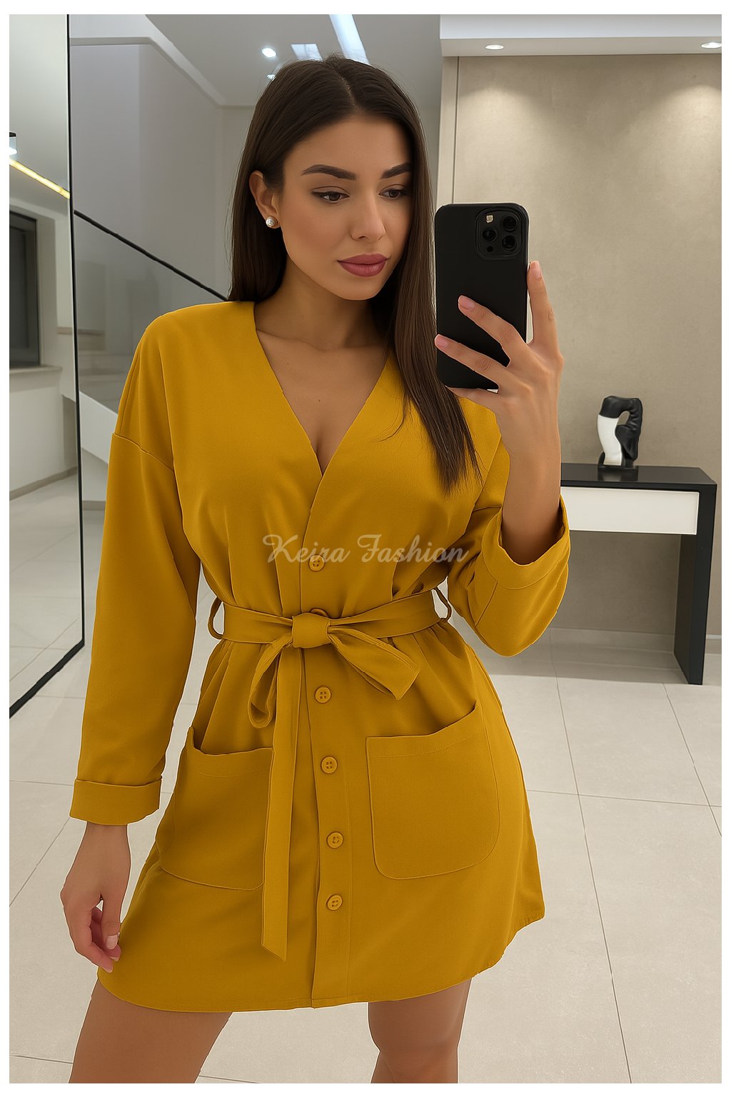 Tieto horčicové šaty sú must-have kúskom vo vašom šatníku. Šaty sú vyrobené z neelastického materiálu, ktorý drží svoj tvar a zabezpečuje pohodlné nosenie počas celého dňa. Gombíky na prednej strane sú funkčné, čo umožňuje ich jednoduché zapínanie a rozopínanie podľa potreby. Šaty majú dlhé rukávy s preloženým ukončením, dve praktické predné vrecká a opasok, ktorý krásne zvýrazní ženský pás. Vďaka svojej jedinečnej farbe horčicovej je tento model ideálny na jar, jeseň alebo chladnejšie letné dni. Šaty môžete kombinovať s elegantnými lodičkami alebo pohodlnými mokasínami a doplniť štýlovou kabelkou a slnečnými okuliarmi pre dokonalý look.