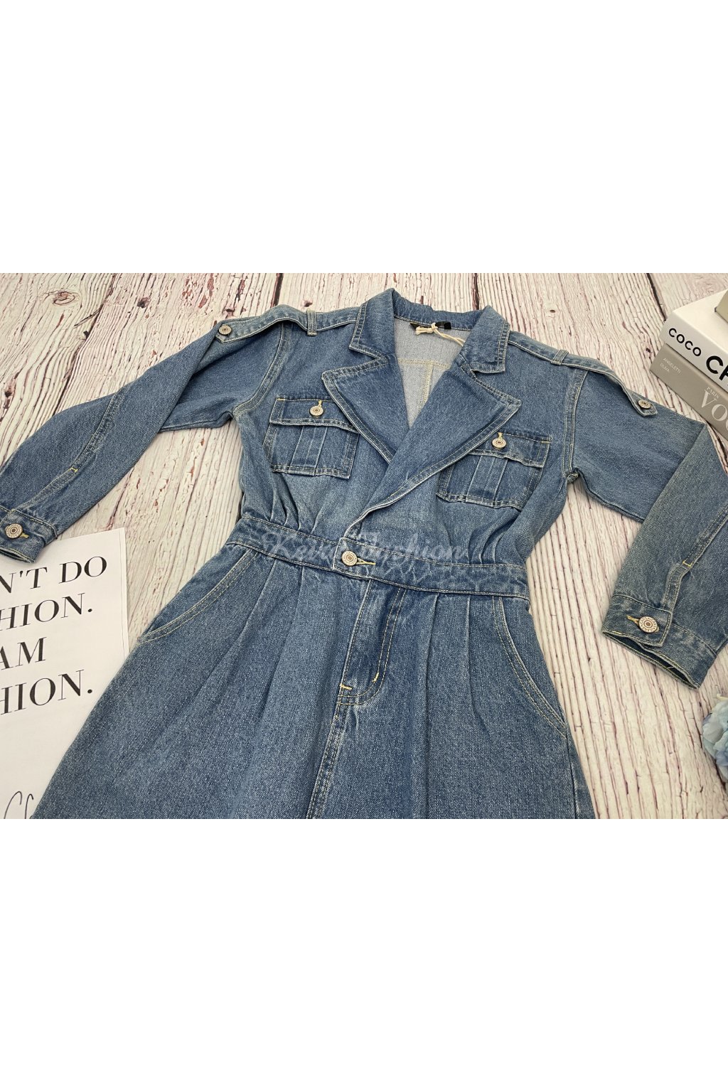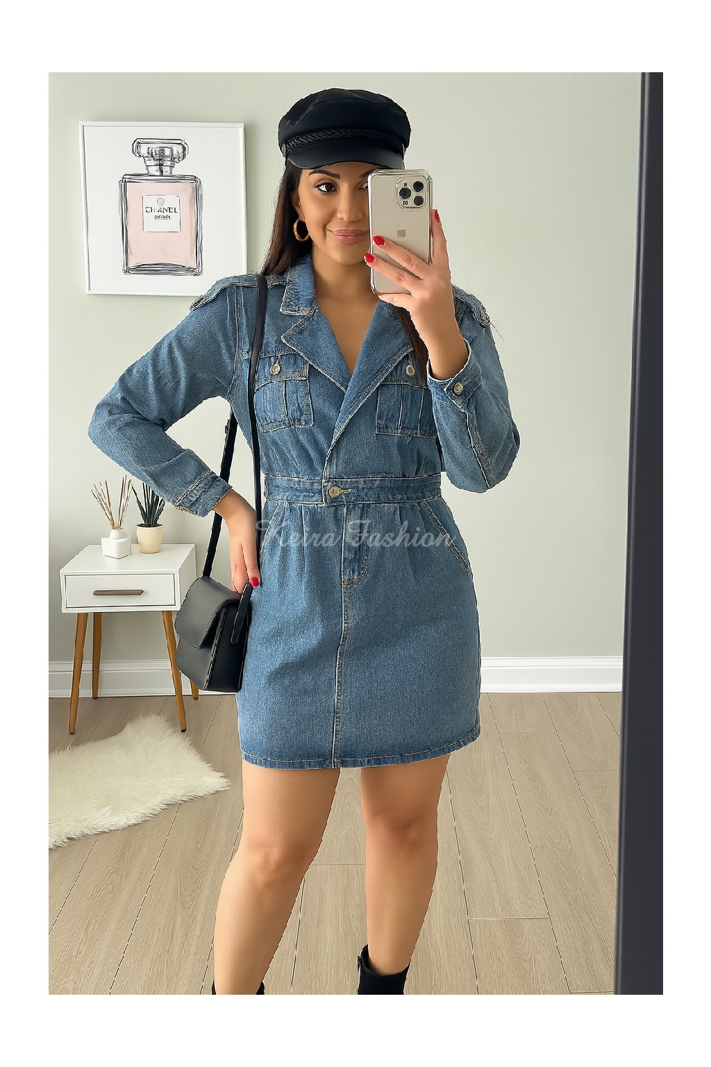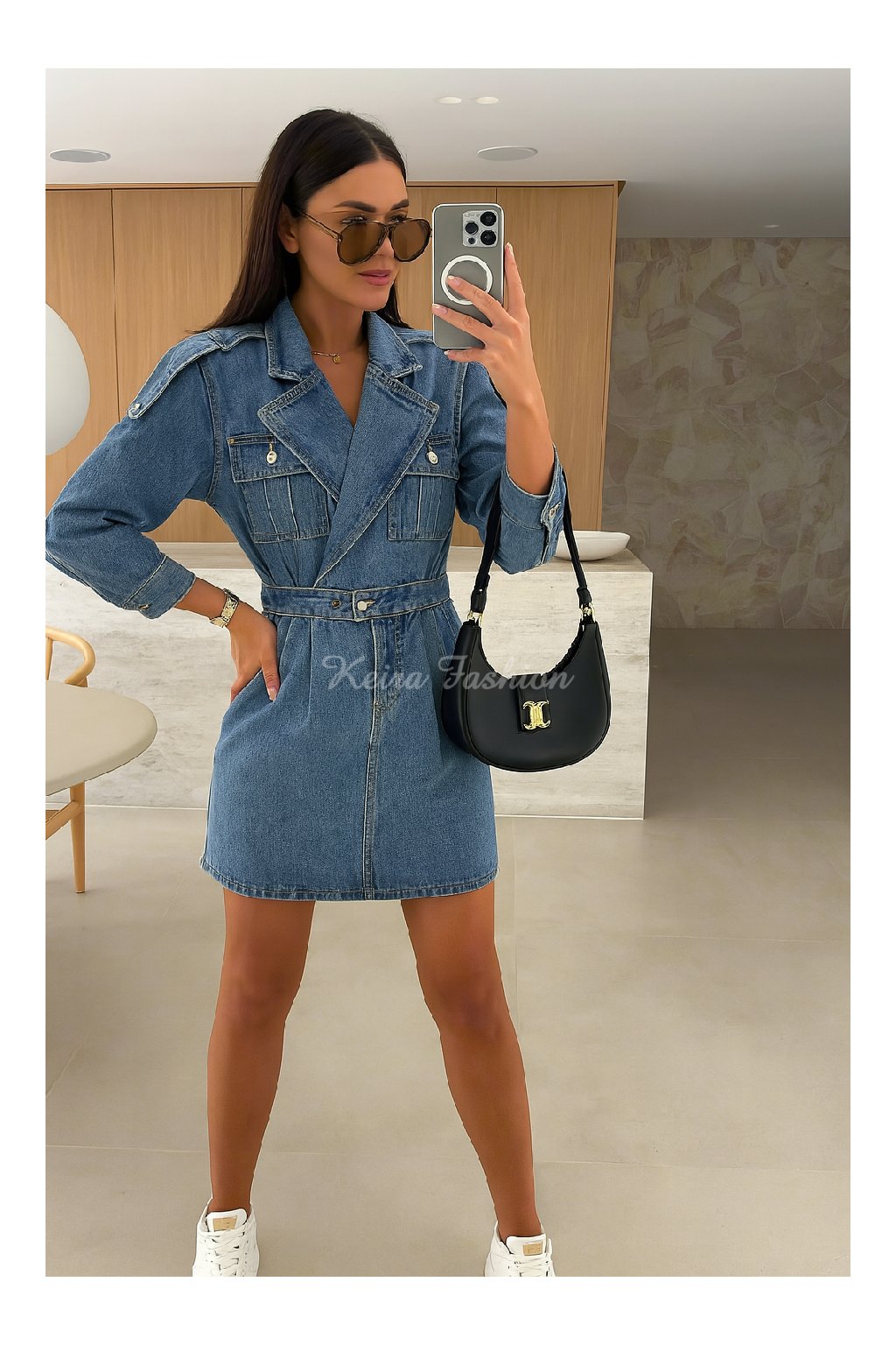 Štýlové modré riflové šaty s dlhým rukávom sú všestranným kúskom, ktorý využijete počas celého roka. Šaty majú pohodlnú dĺžku nad kolená a sú vyrobené z pevného, neelastického materiálu. Zapínanie na gombík v páse vytvára peknú siluetu, pričom gombíky nájdete aj na rukávoch a na vreckách na prsiach. V páse vzadu je guma. Funkčné vrecká po bokoch pridávajú na praktickosti. Tieto riflové šaty sú ideálne na bežné nosenie, do práce aj na voľný čas.