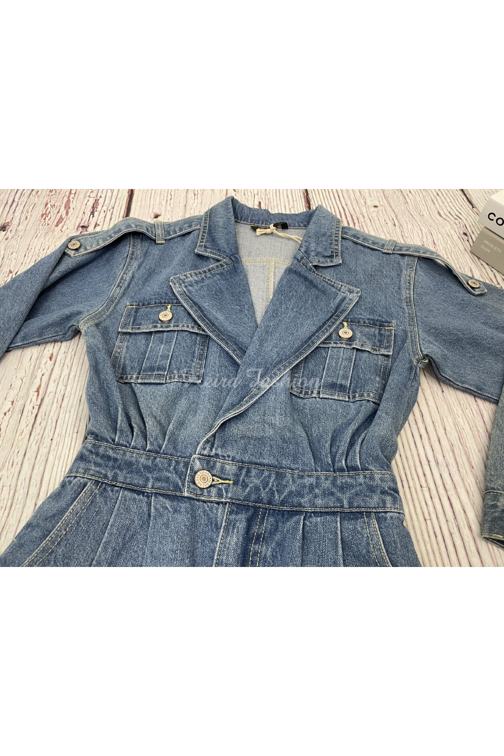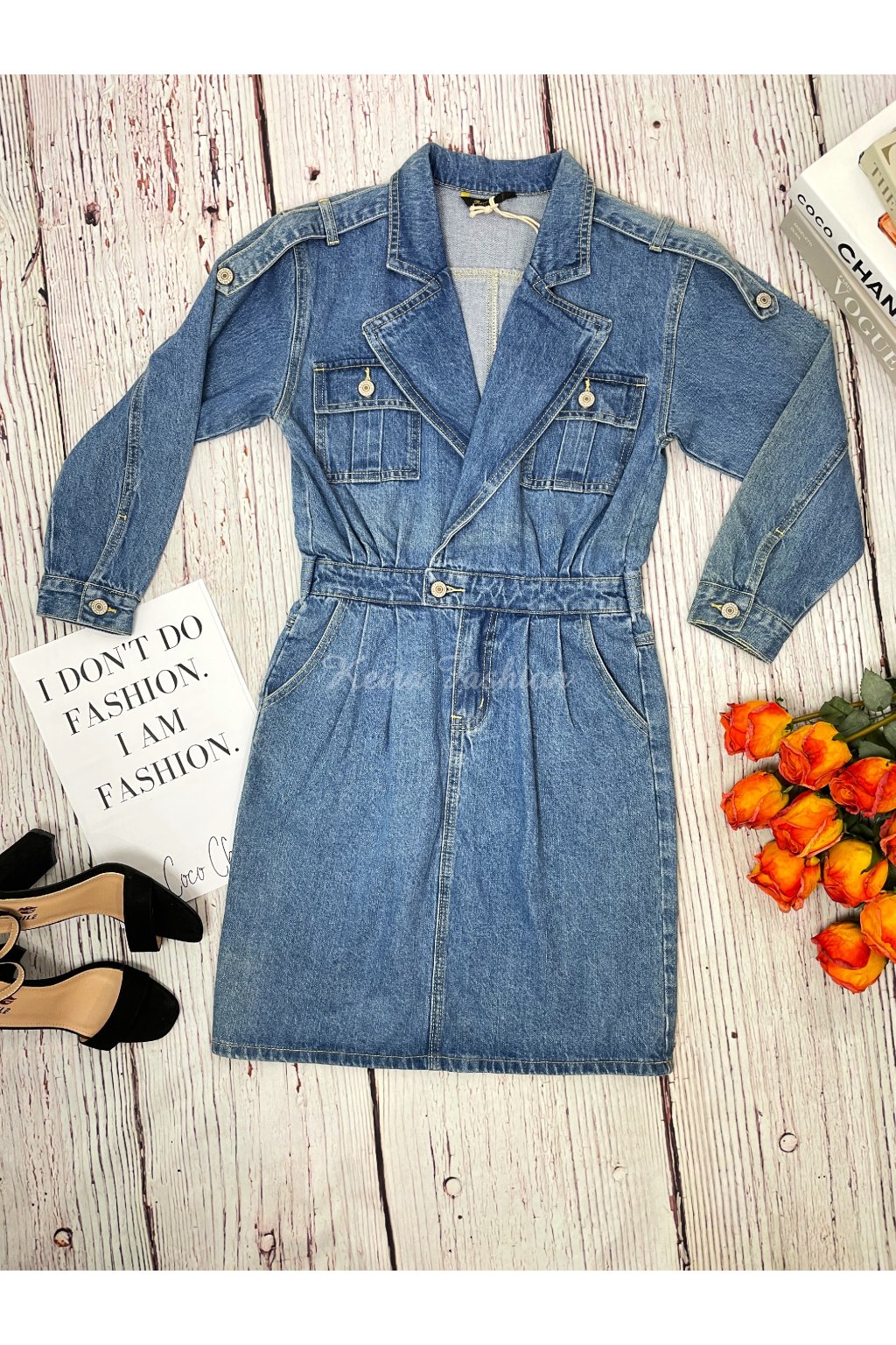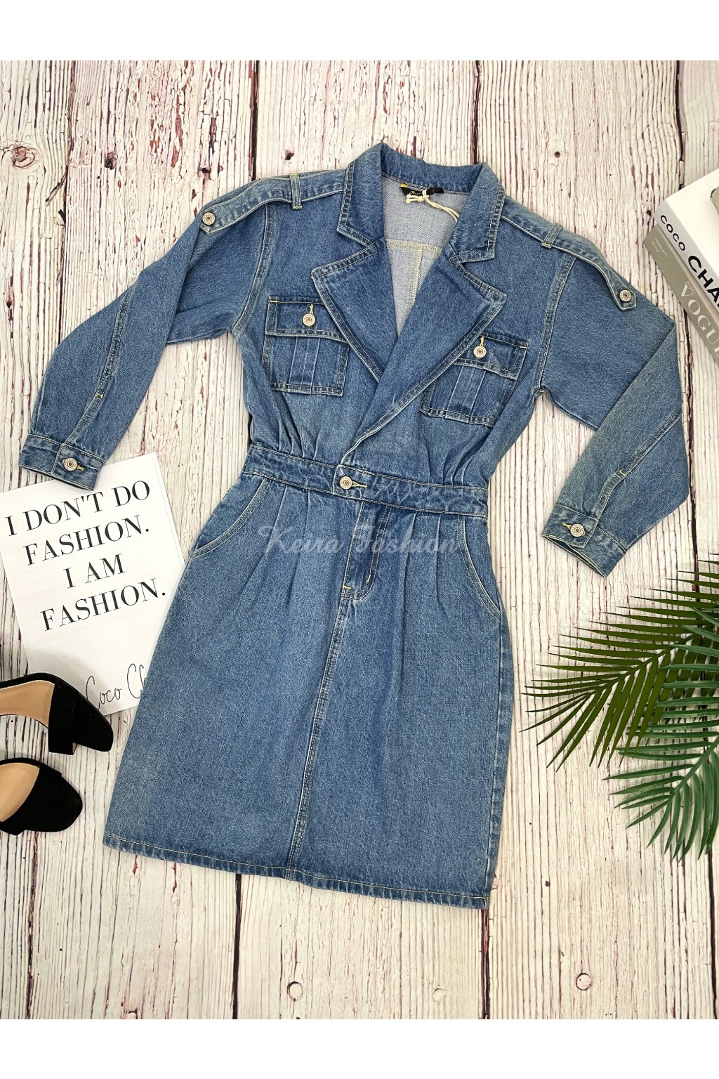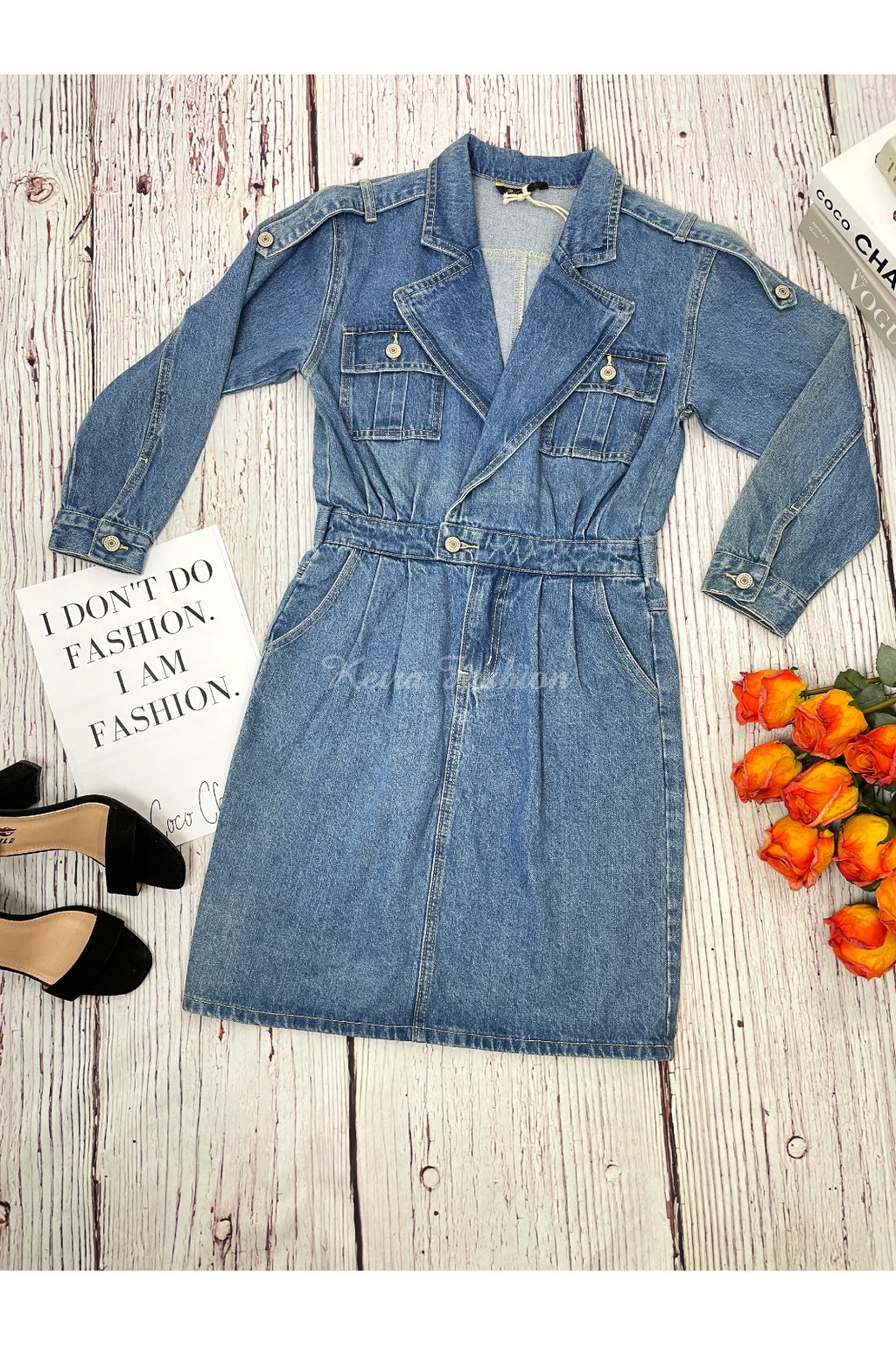 Štýlové modré riflové šaty s dlhým rukávom sú všestranným kúskom, ktorý využijete počas celého roka. Šaty majú pohodlnú dĺžku nad kolená a sú vyrobené z pevného, neelastického materiálu. Zapínanie na gombík v páse vytvára peknú siluetu, pričom gombíky nájdete aj na rukávoch a na vreckách na prsiach. V páse vzadu je guma. Funkčné vrecká po bokoch pridávajú na praktickosti. Tieto riflové šaty sú ideálne na bežné nosenie, do práce aj na voľný čas.