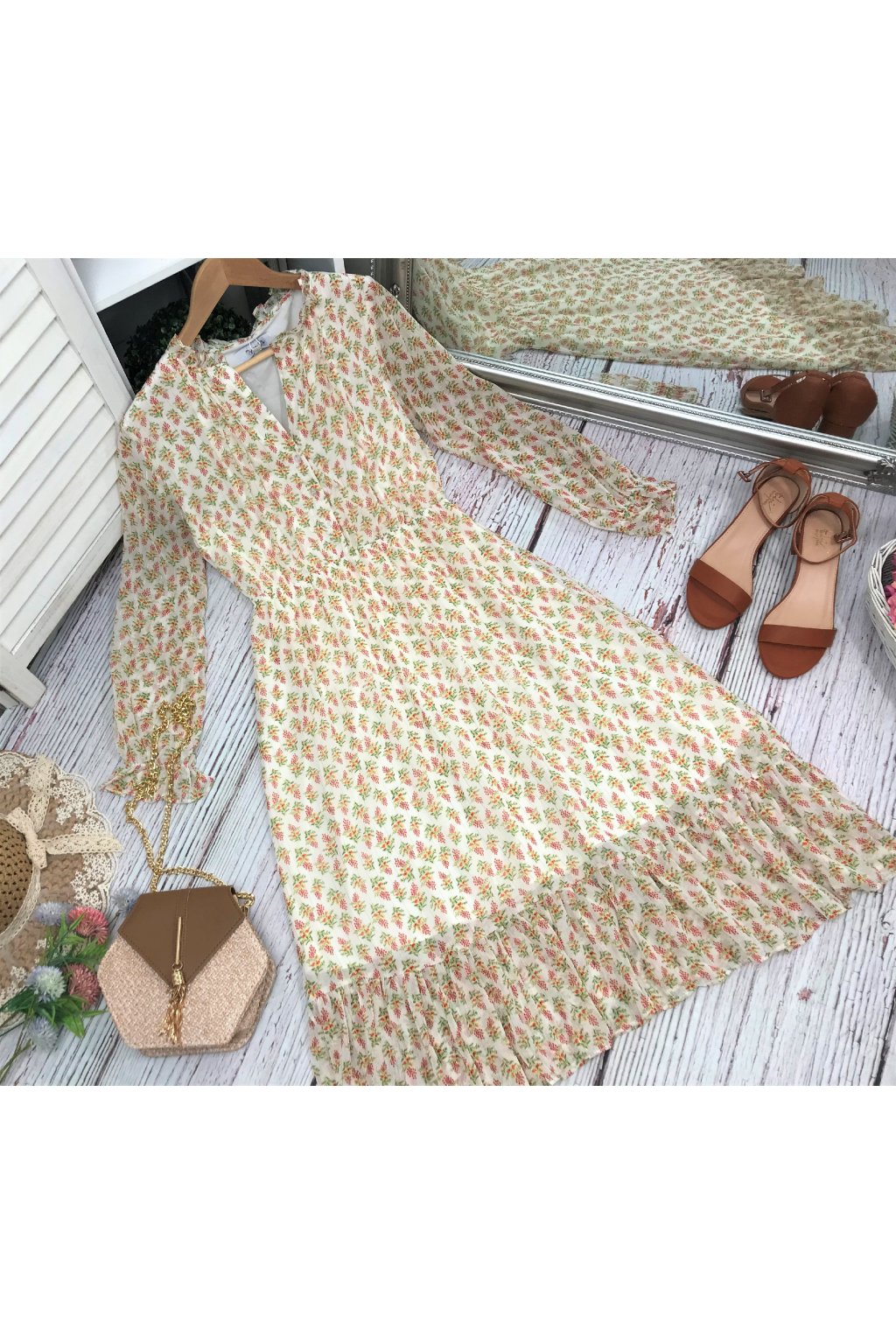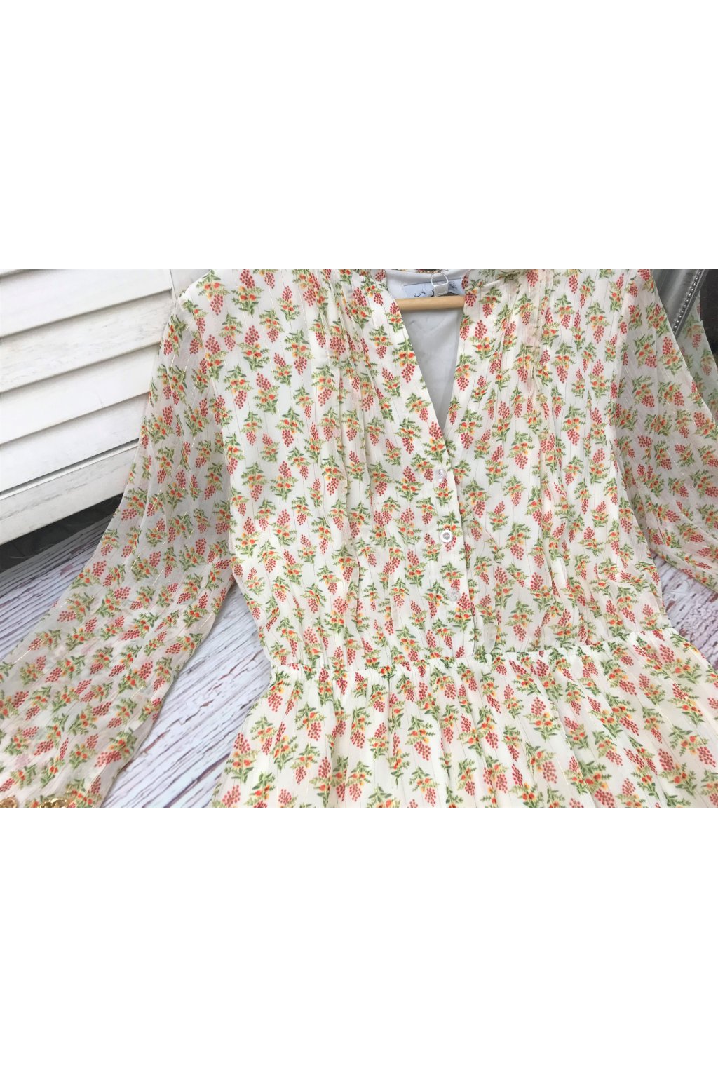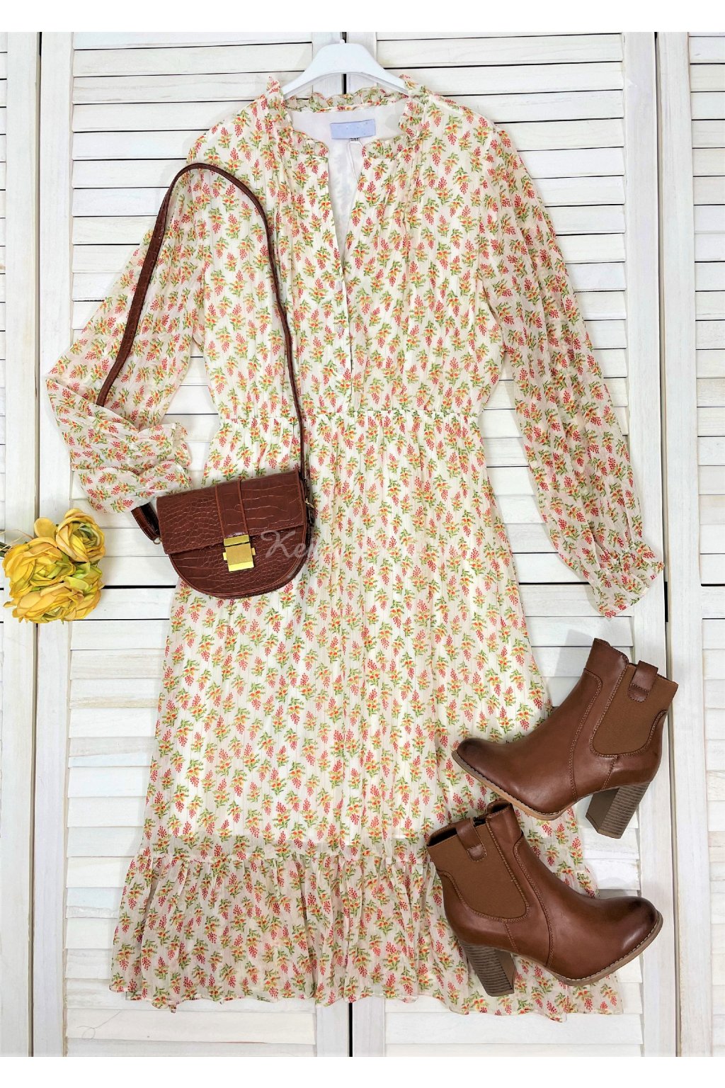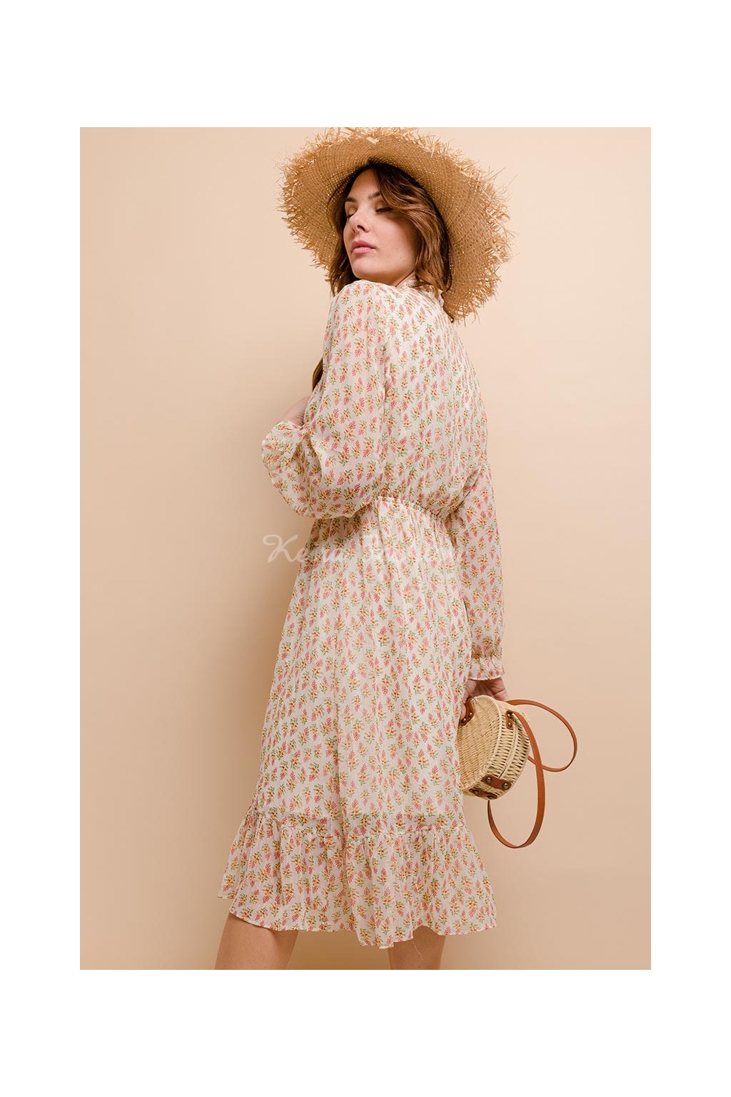 Tieto romantické kvetované midi šaty sú ideálnym kúskom do šatníka každej ženy, ktorá miluje jemnosť, eleganciu a vintage nádych. Šaty majú jemný kvietkovaný vzor s drobnými červenými kvetmi a zelenými lístkami, ktorý pôsobí sviežo a žensky. Strih je voľnejší s elastickým pásom, ktorý krásne zvýrazní pás. Dlhé rukávy sú zakončené jemným nariasením a gumou, čo dodáva šatám ľahkosť. Spodná časť šiat je zdobená volánom, ktorý sa pohybuje s každým krokom a pôsobí veľmi žensky. Šaty sú podšité v celej dĺžke okrem rukávov, čo zaručuje nepriehľadnosť, zatiaľ čo priesvitné rukávy im dodávajú ľahkosť a vzdušnosť. V prednej časti sú gombíky a decentný výstrih do V s malým volánikom okolo krku. Vďaka priedušnému a ľahkému materiálu sú tieto šaty skvelou voľbou na teplejšie dni, ale v kombinácii s členkovými topánkami a bundou ich využijete aj na jeseň.