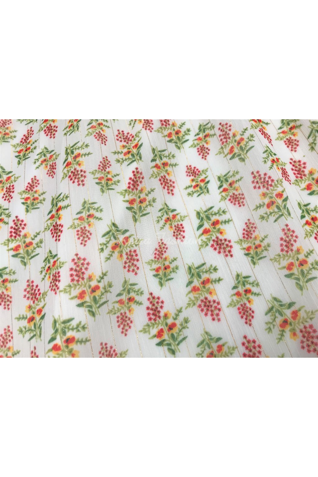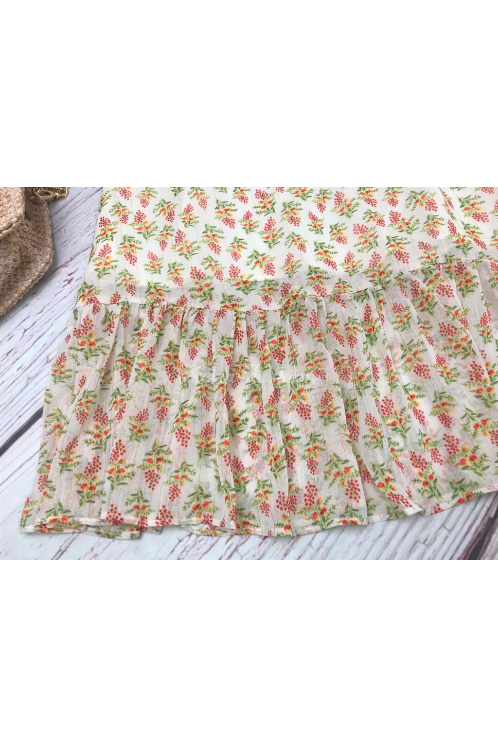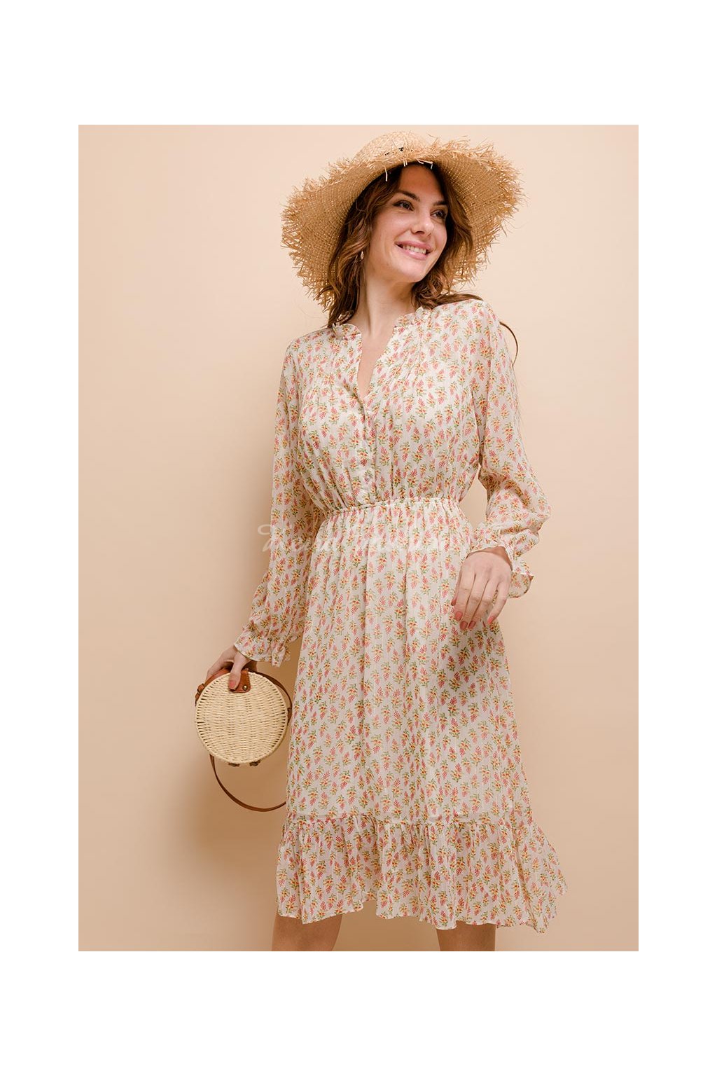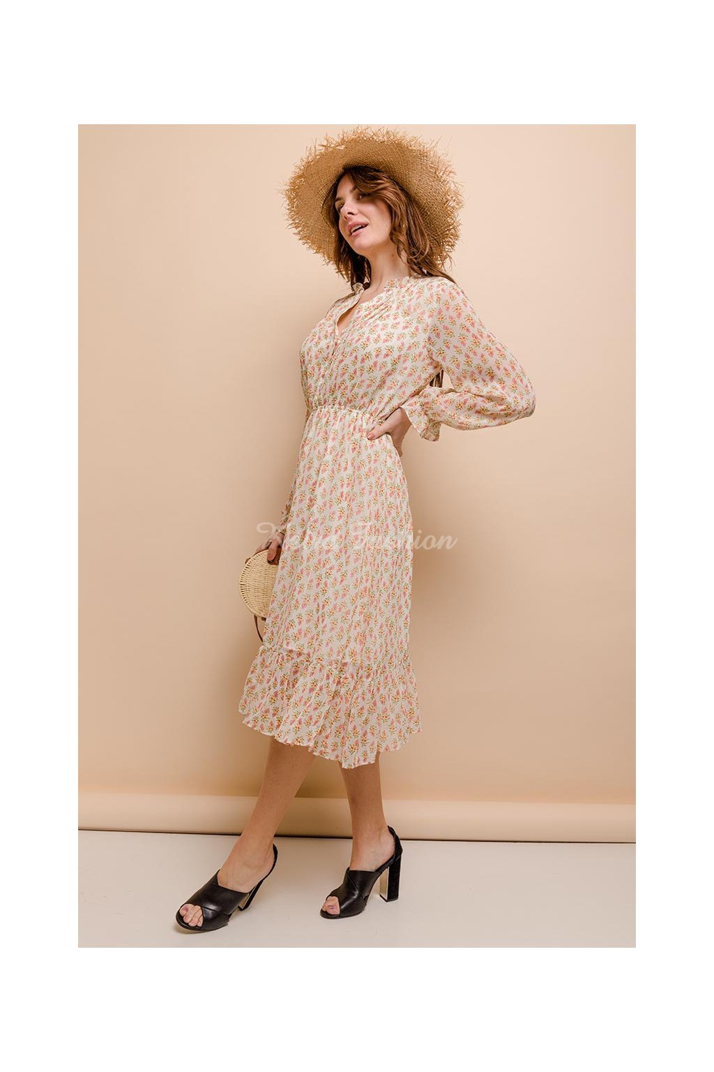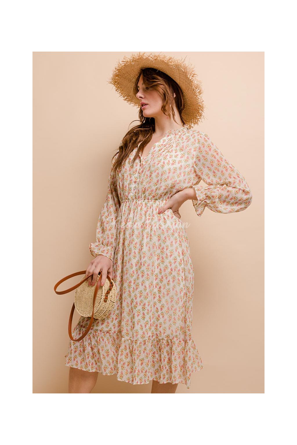 Tieto romantické kvetované midi šaty sú ideálnym kúskom do šatníka každej ženy, ktorá miluje jemnosť, eleganciu a vintage nádych. Šaty majú jemný kvietkovaný vzor s drobnými červenými kvetmi a zelenými lístkami, ktorý pôsobí sviežo a žensky. Strih je voľnejší s elastickým pásom, ktorý krásne zvýrazní pás. Dlhé rukávy sú zakončené jemným nariasením a gumou, čo dodáva šatám ľahkosť. Spodná časť šiat je zdobená volánom, ktorý sa pohybuje s každým krokom a pôsobí veľmi žensky. Šaty sú podšité v celej dĺžke okrem rukávov, čo zaručuje nepriehľadnosť, zatiaľ čo priesvitné rukávy im dodávajú ľahkosť a vzdušnosť. V prednej časti sú gombíky a decentný výstrih do V s malým volánikom okolo krku. Vďaka priedušnému a ľahkému materiálu sú tieto šaty skvelou voľbou na teplejšie dni, ale v kombinácii s členkovými topánkami a bundou ich využijete aj na jeseň.