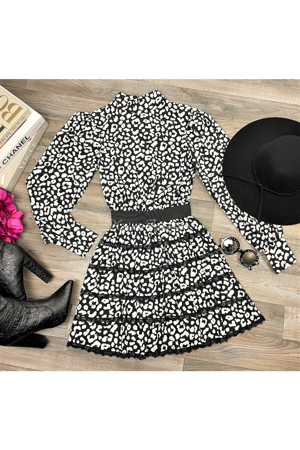 Objavte kombináciu elegancie, ženskosti a jemnej extravagancie s týmito čierno-bielymi šatami. Vďaka výraznému zvieraciemu vzoru v štýle leoparda a sofistikovaným čipkovaným detailom pôsobia šaty neprehliadnuteľne a štýlovo. Majú áčkový strih so sukňou do A, ktorá je bohato riasená do volánov s čipkovými pruhmi, čím vytvára romantický efekt. V páse je široká elastická guma, ktorá krásne zvýrazní siluetu. Vrchný diel má stojačikový golier, ktorý sa zapína vzadu na dva gombíky. Zadná časť zaujme výrazným výstrihom na chrbte s čipkovým lemovaním, ktorý kontrastuje s konzervatívnym predkom a dodáva šatám sexy nádych. Dlhé rukávy sú mierne nariasené a zakončené manžetami, ktoré sa zapínajú na gombíky. Materiál je ľahký, takže sa v ňom budete cítiť komfortne počas celého dňa aj večera.
