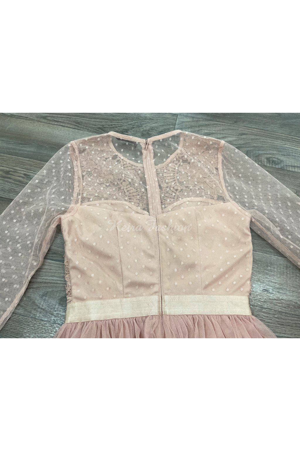 Nádherné elegantné šaty s tylovou sukňou, horná časť je zdobená krajkou. Zapínanie je vzadu na skrytý zips a na gombík. Pás je mierne elastický.