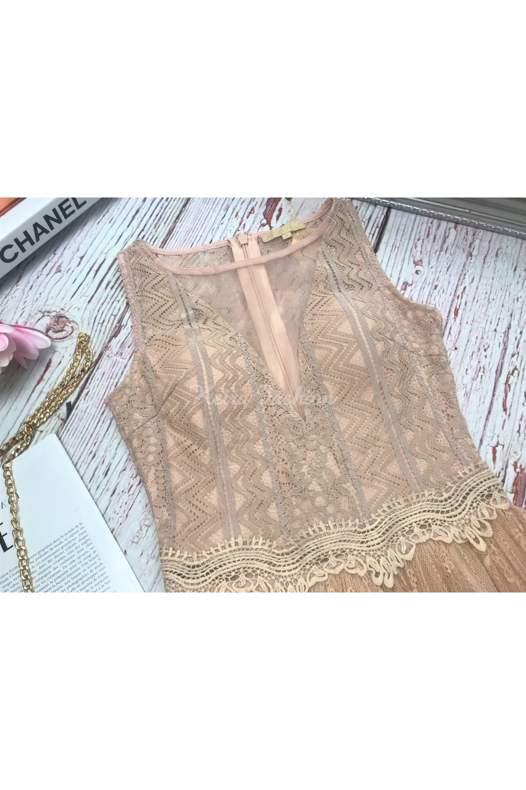 Tieto elegantné spoločenské šaty v telovej farbe s jemným púdrovým nádychom sú dokonalou kombináciou jemnosti, ženskosti a luxusného spracovania. Vrchná časť je bohato zdobená kombináciou rôznych čipkovaných vzorov. V oblasti dekoltu je jemná sieťovina v tvare V, ktorá pôsobí decentne a moderne. Šaty majú všité vypchávky, takže podprsenka nie je potrebná – zabezpečujú komfort a krásny tvar. Pás je zvýraznený vyšívanou krajkou, ktorá opticky zoštíhľuje postavu. Sukňa je vzdušná, s ľahkou čipkovanou sieťovinou a romantickým zakončením. Zapínanie je vzadu na skrytý zips, čo zachováva čistý a elegantný vzhľad chrbta. Materiál šiat nie je elastický, no má veľmi kvalitné a pevné spracovanie. Sú ideálne na svadbu, oslavu, stužkovú alebo inú výnimočnú príležitosť.
