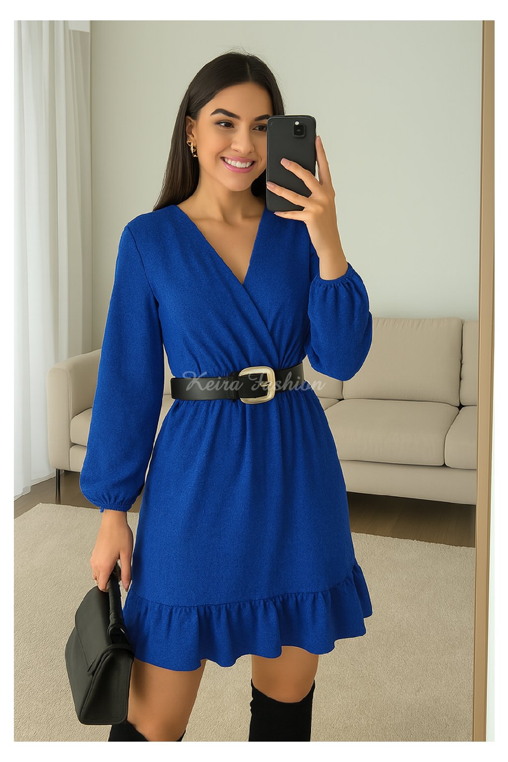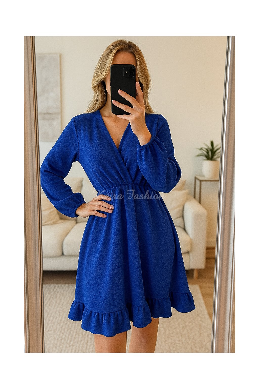 Dámske modré šaty z teplejšieho materiálu, v páse a na konci rukávov je gumička.