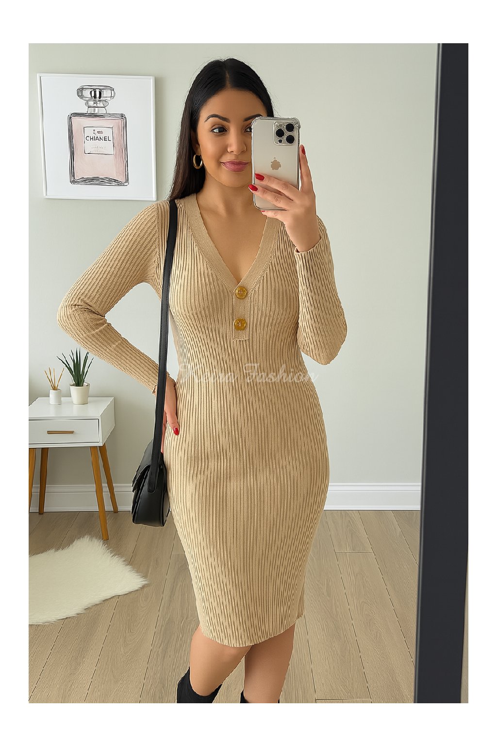 Béžové úpletové šaty sú dokonalou kombináciou pohodlia a štýlu. Vyrobené z kvalitného materiálu s obsahom bavlny, sú elastické a príjemne sa prispôsobia postave a zaručia komfort počas celého dňa. Šaty majú dlhý rukáv a funkčné gombíky vpredu. Rebrovaná štruktúra materiálu opticky predlžuje postavu a priliehavý strih zvýrazní ženské krivky. Ideálne na bežné nosenie, do práce aj na večerné stretnutia. Skombinujte ich s čižmami alebo elegantnými topánkami a vytvorte si univerzálny outfit, ktorý nikdy nesklame.