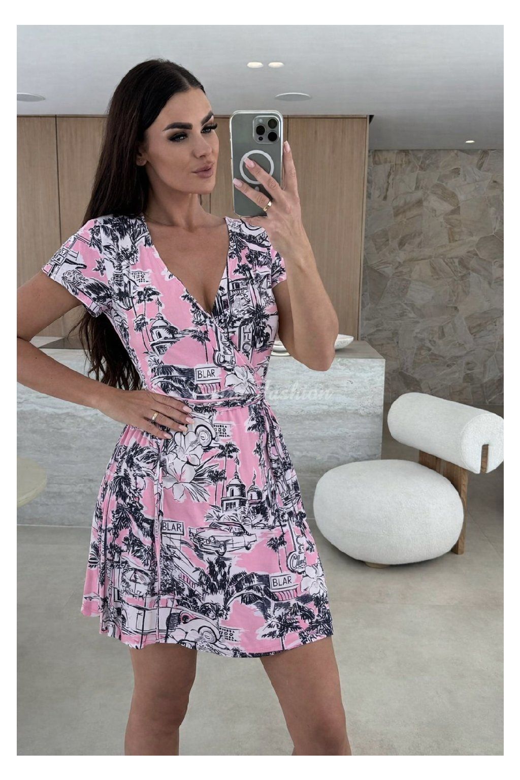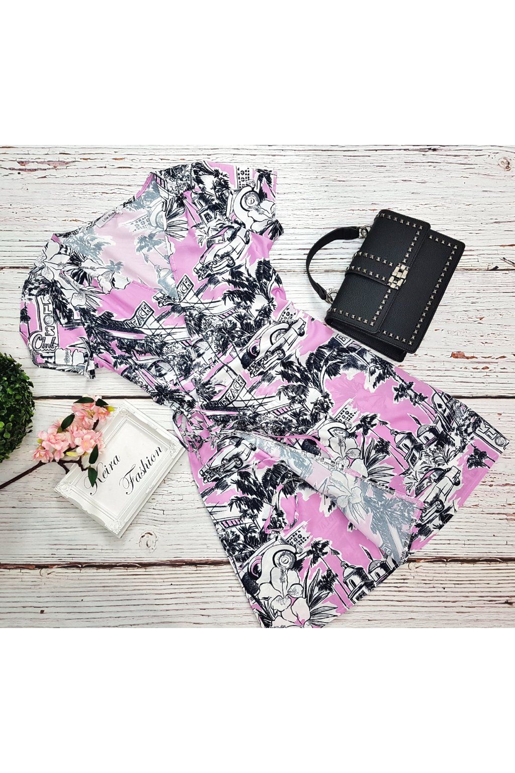 Zavinovacie šaty s tropickým ilustratívnym vzorom prinášajú sviežu dovolenkovú atmosféru v modernom, kreslenom štýle. Originálna tropická grafická potlač s palmami, autami, nápismi a mestskými scenériami vytvára výrazný, hravý look, ktorý okamžite upúta. Zavinovací strih krásne formuje postavu, prekladaný výstrih zvýrazní dekolt a ľahký materiál zabezpečí celodenné pohodlie. Ideálne na leto, dovolenku aj bežné nosenie — stačí doplniť sandále alebo kabelku a outfit je hotový.
