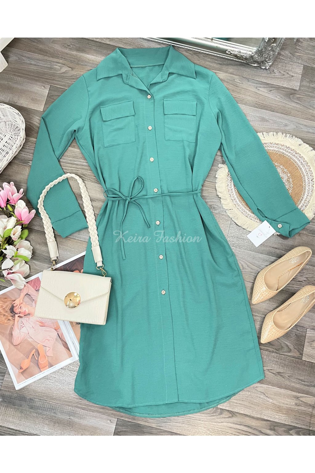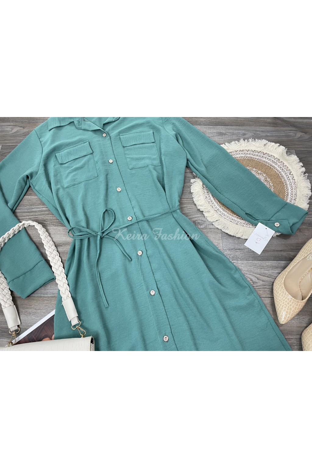 Zelené košeľové šaty s opaskom a dlhým rukávom sú ideálnou voľbou pre každodenné nosenie aj pracovné príležitosti. Vďaka košeľovému strihu a zapínaniu na gombíky po celej dĺžke pôsobia štýlovo a upravene. Dve náprsné vrecká dodávajú šatám ležérny vzhľad, zatiaľ čo opasok v rovnakom odtieni umožňuje zvýrazniť pás a prispôsobiť strih postave. Príjemný, ľahký materiál zabezpečuje pohodlie počas celého dňa, čo oceníte nielen v práci, ale aj pri voľnočasových aktivitách. Zelená farba je moderná a ľahko kombinovateľná – perfektne ladí s neutrálnymi doplnkami ako béžové lodičky alebo svetlá kabelka. Tieto šaty sú skvelou voľbou na jar, jeseň alebo chladnejšie letné dni. Vďaka svojmu univerzálnemu dizajnu sa hodia do kancelárie, na stretnutia, aj na bežné nosenie.