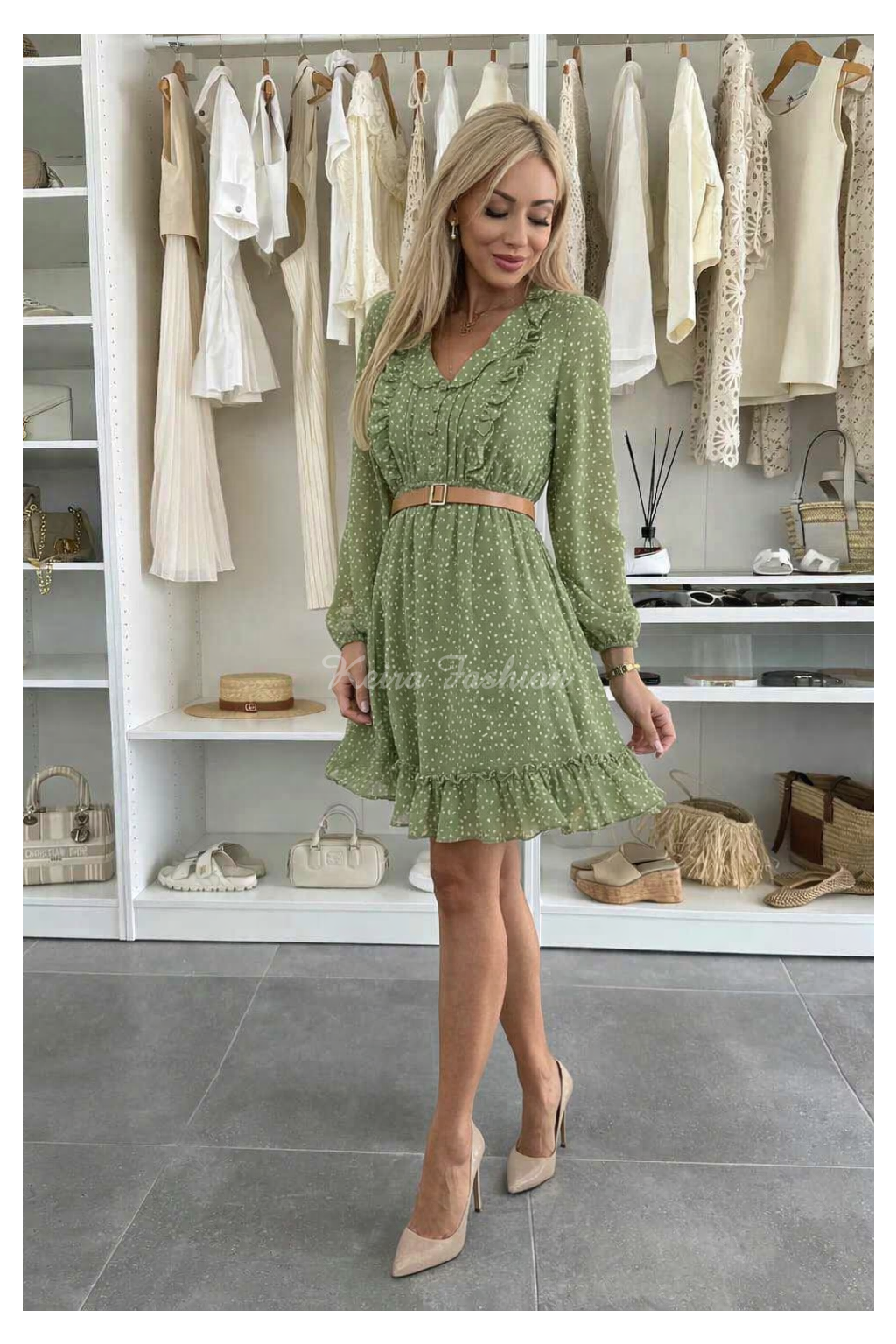 Dámske zelené šaty s jemným vzorom a romantickými detailmi sú ideálnou voľbou na každodenné nosenie aj špeciálne príležitosti. Vyrobené z ľahkého a vzdušného materiálu, ktorý zaručuje komfort počas celého dňa. Model má zapínanie na gombíky v prednej časti po pás. Volánové detaily okolo výstrihu a na spodnom leme pôsobia jemne a romanticky. Guma v páse zabezpečuje pohodlné prispôsobenie sa postave, pričom súčasťou šiat je aj hnedý koženkový opasok, ktorý zvýrazní pás a doplní celkový vzhľad. Šaty sú plne podšité (okrem rukávov), takže sa nemusíš báť ich priesvitnosti. Dlhé rukávy sú jemne priesvitné, zakončené gumičkou, čo vytvára ľahký a ženský efekt.