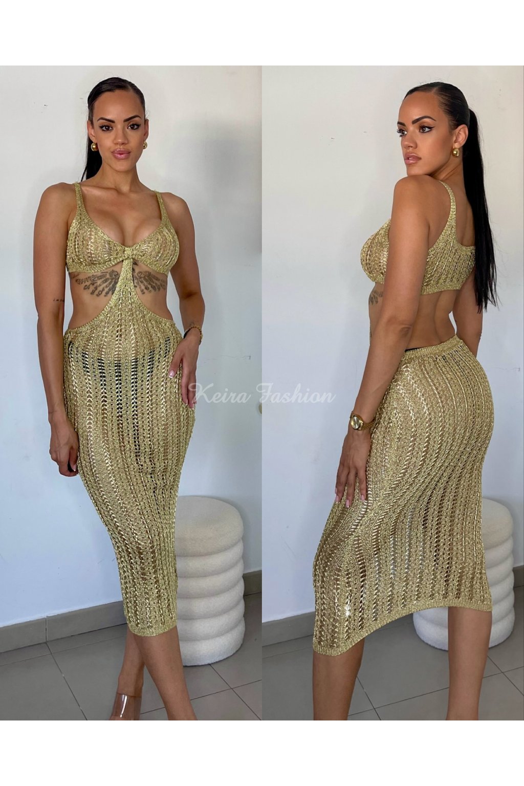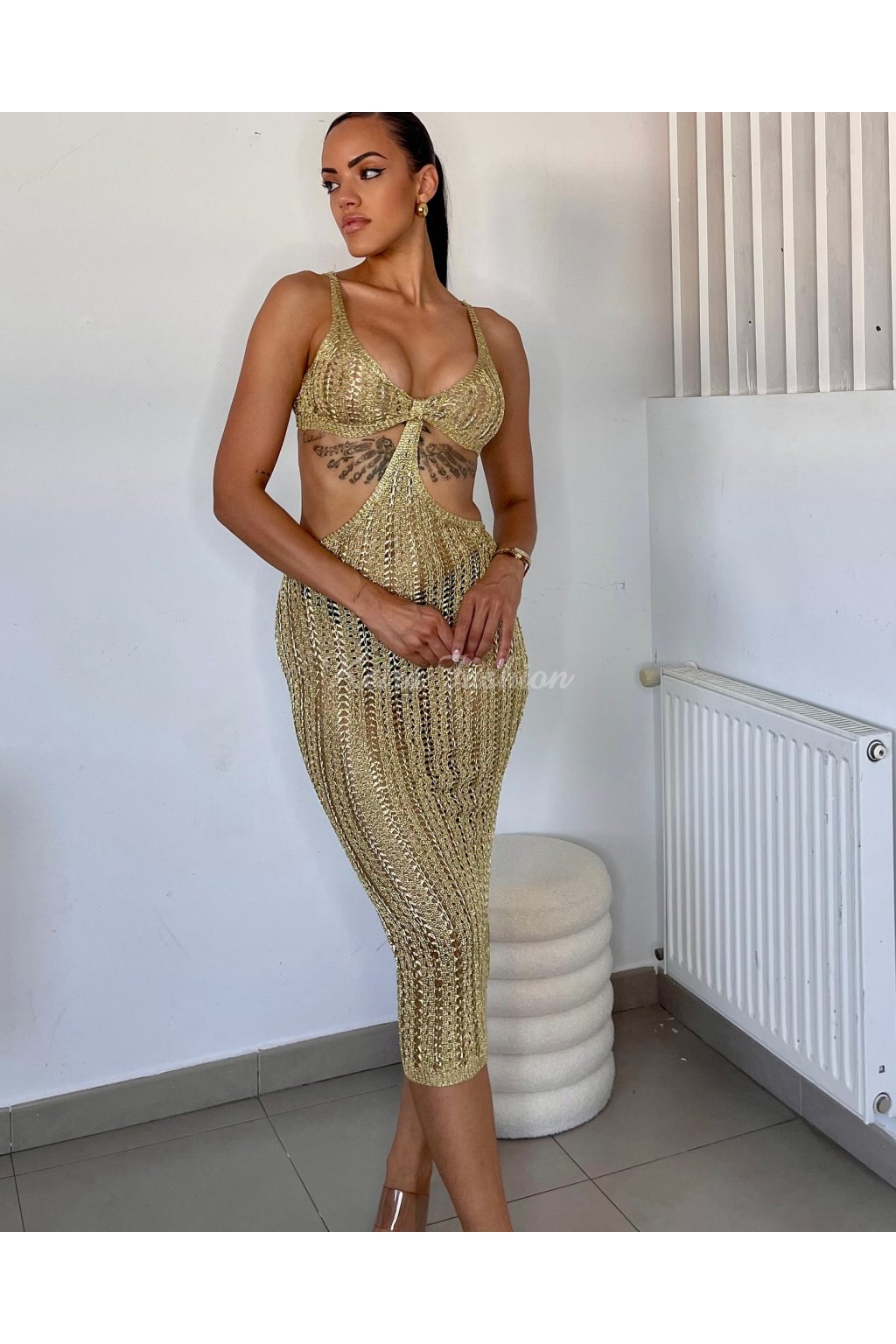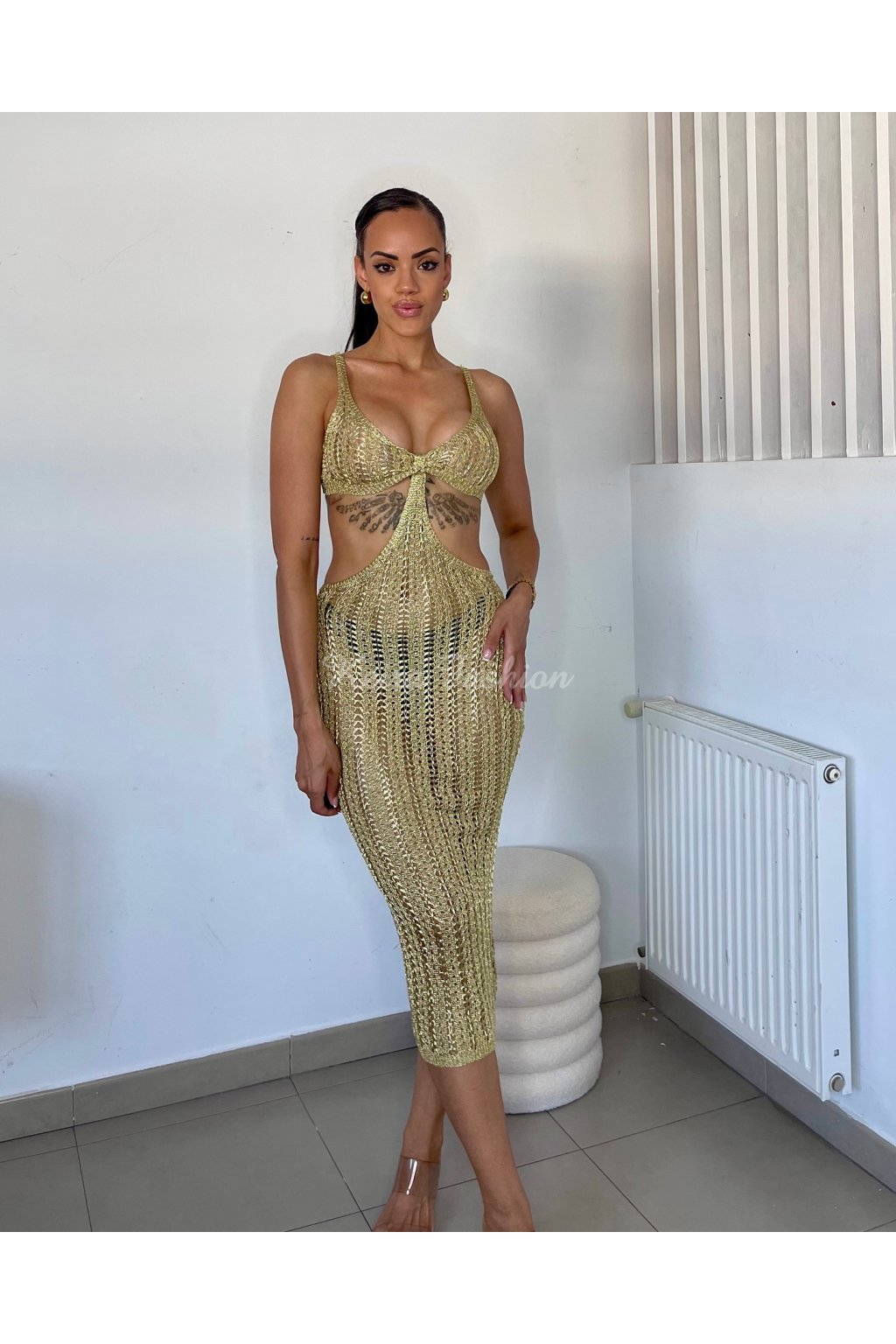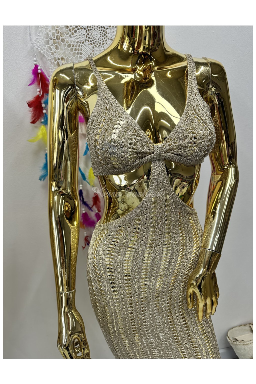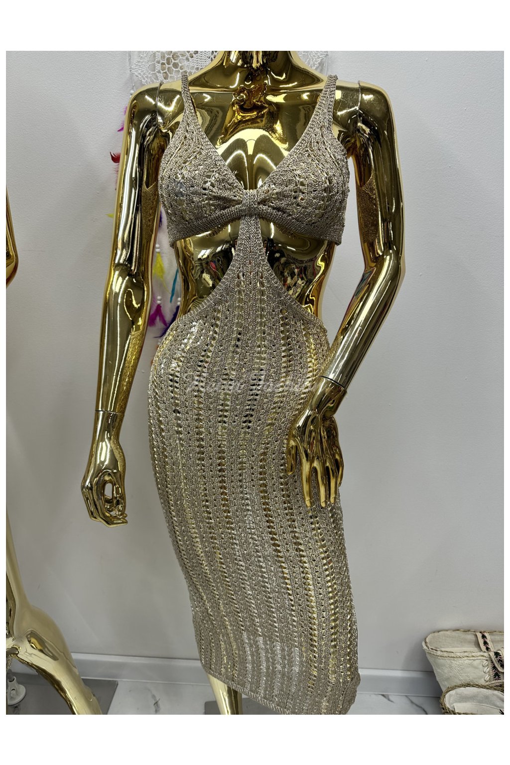 Zlaté háčkované šaty s výrezmi