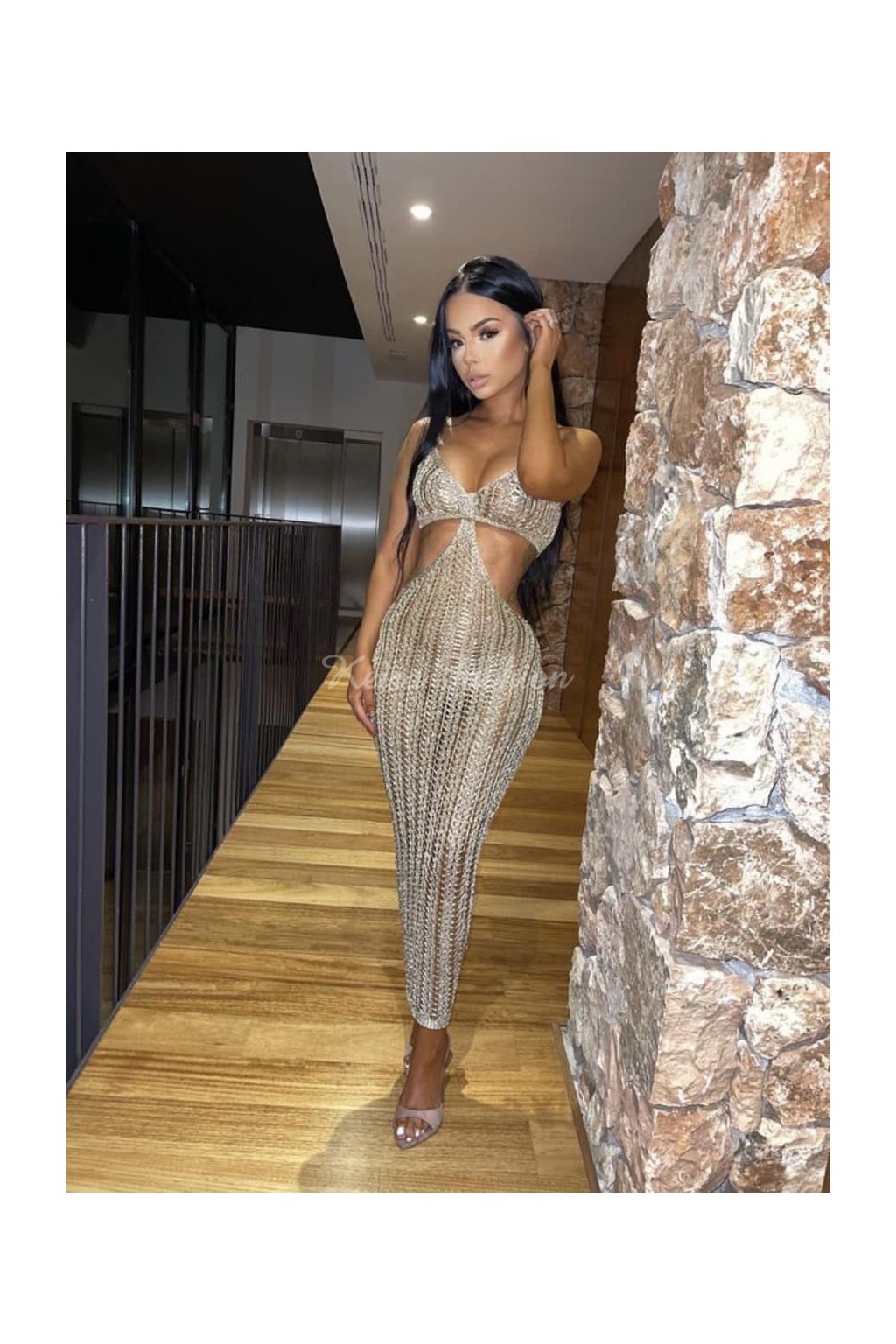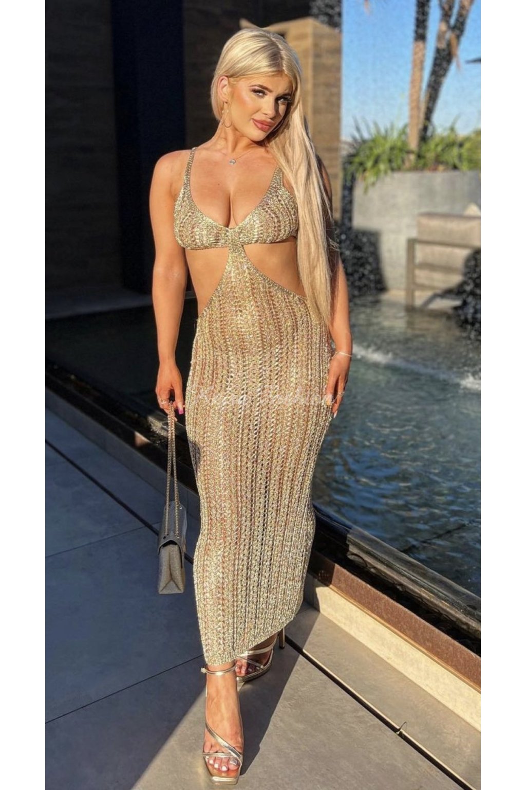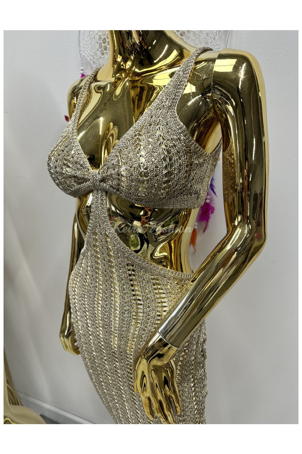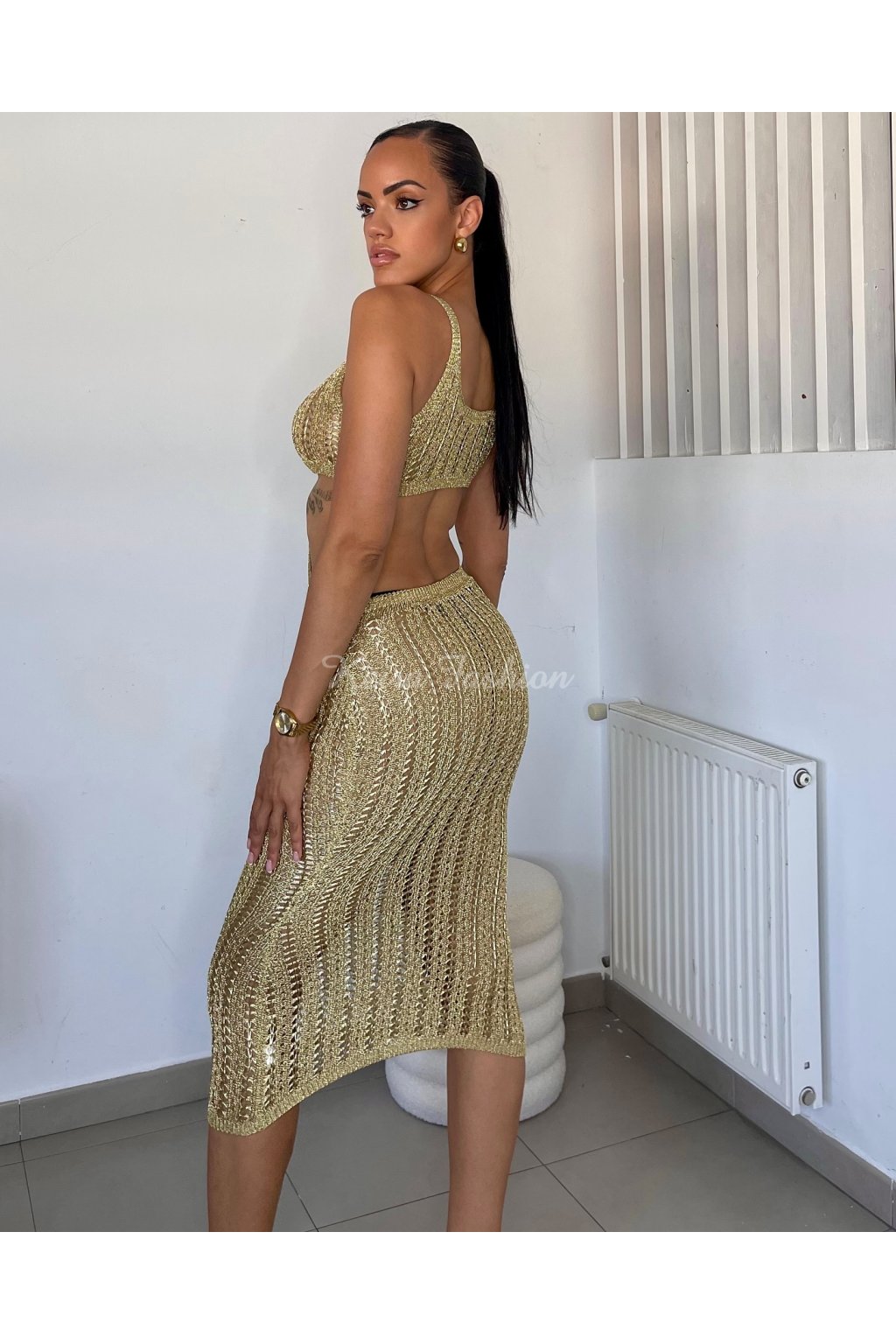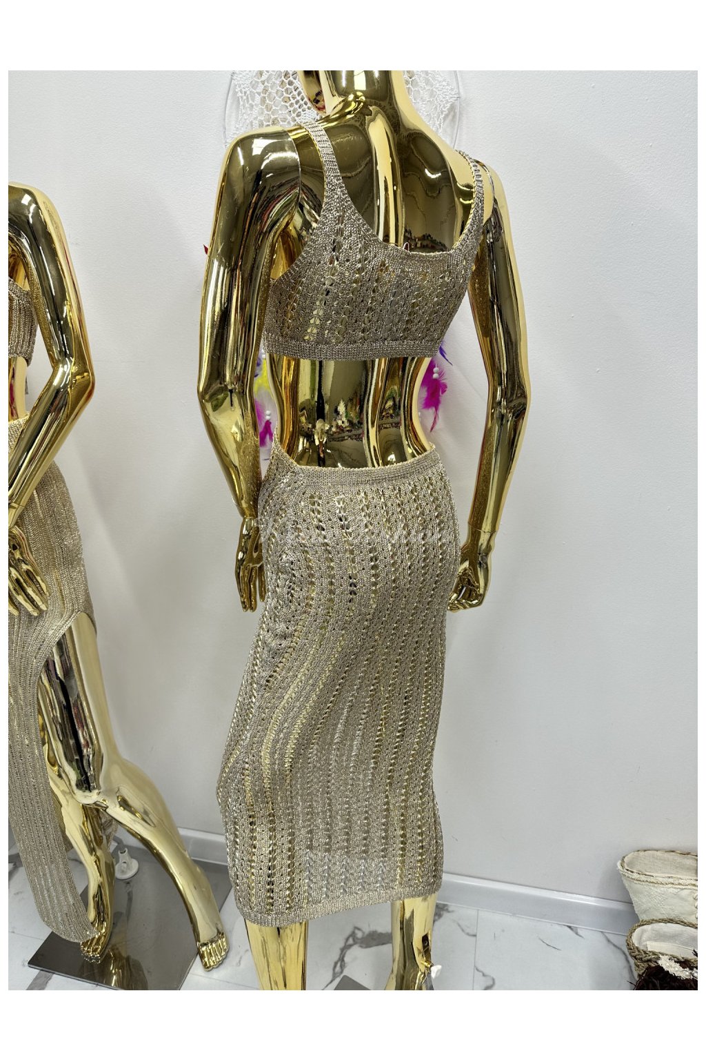 Zlaté háčkované šaty s výrezmi