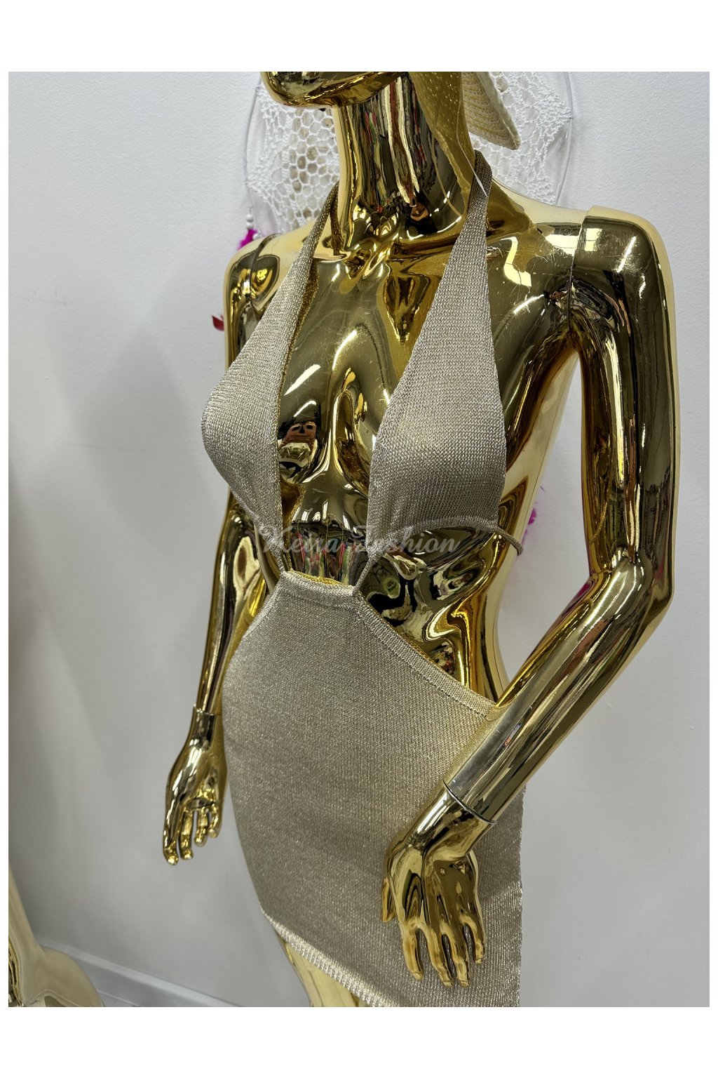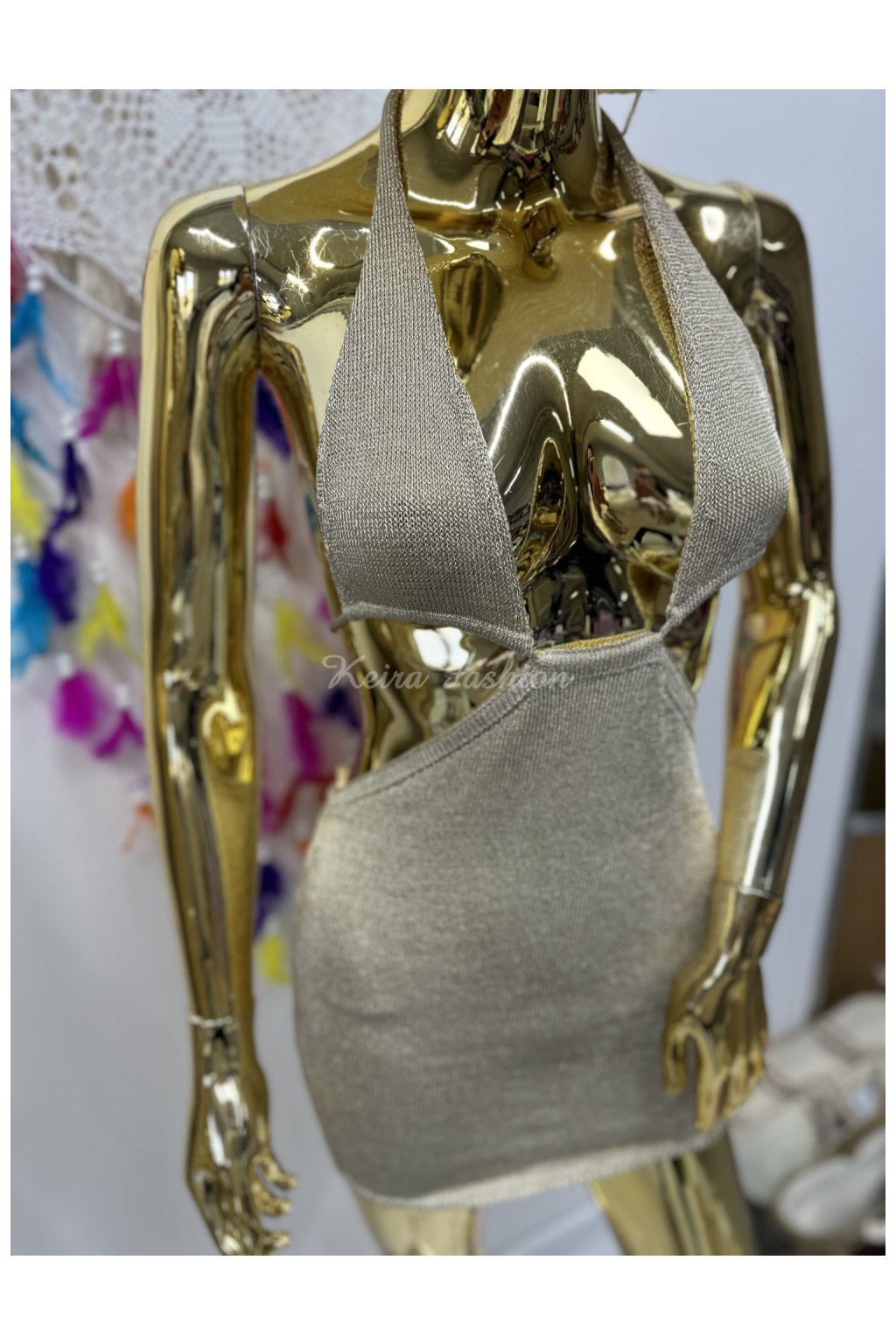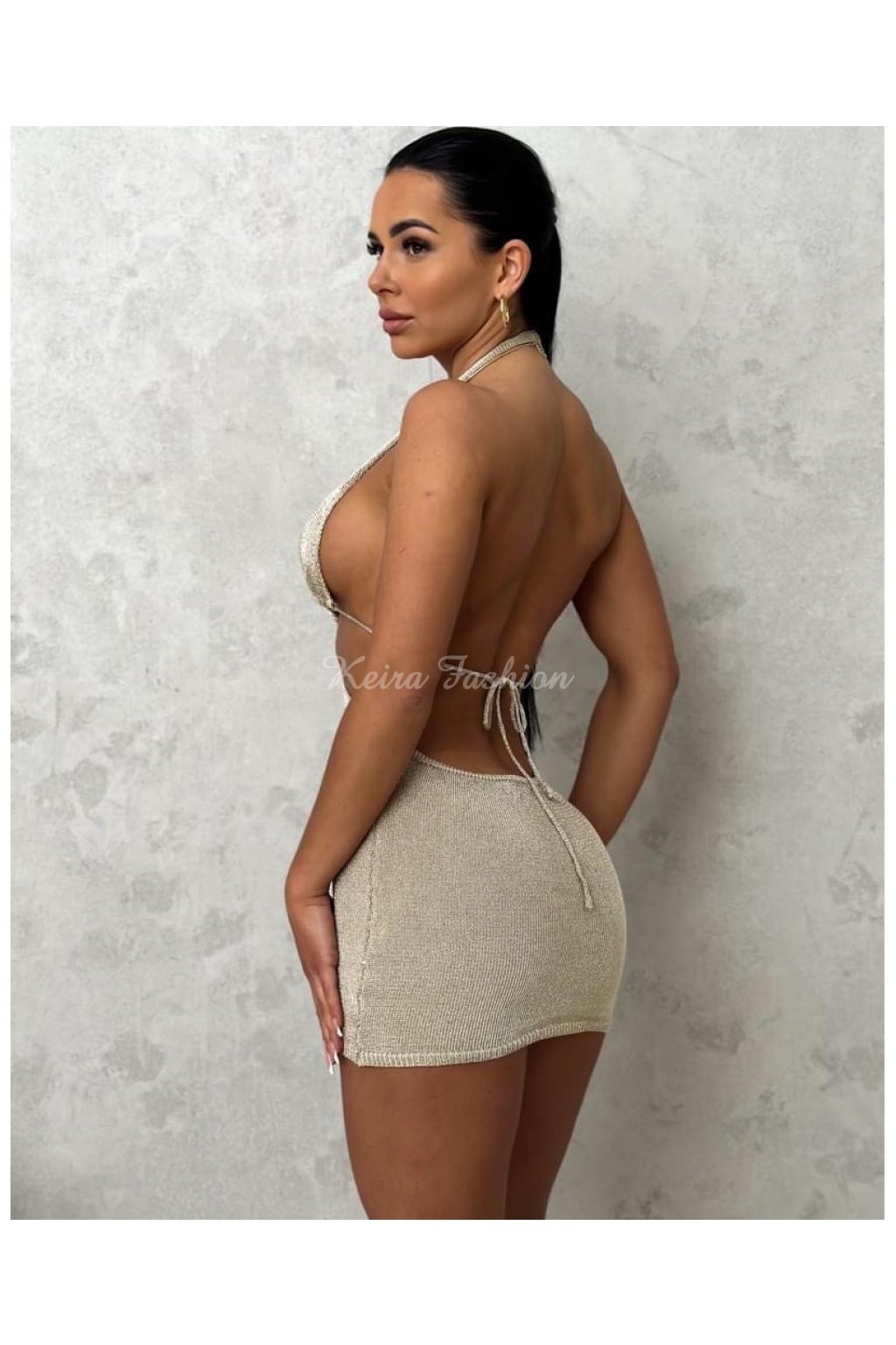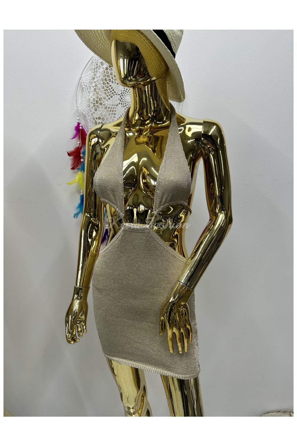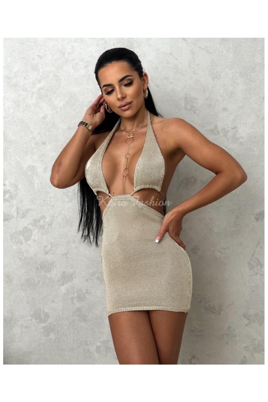 Zabudni na kompromisy – tieto zlaté úpletové šaty s metalickým efektom sú stelesnením sebavedomia, ženskosti a štýlu. Hlboký výstrih a rafinované výrezy v oblasti dekoltu a pásu dodajú outfitu odvážny nádych, zatiaľ čo odhalený chrbát s viazaním pôsobí zvodne a elegantne. Trblietavý úpletový materiál s vysokým podielom viskózy sa jemne leskne na svetle a nádherne vynikne na opálenej pokožke. Materiál je zároveň aj elastický a pohodlne prispôsobí postave. Ideálne na letné párty, dovolenkové večery, festivaly či špeciálne príležitosti, kde chceš zažiariť. Šaty sú v univerzálnej veľkosti a odporúčame ich pre postavy typu XS, S a M.