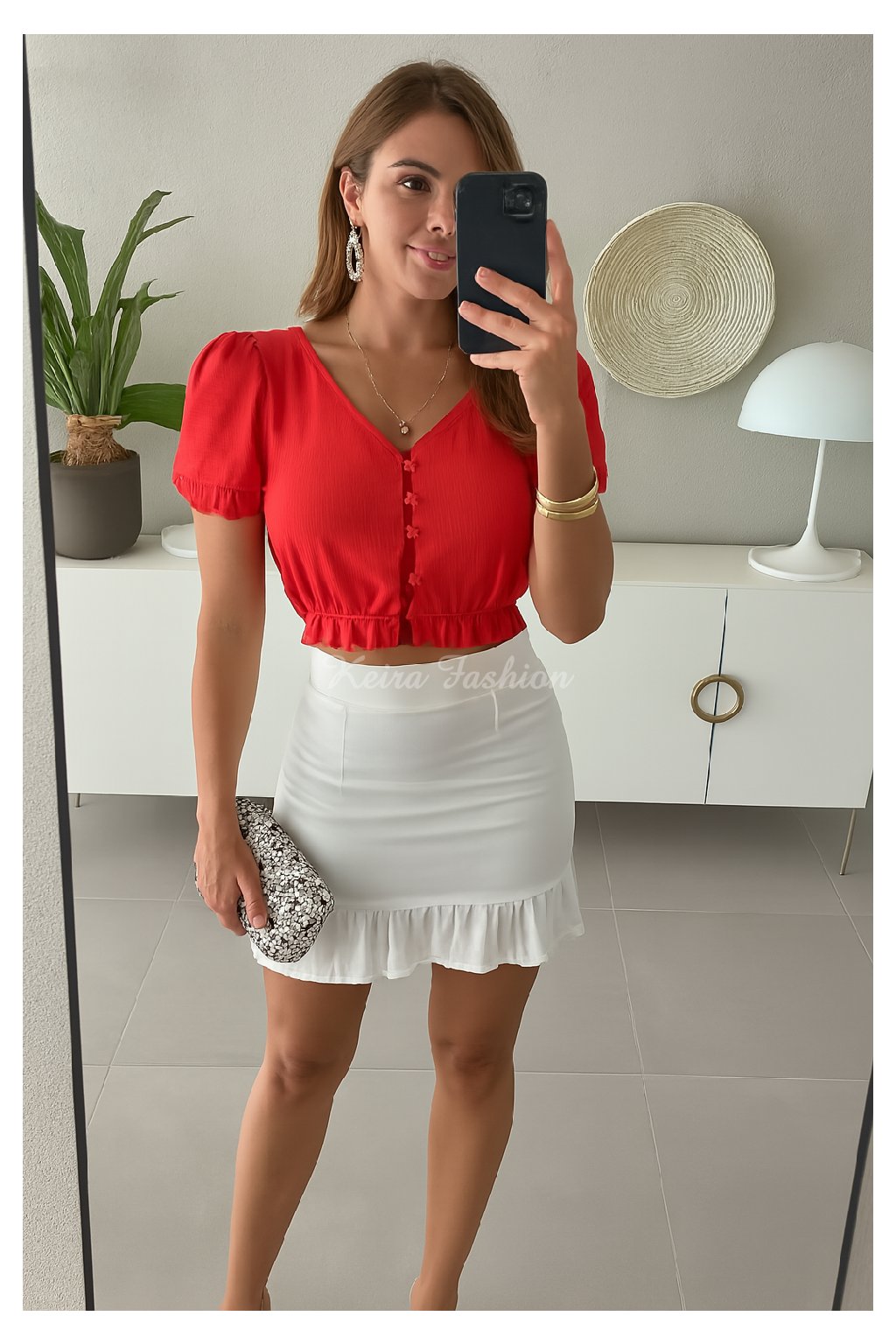 Biela dámska mini sukňa z kvalitnej 100 % bavlny je ideálnym kúskom na leto či jar. Je ľahká, vzdušná a vďaka svojmu strihu krásne zvýrazní postavu. Dolné volániky dodávajú sukni jemný a ženský vzhľad. Sukňa má skrytý zips vzadu pre elegantný a čistý vzhľad. Je podšitá, čo zaručuje komfort, ale odporúčame ju kombinovať s bielym alebo telovým spodným prádlom, keďže je to úzký strih. Materiál nie je elastický, preto odporúčame skontrolovať veľkostnú tabuľku pred kúpou.