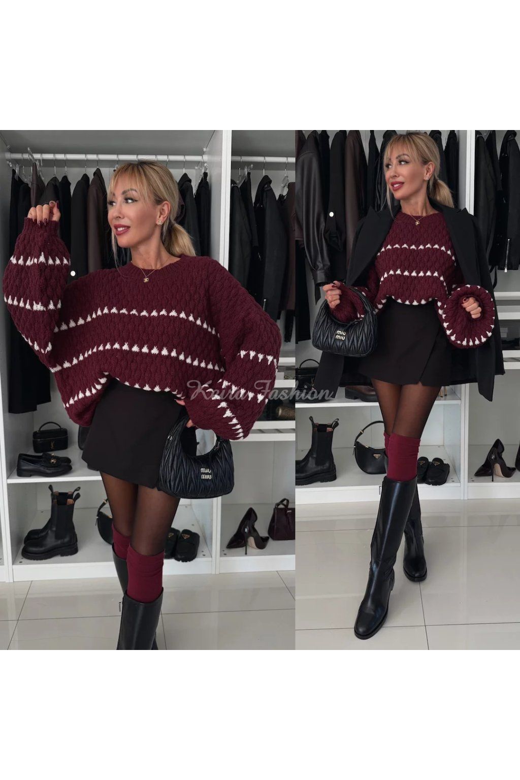 Tento pletený pulóver v burgundy odtieni je ideálnym kúskom na jesenné a zimné obdobie. Mäkká, príjemná pletenina s výraznou textúrou a bielym geometrickým vzorom pôsobí štýlovo a zároveň hrejivo. Oversize strih dodáva ležérny, uvoľnený vzhľad, ktorý sa perfektne kombinuje s koženou sukňou, džínsami či elegantnými nohavicami. Ribované manžety, spodný lem a okrúhly výstrih zabezpečujú pekné držanie tvaru a komfort pri nosení. Model pochádza od francúzskej značky, ktorá je známa kvalitným spracovaním a nadčasovým dizajnom.