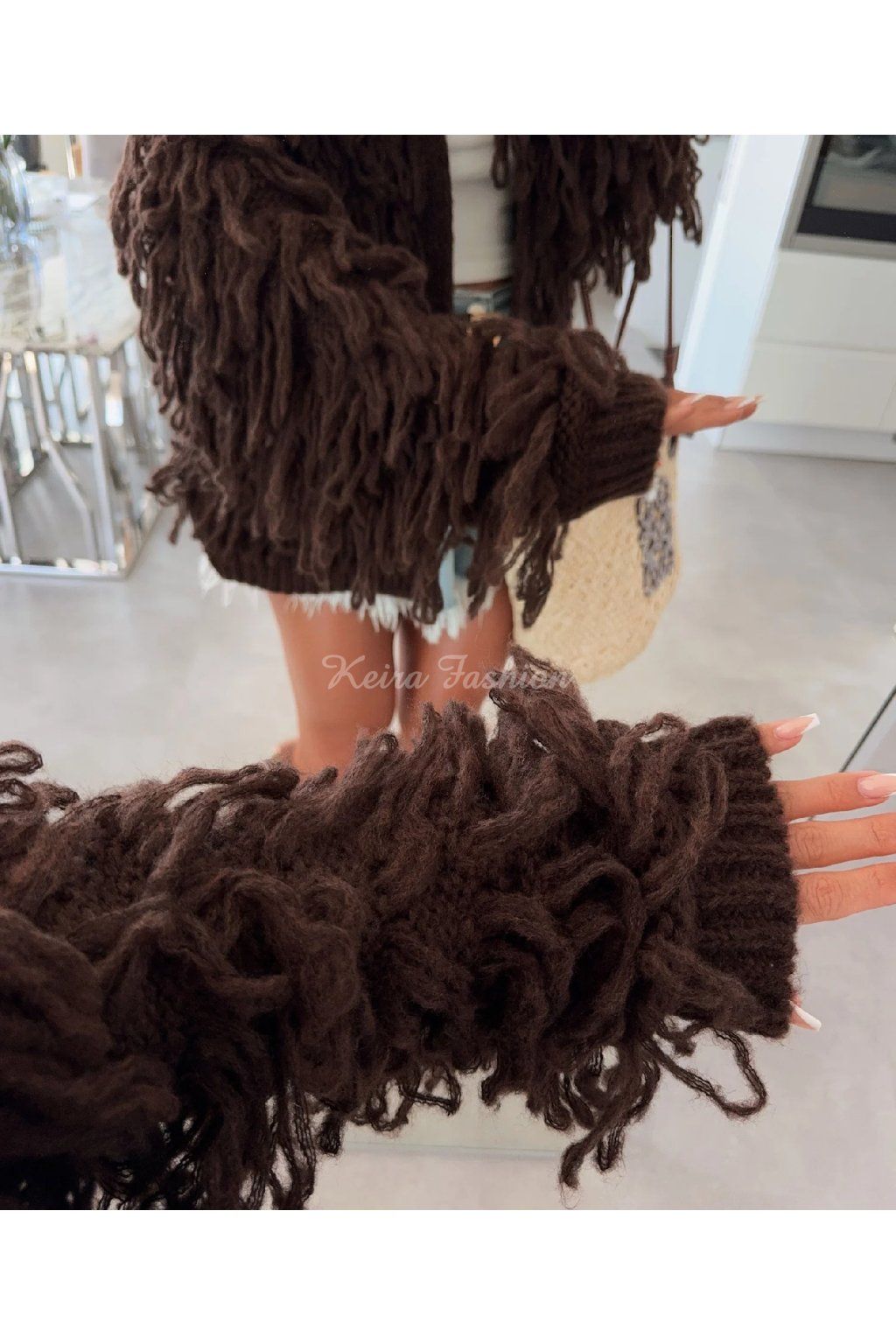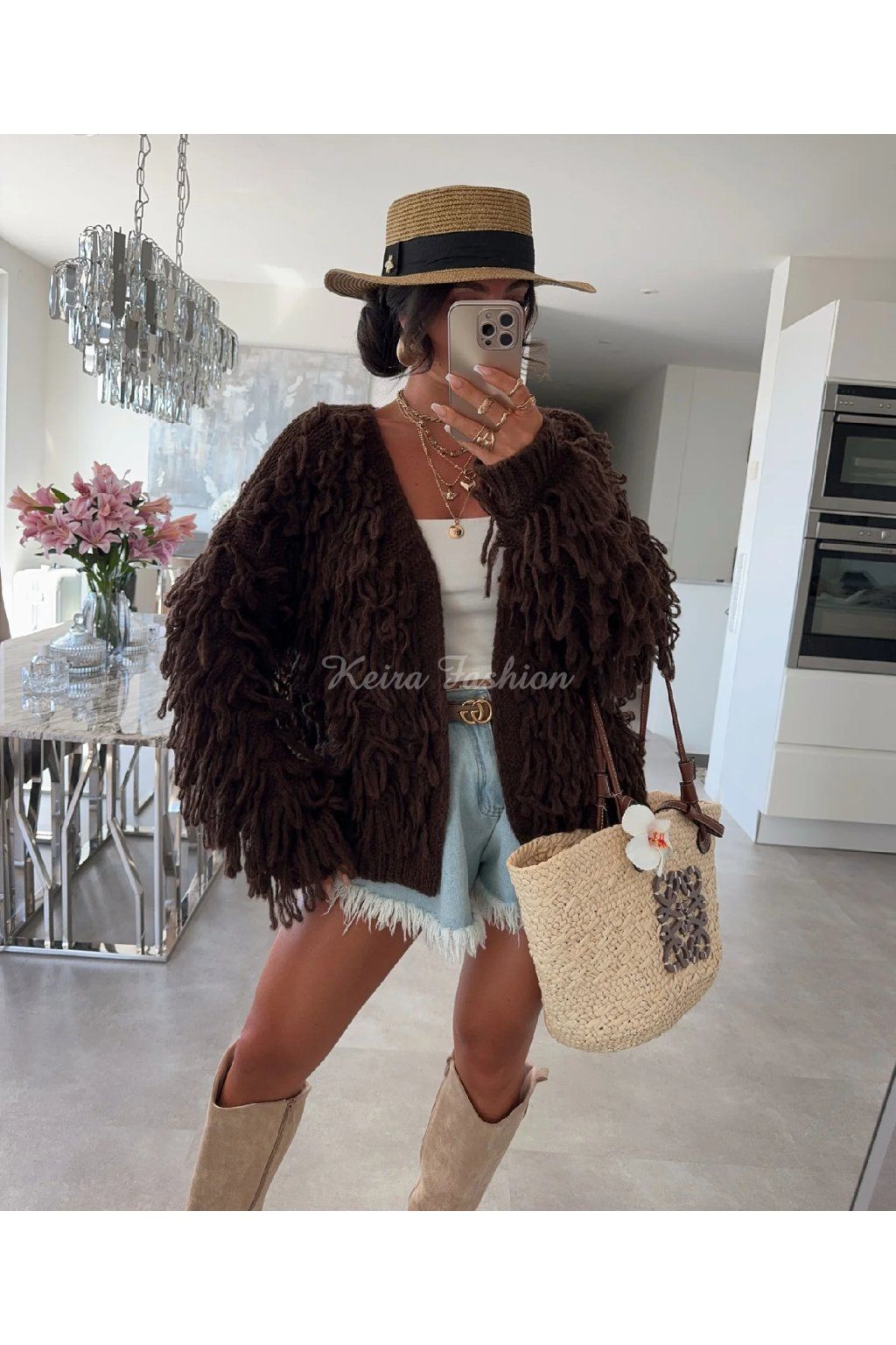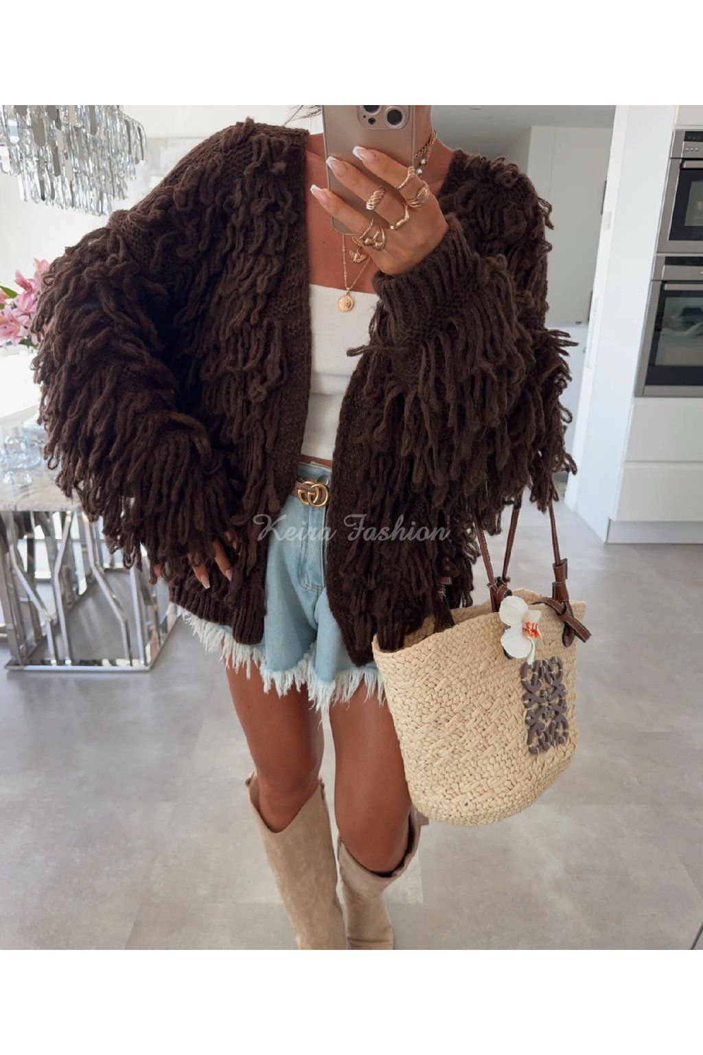 Tento tmavohnedý strapatý shaggy kardigán je presne ten kúsok, ktorý dodá každému outfitu štýl a jemne bohémsky nádych. Má mäkký, chlpatý povrch s kratšími vláknami, vďaka ktorému pôsobí zaujímavo už na prvý pohľad. Je to univerzálny, ľahko kombinovateľný kúsok, príjemný na nosenie a perfektne sa kombinuje s jednoduchými kúskami – tielkom, džínsami, šortkami či vysokými čižmami. Vytvorí krásny, ženský look bez námahy a hodí sa na jar, jeseň aj chladnejšie letné večery. Ak hľadáš niečo, čo je pohodlné, trendy a zároveň nadčasové, tento kardigán je presne pre teba.