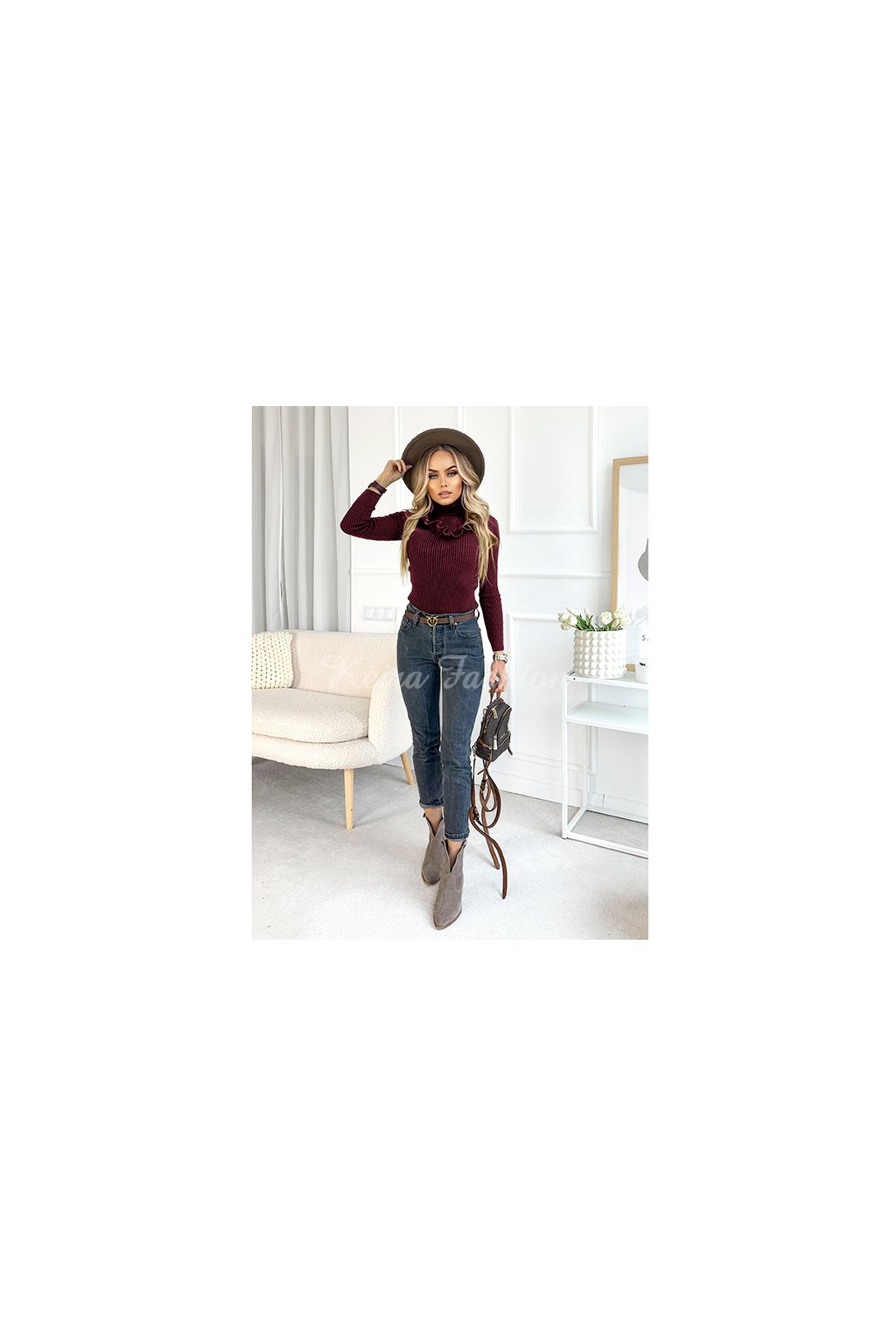 Tento bordový rolák je štýlový kúsok, ktorý dodá každému outfitu ženský akcent. Vyrobený z pružného rebrovaného materiálu, krásne obopne postavu a vďaka volánom na hrudi a ramenách pôsobí romanticky a originálne. Rolákový golier zahreje počas chladnejších dní, zatiaľ čo priliehavý strih zvýrazní siluetu. Vďaka elastickému materiálu odporúčame tento model pre veľkosti XS, S a M.