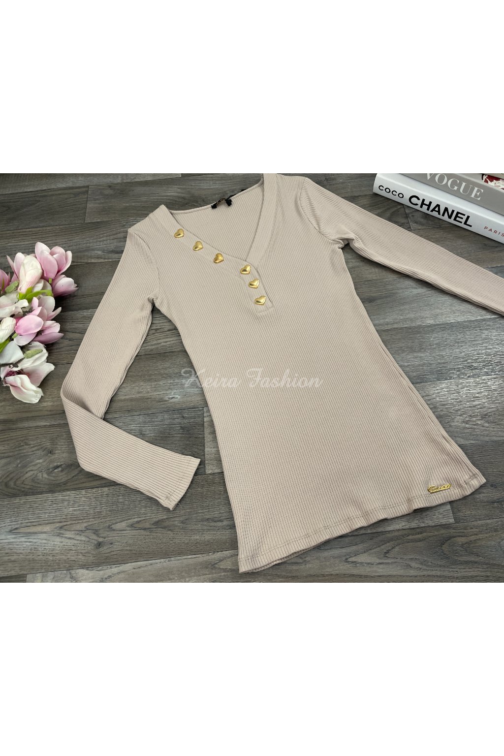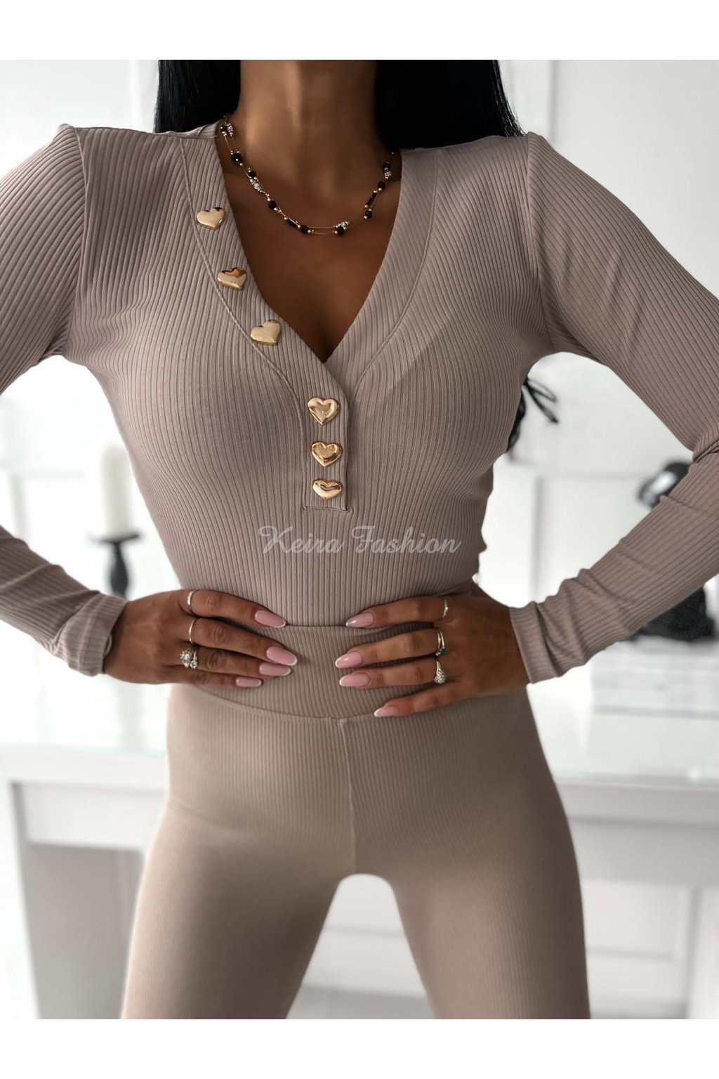 Objavte tento štýlový a mimoriadne pohodlný kúsok, ktorý si zamilujete hneď. Rebrované tričko v béžovej farbe je vyrobené z kvalitného, elastického materiálu s vysokým podielom bavlny a prídavkom lycry – čo zaručuje perfektné prispôsobenie postave, priedušnosť a maximálne pohodlie počas celého dňa. Zaujímavým prvkom sú zlaté srdiečkové gombíky, ktoré dodávajú tričku ženský a elegantný vzhľad. Tričko má výstrih do V, ktorý krásne zvýrazní dekolt. Ideálne k rifliam, sukni alebo legínam – či už do práce, na kávu s kamarátkou alebo voľný víkend.