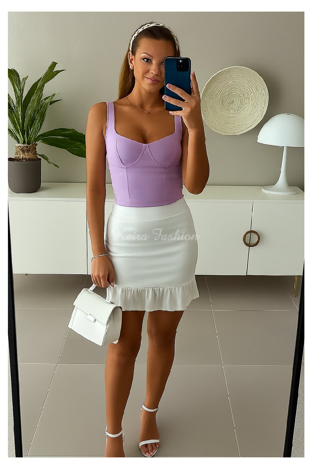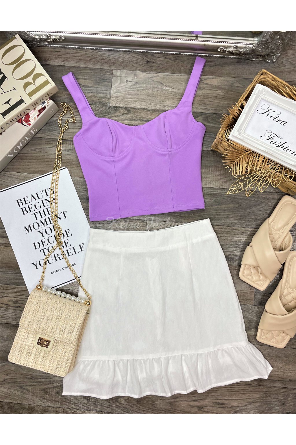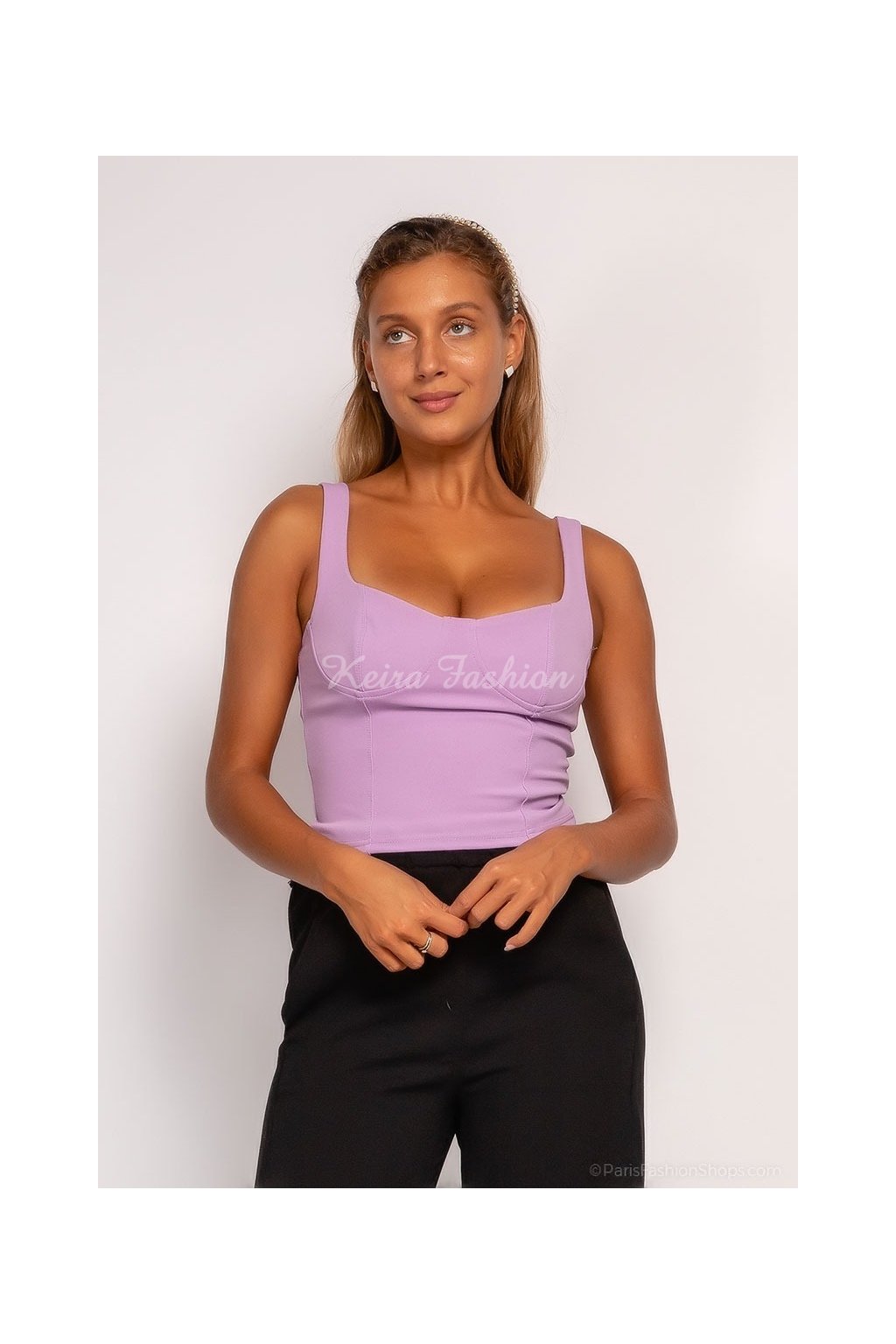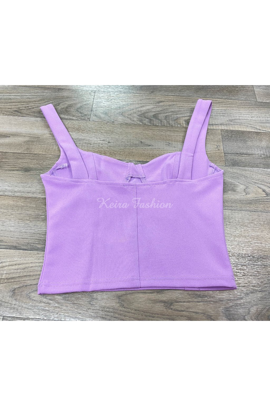 Tento štýlový dámsky crop top vo fialovej (levanduľovej) farbe je ideálny kúsok na teplé dni, letné večery aj voľnočasové outfity. Má širšie pohodlné ramienka a krásne tvarovaný výstrih, ktorý pôsobí jemne a žensky. Materiál je príjemný na dotyk a mierne elastický, vďaka čomu sa pekne prispôsobí postave. Top nie je vystužený, čo ocení každá žena, ktorá preferuje prirodzený vzhľad a komfort. Skvele sa kombinuje s rifľami, sukňou aj šortkami. Módny základ, ktorý využiješ počas celej sezóny.