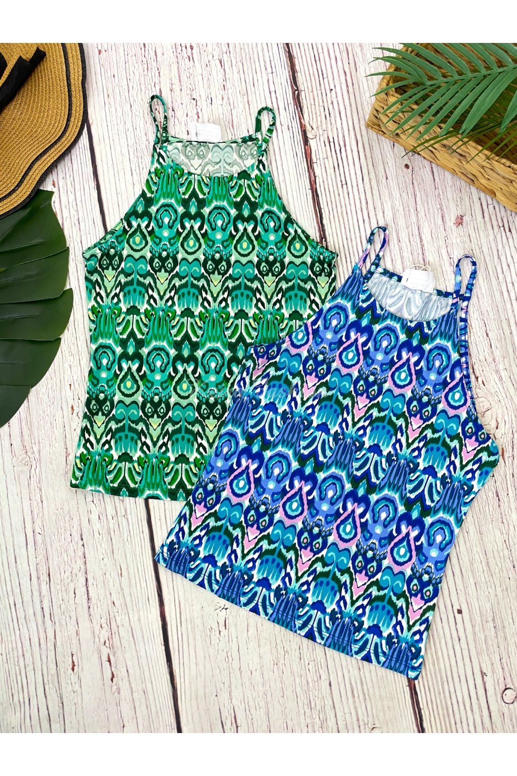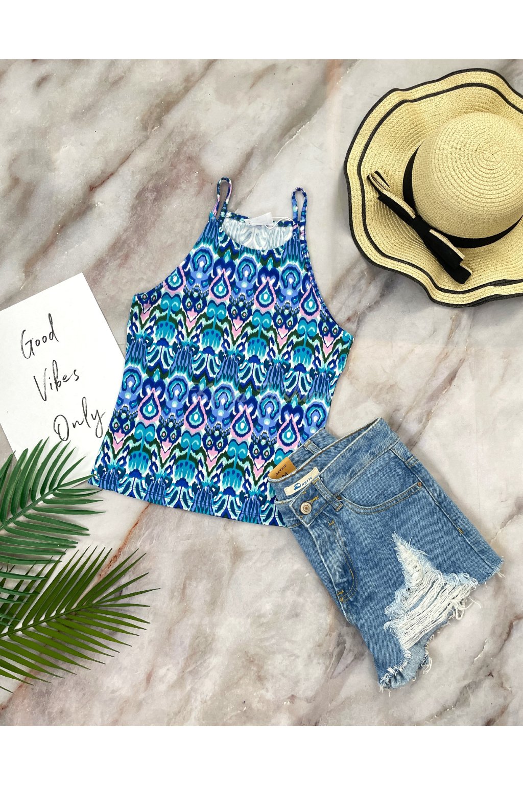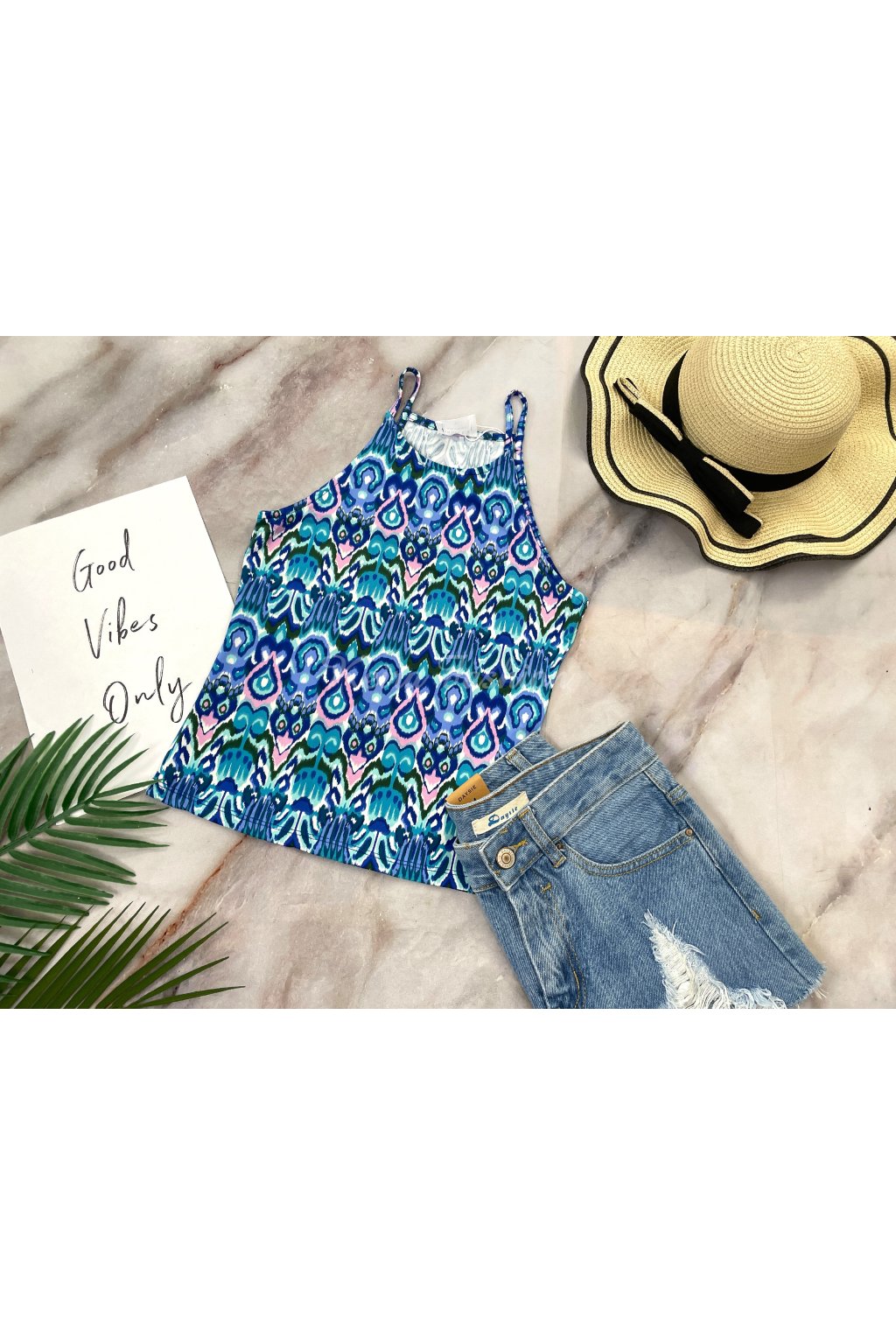 Oživte svoj letný šatník týmto sviežim vzorovaným topom na ramienka v modrej farbe, ktorá zaručene upúta pozornosť. Tento kúsok je vyrobený z veľmi elastického materiálu, ktorý sa dokonale prispôsobí postave a poskytne maximálne pohodlie. Ľahko sa kombinuje s nohavicami, sukňami aj šortkami. V ponuke máme aj zelenú farebnú variantu.