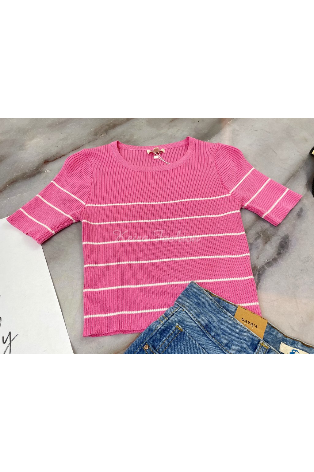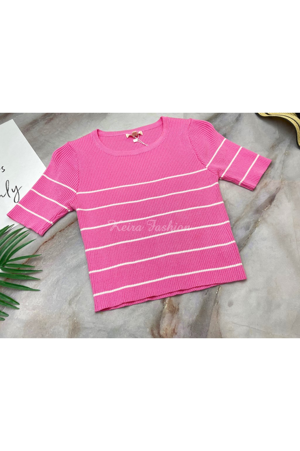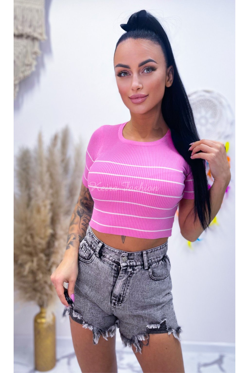 Úpletový pásikavý ružový crop top