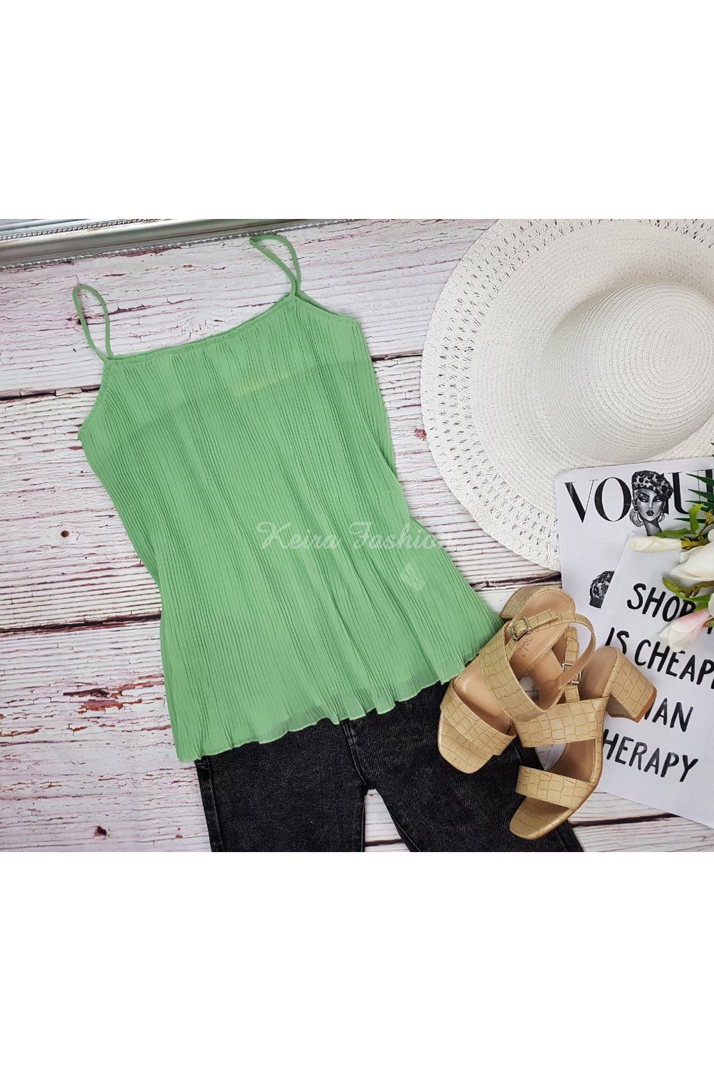 Táto dámska blúzka je vyrobená z ľahkého a vzdušného materiálu – šifónu, ktorý je príjemný na nosenie počas horúcich letných dní. Plisovaný dizajn dodáva blúzke elegantný a sofistikovaný vzhľad, zatiaľ čo jemné volány na spodnom okraji pridávajú ženský a hravý nádych. Blúzka má tenké, elastické ramienka, ktoré zabezpečujú pohodlné nosenie a zároveň pekne zvýraznia ramená. Strih blúzky je mierne voľný, čo zaručuje komfort a voľnosť pohybu. Jemná zelená farba blúzky je svieža, ideálna na jarné/letné obdobie, ktorá skvele oživí váš šatník a dodá vašim outfitom teplý a slnečný nádych. Perfektne sa hodí k džínsovým kraťasom, sukniam aj elegantným nohaviciam.