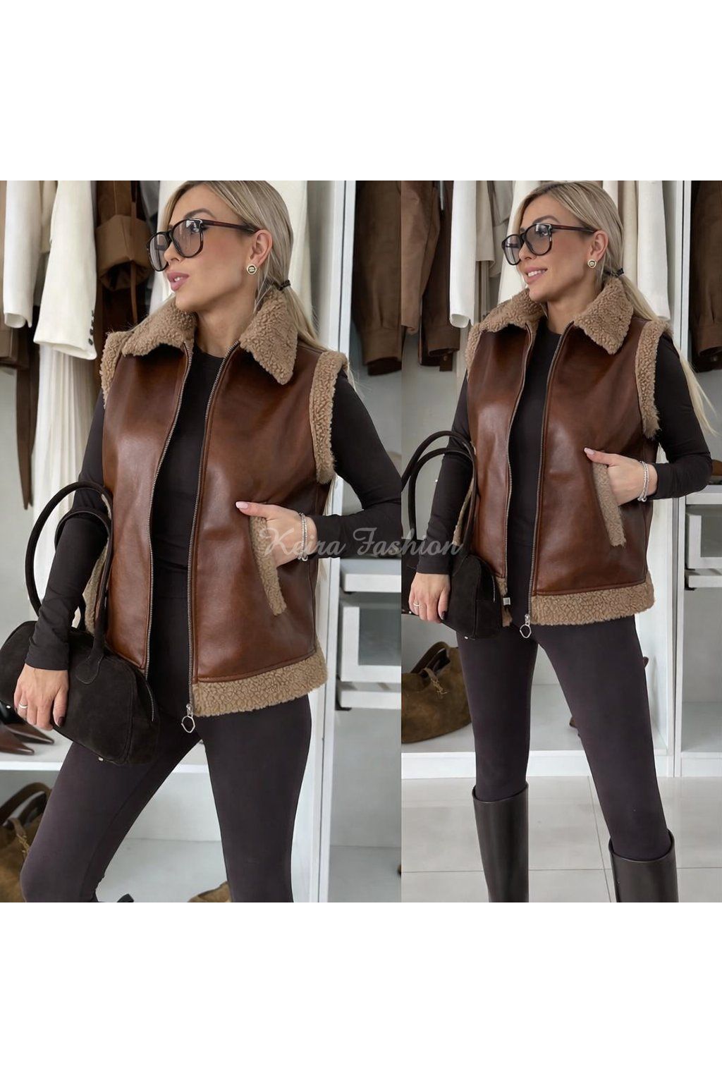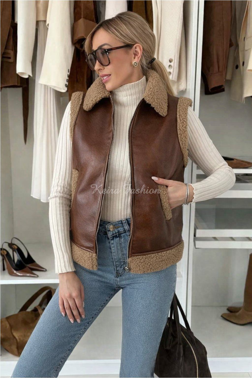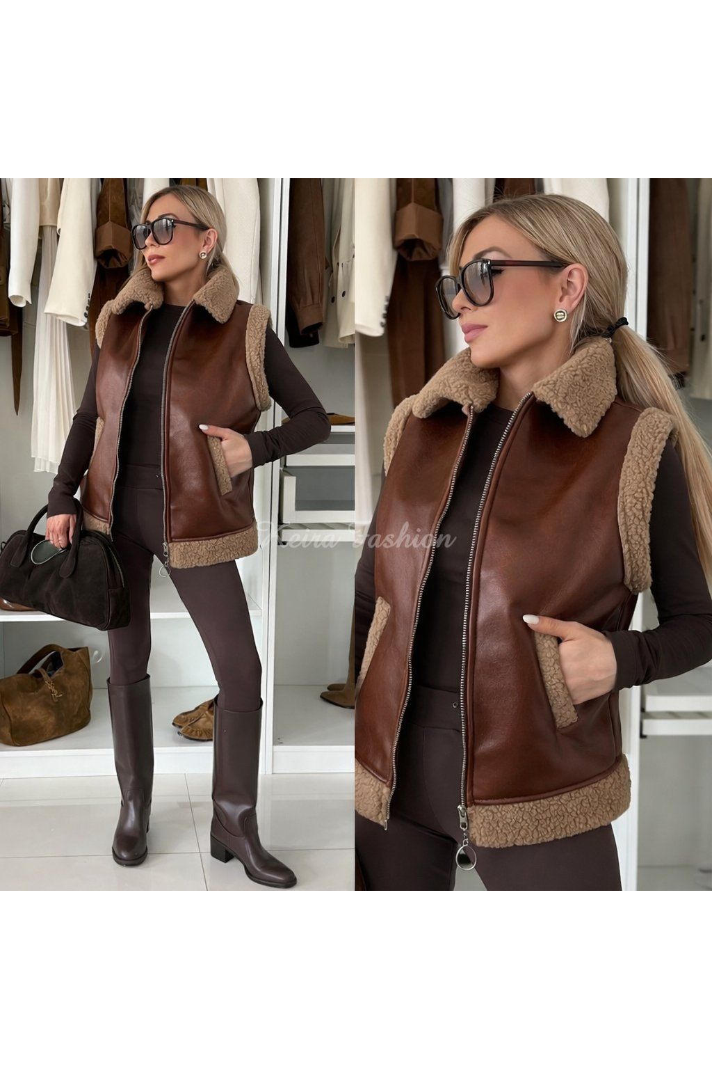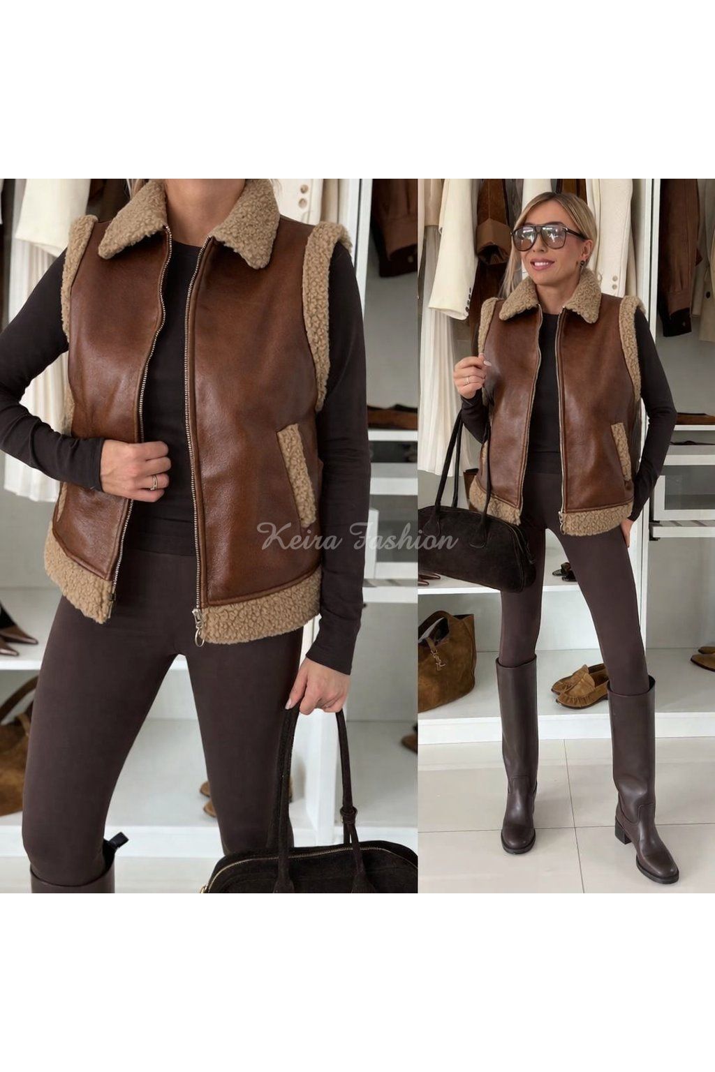 Vystúp z davu so štýlovou dámskou koženkovou vestou s kožušinou, ktorá spája eleganciu a pohodlie v jednom kúsku. Tento model v teplej hnedej farbe s jemnou shearling podšívkou je ideálnou voľbou na prechodné obdobie či vrstvenie počas zimy. Kvalitne spracovaný materiál s koženým vzhľadom zvršku a mäkkou teddy podšívkou ťa nielen zahreje, ale zároveň dodá tvojmu outfitu šmrnc. Vesta má pohodlný, rovný strih so zipsom a praktickými vreckami po bokoch. Vnútorný materiál je príjemný na nosenie a vytvára štýlový kontrast s lesklým vonkajším povrchom. Skvele sa kombinuje s rolákmi, svetrami či basic tričkami a džínsami.